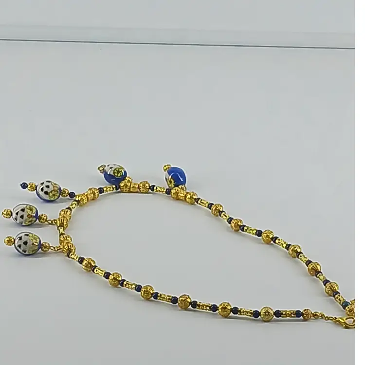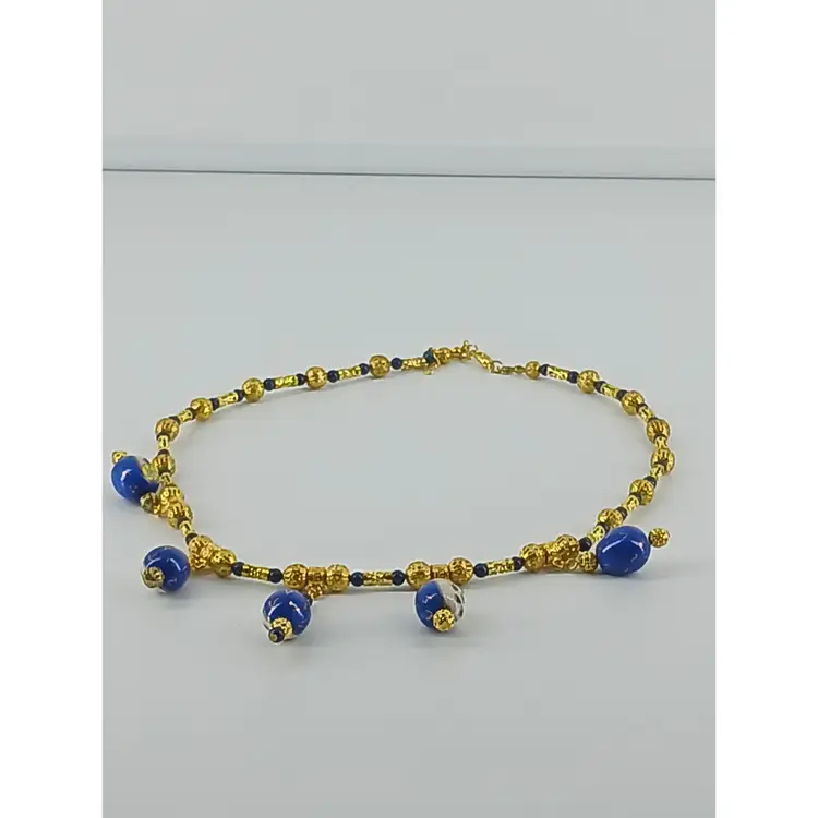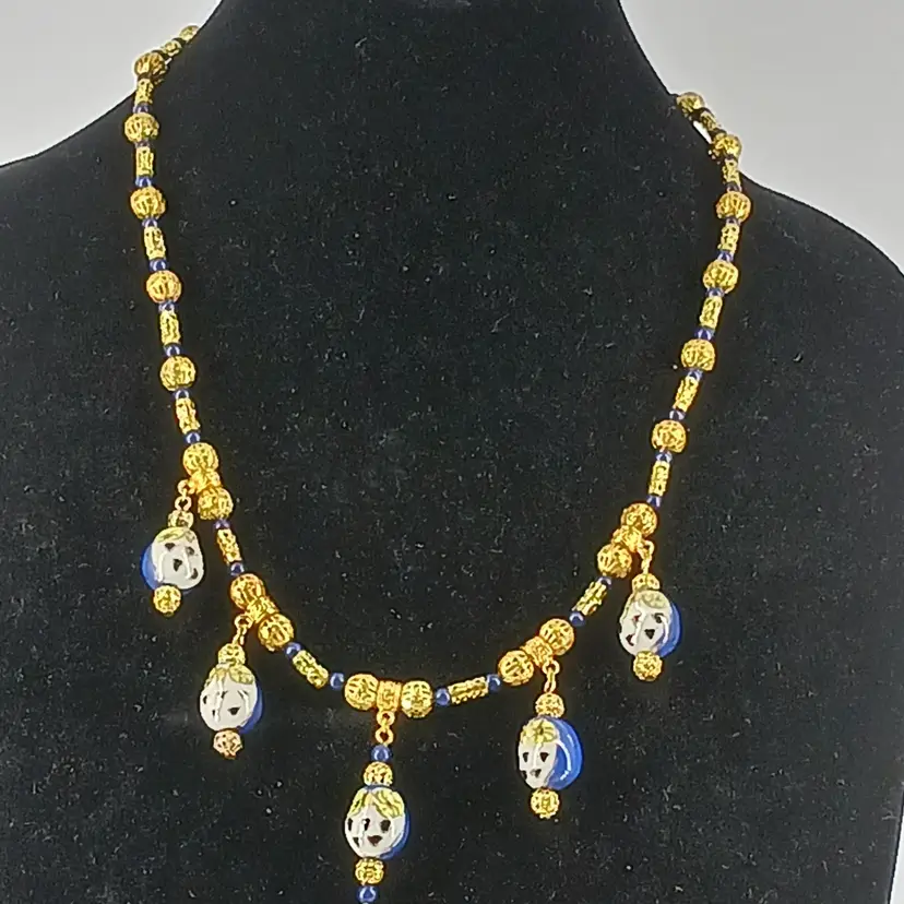 NM1349 – Five porcelain owls’ beads make a lovely dangle necklace. Four dangles of 1 ¼ x ½ inch porcelain blue/gold/black/white and yellow painted owls have two gold plated filigree beads and One 1 ½ x ½ inch dangle of same beads along with two blue lapis stone beads are suspended from a 21 inch stand of gold plated filigree beads, gold plated filigree tube beads, blue lapis stone beads to form this necklace.