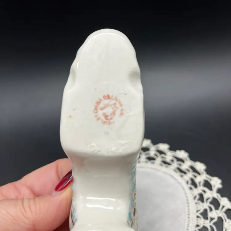 Porcelain Victorian Miniature Shoe 2.5” tall 4” long Pink Roses Blue Gold Accents