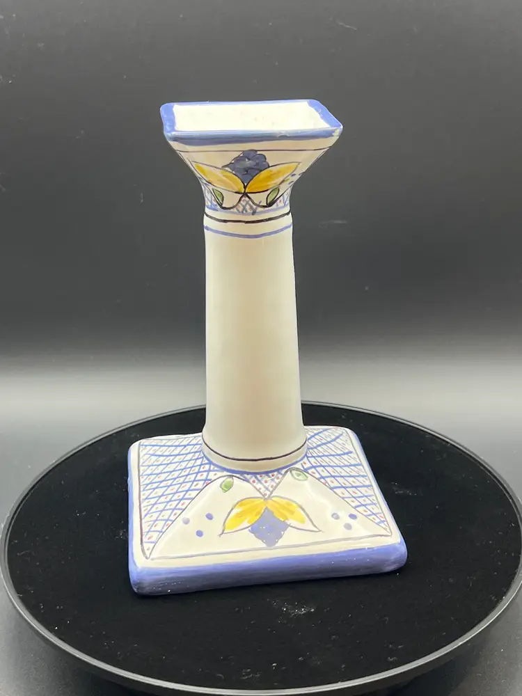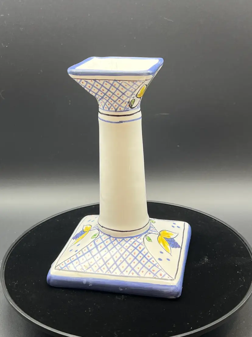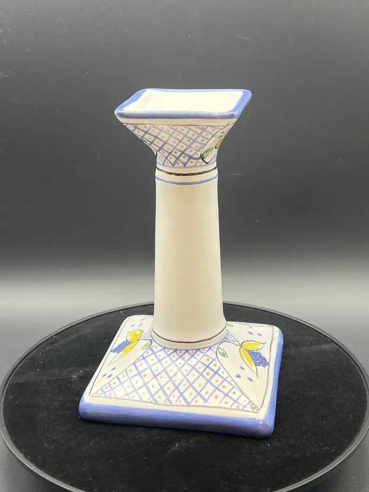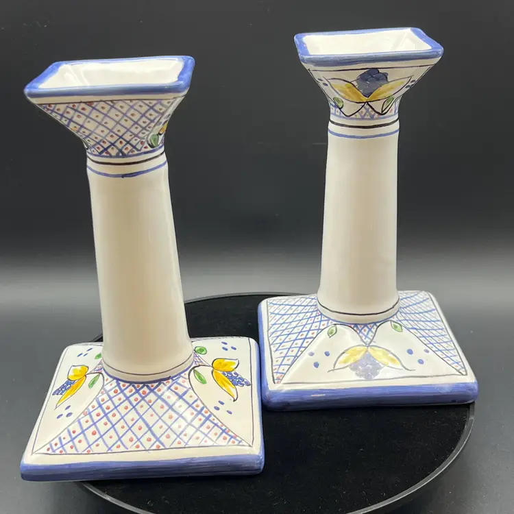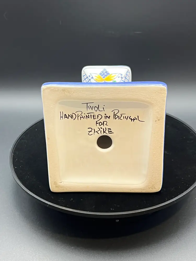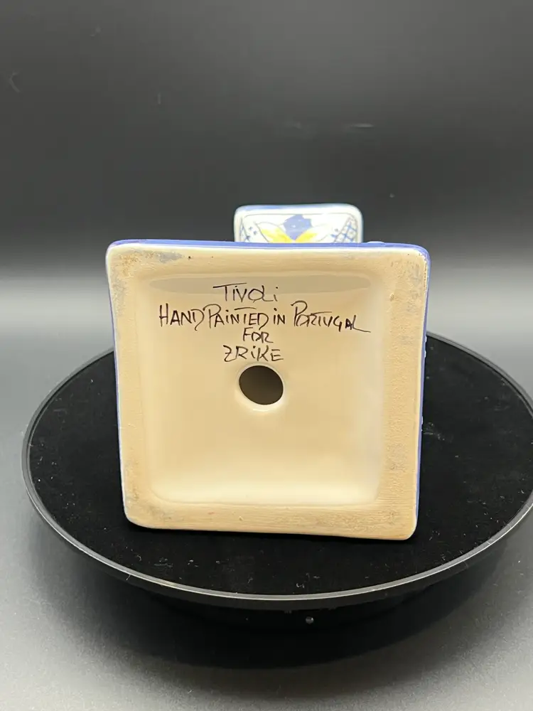 These candle holders are evocative of summers on the patio, warm breezes, and cool drinks. They are in great vintage condition; aside from one pinpoint glaze skip on one piece, there are no call outs.. The bottoms are signed “Tivoli Handpainted in Portugal for Zrike.” They are 6” tall and the bases are 3.75” square. Please see all photos.