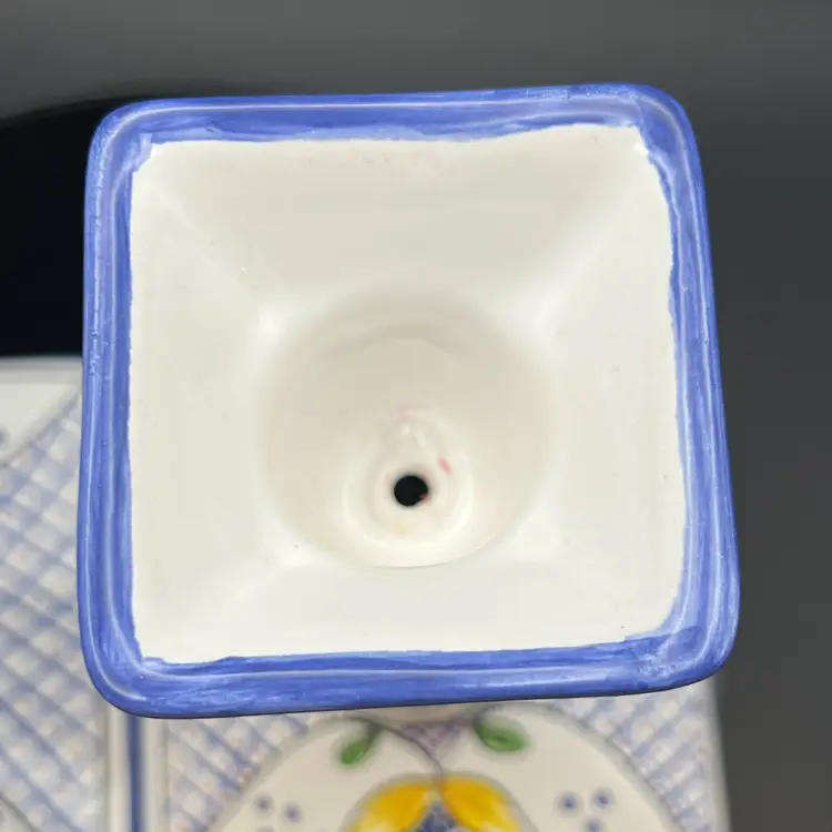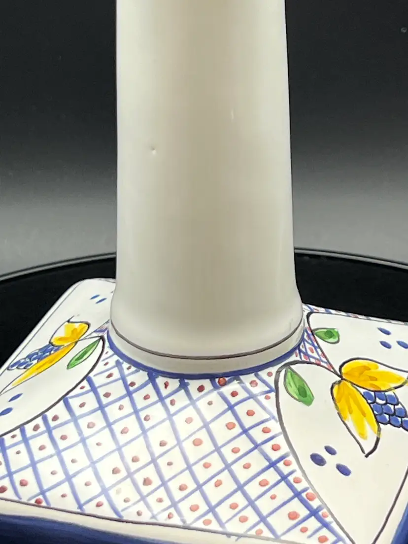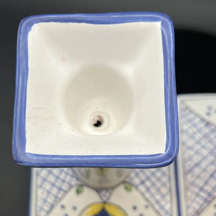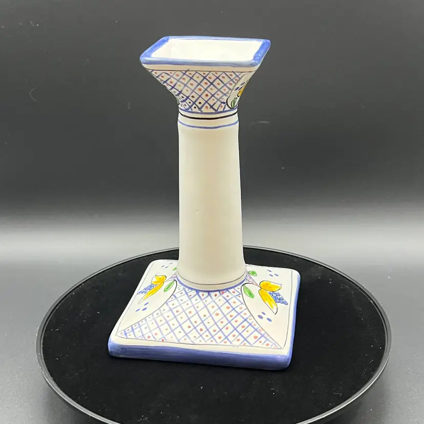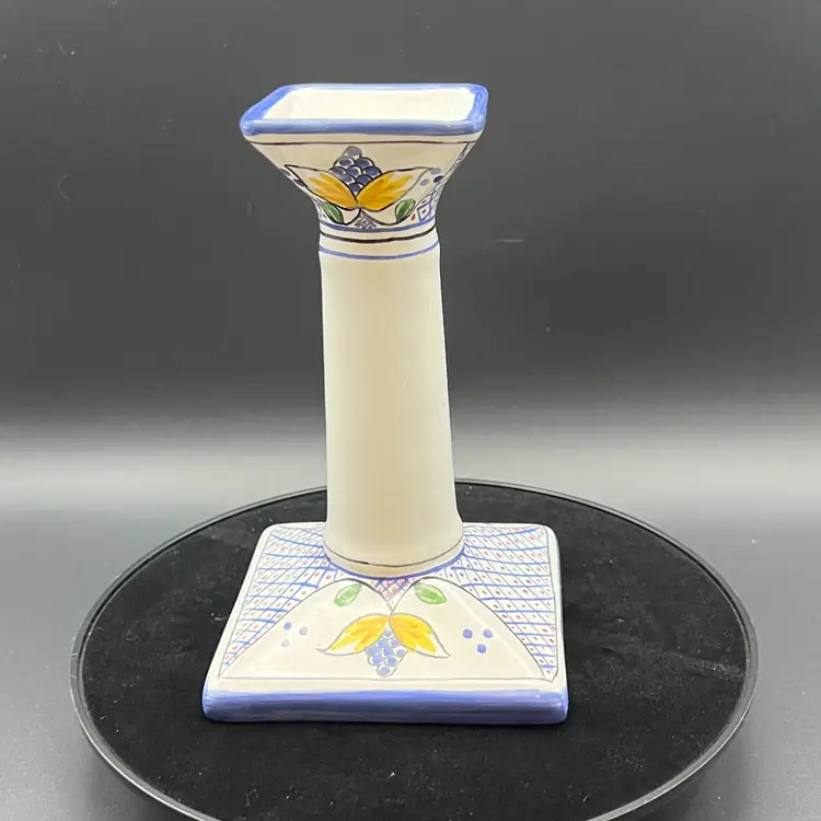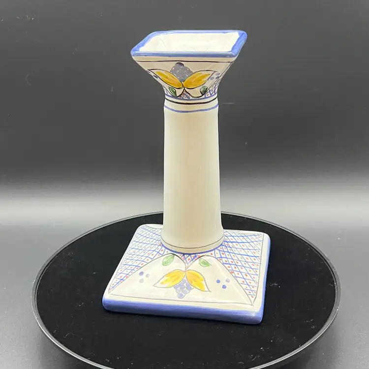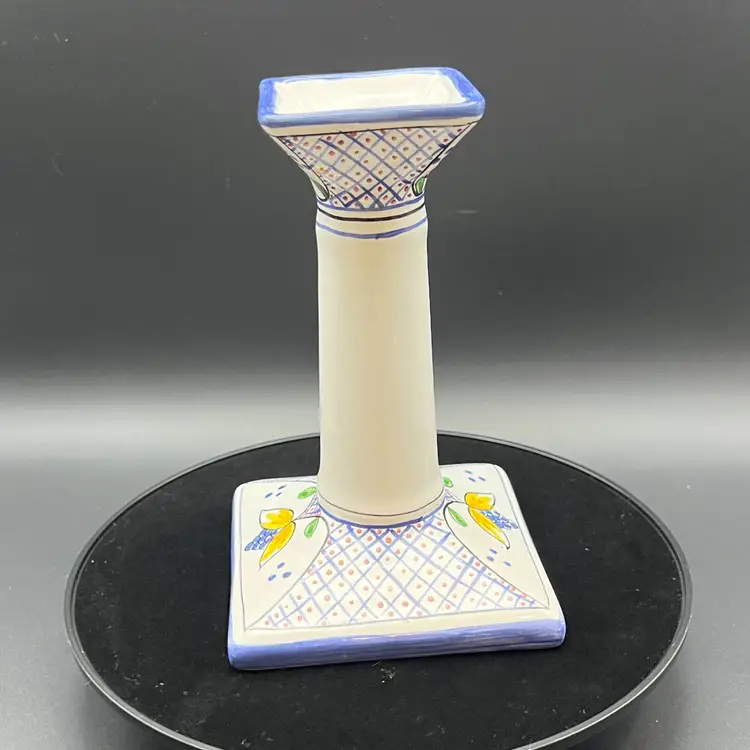 These candle holders are evocative of summers on the patio, warm breezes, and cool drinks. They are in great vintage condition; aside from one pinpoint glaze skip on one piece, there are no call outs.. The bottoms are signed “Tivoli Handpainted in Portugal for Zrike.” They are 6” tall and the bases are 3.75” square. Please see all photos.