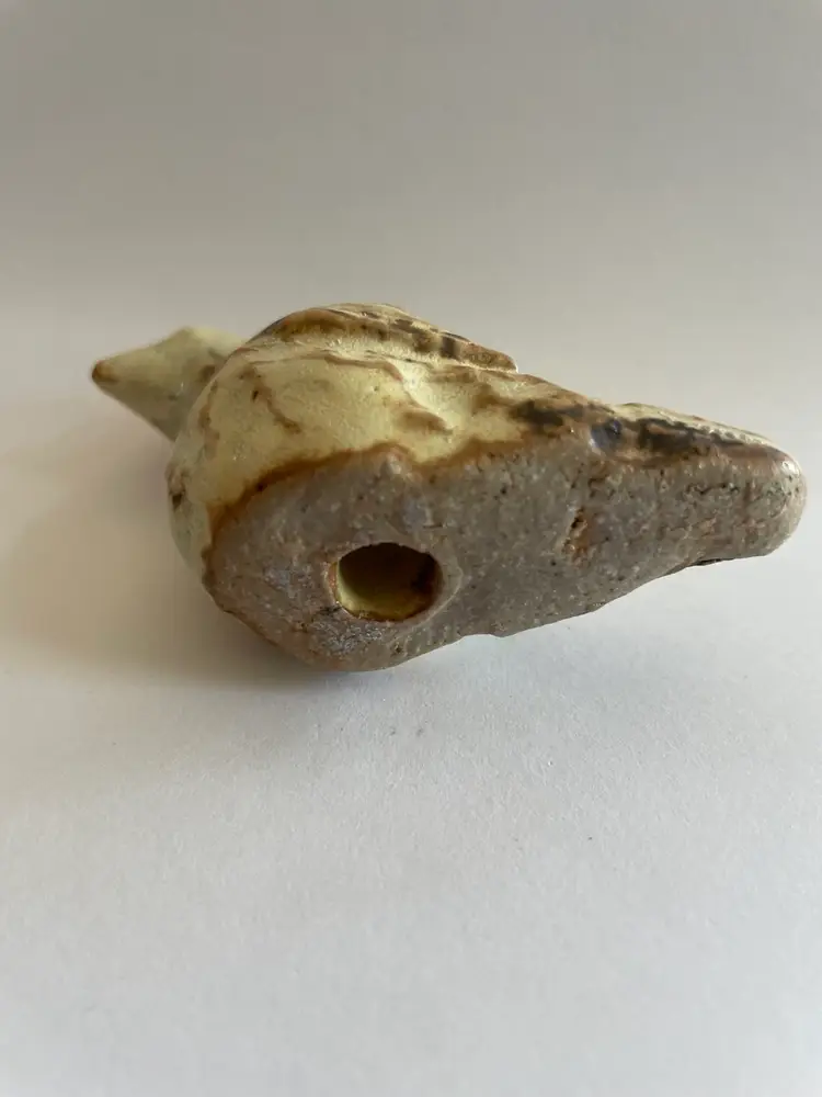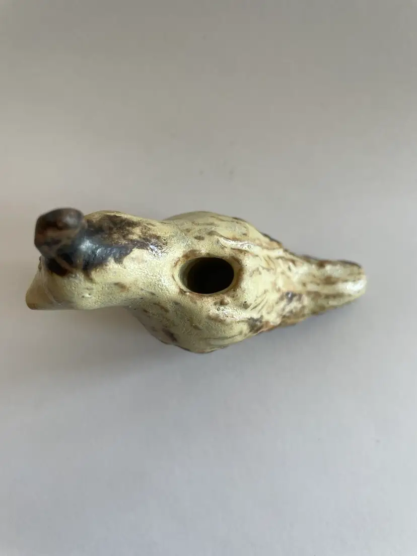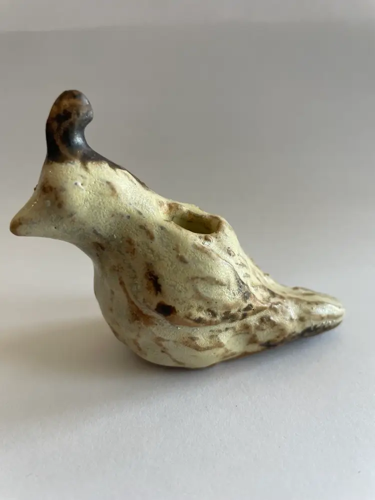 Stoneware Quail Bead. Cream and black with redish-brown, double fired bisque bottom Approx 6 cm tall x 7.5 cm wide, Opening approx 1 cm. Made for Macrame. Made in Arizona Thunderhead Studio.