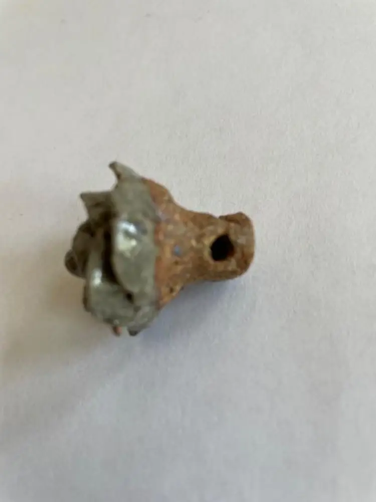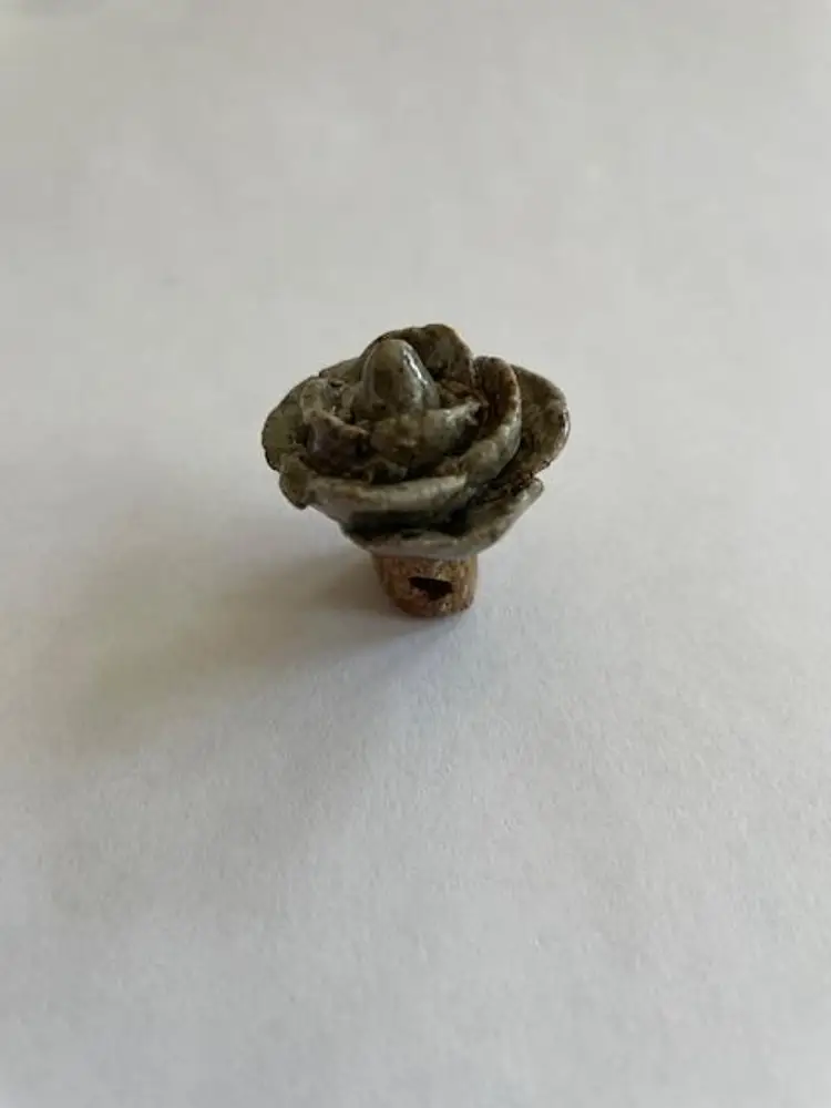 Celadon green glaze on red clay. Hand formed rose, stem has opening. 1 1/8" h x 1" w with an 1/8" opening. Could be used in fiber arts, with a wire as a flower, as a button or a bead hanging from a cord. Made in Arizona by Thunderhead Studios.