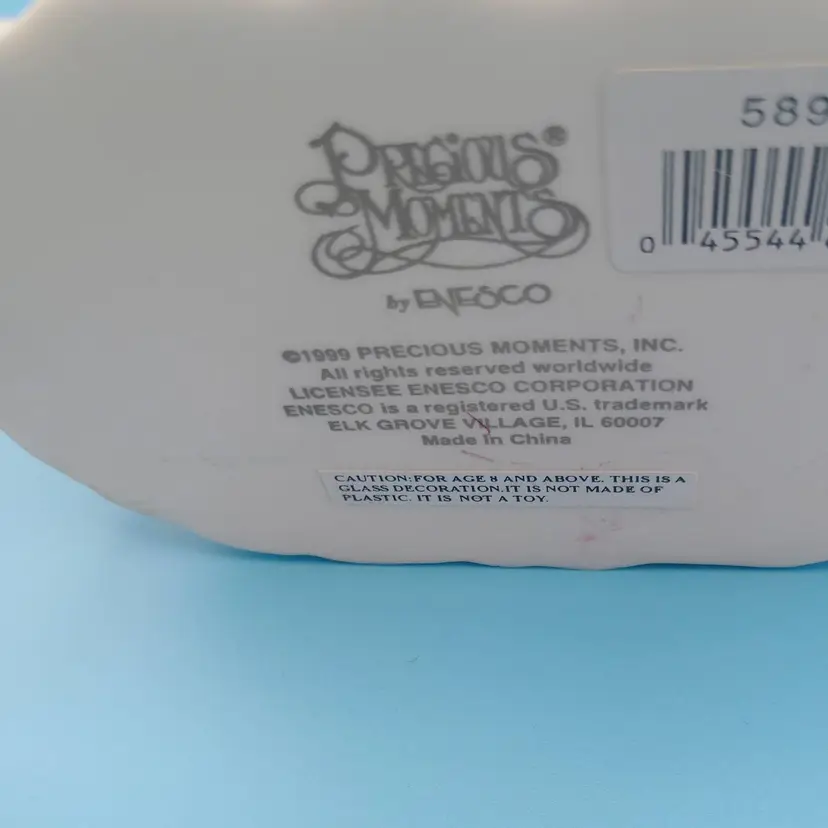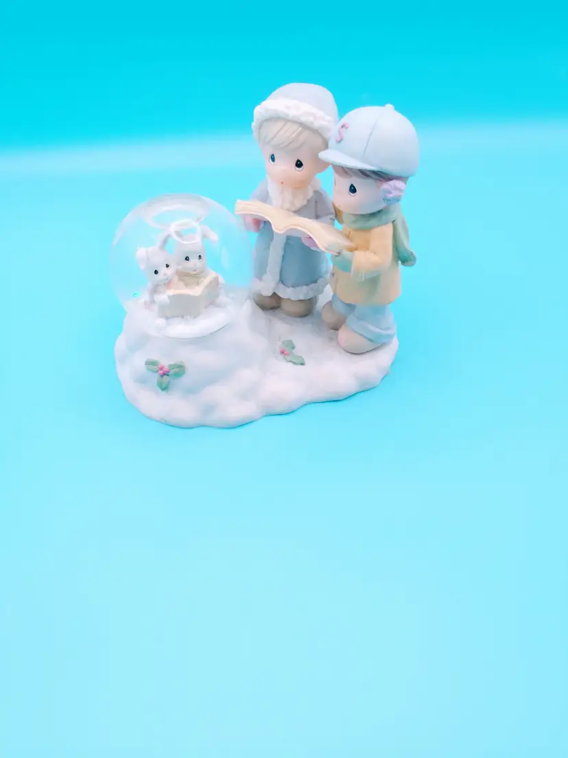 This is a Precious Moments "Christmas Caroling Bunnies" snow globe figurine. The figurine depicts two children looking at a snow globe with two bunnies inside. It is made of bisque porcelain. The item was released in 1999. The model number is 589837L. No box.