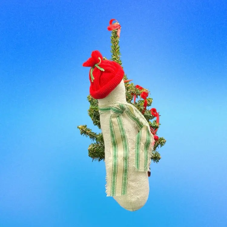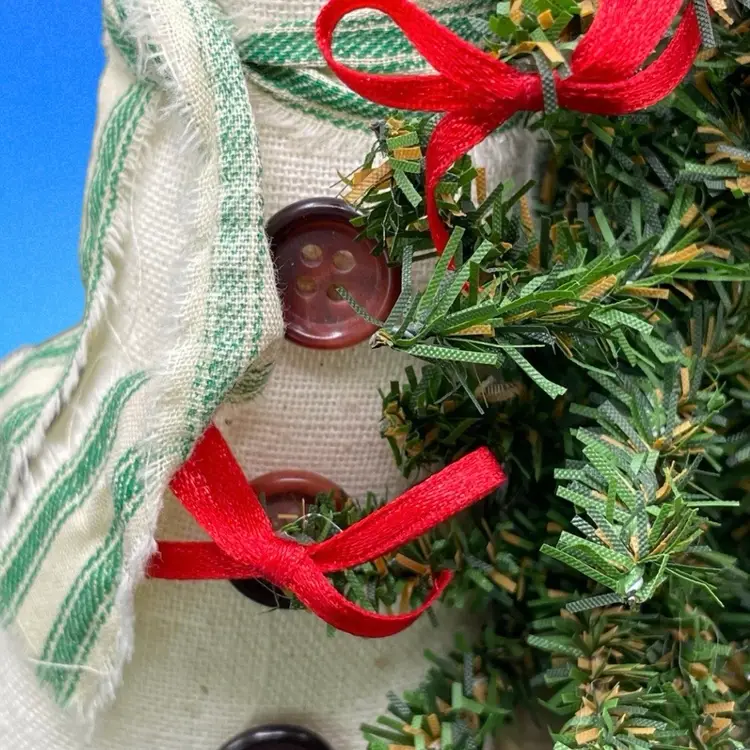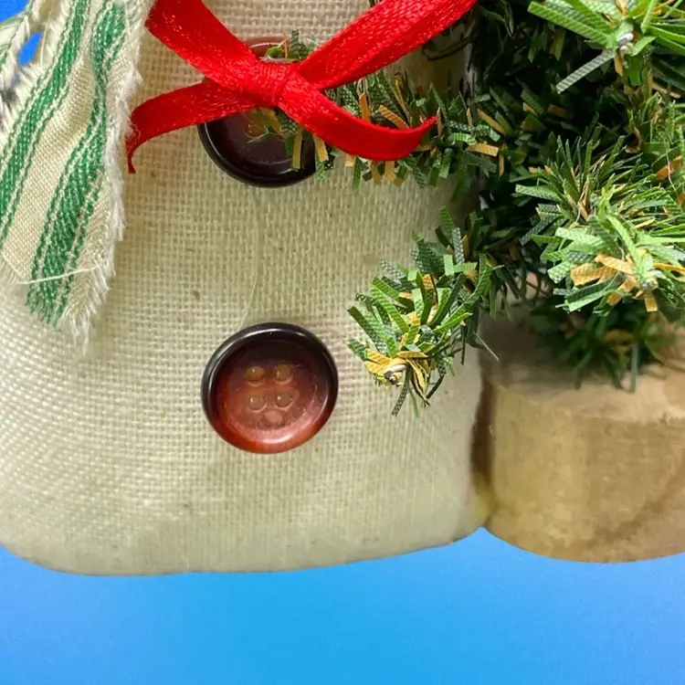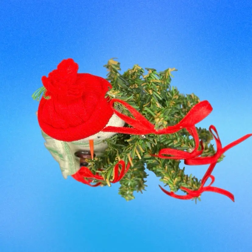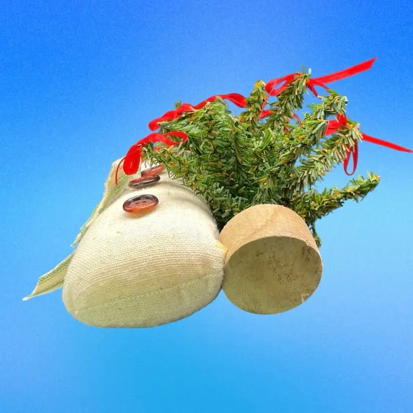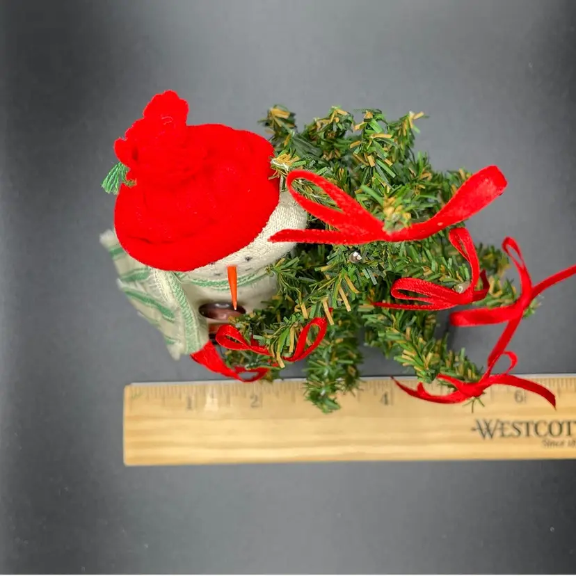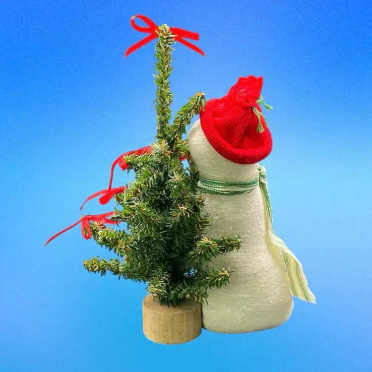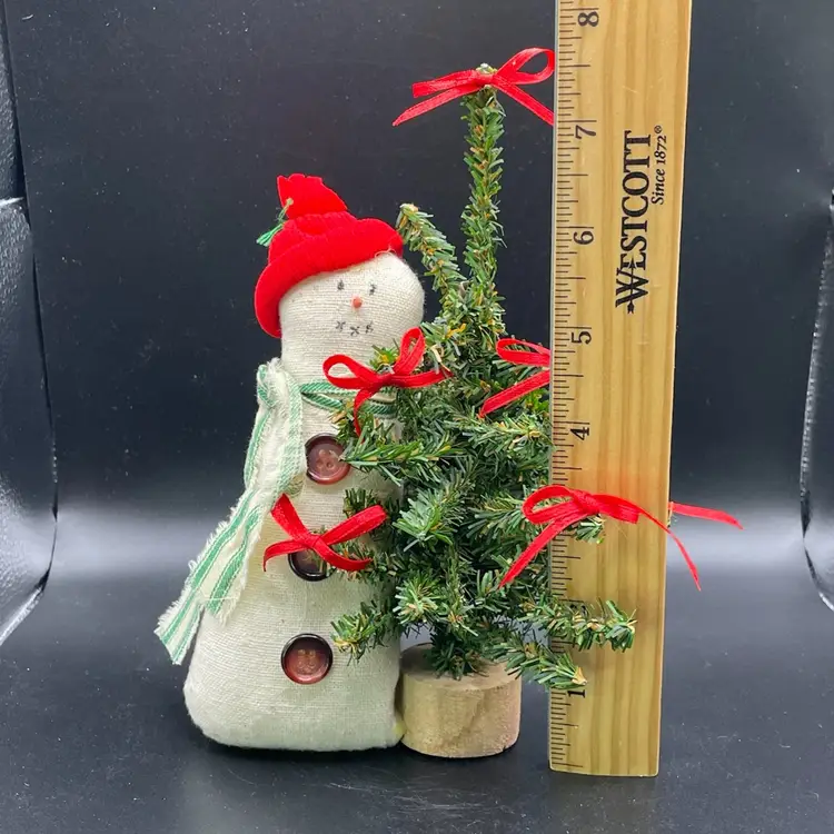 This is a handmade primitive folk art stuffed Snowman along side a Christmas tree. Measures approximately 7.5" x 5” long. No major flaws. SMOKE FREE HOME.
