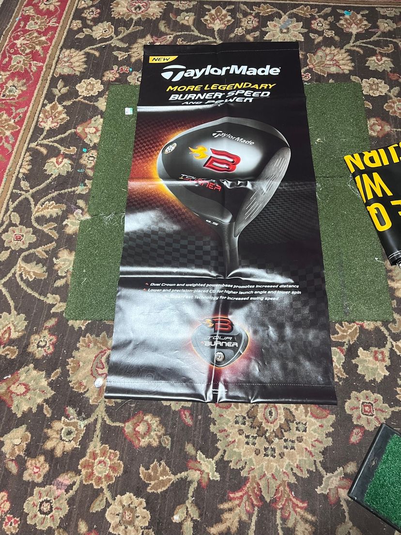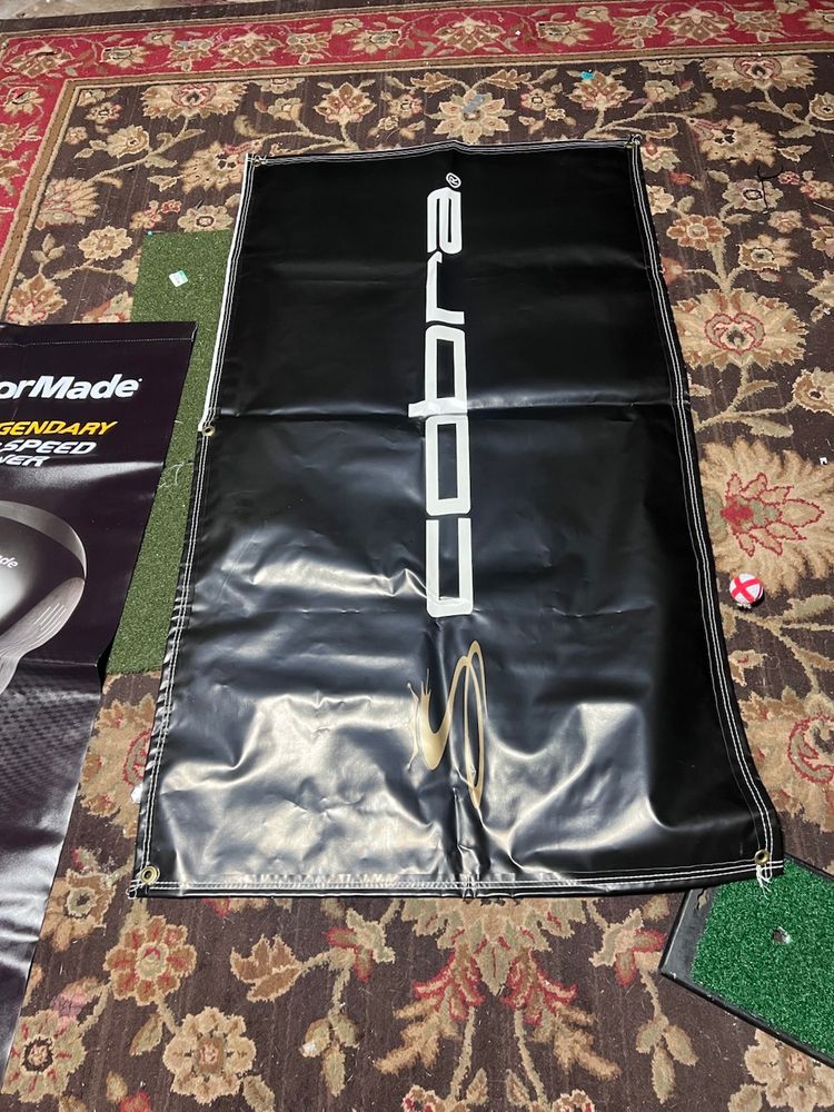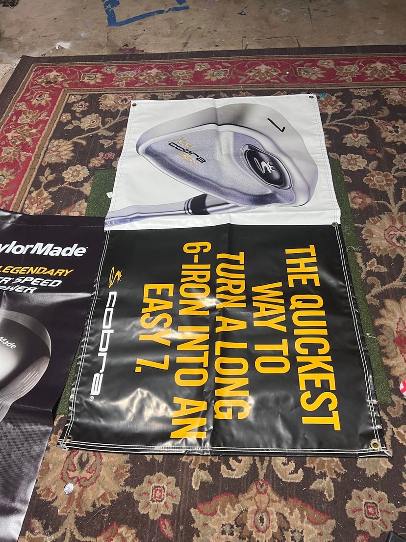 2 old school pro shop or retail banners. Taylormade is made to be hung with dowel rods slid into slots on the ends and is 54x24 Cobra is two sided and has grommets for hanging its 32x57