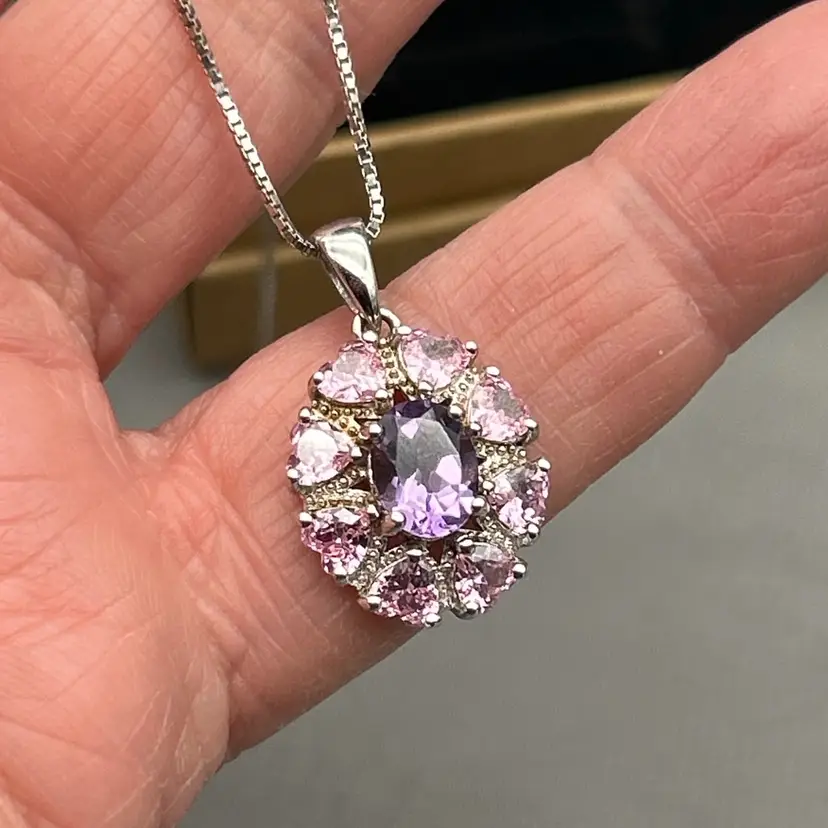 Details: • Metal: Sterling silver (chain tests as 925) • Stone: Amethyst center with pink accent stones • Chain Length: 20 inches • Pendant Style: Floral halo cluster • Condition: Excellent pre-owned condition