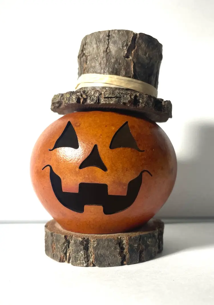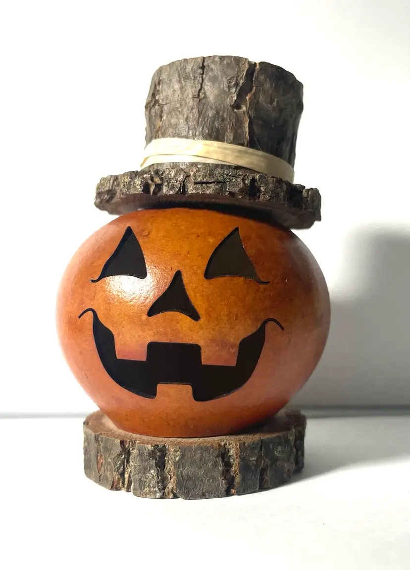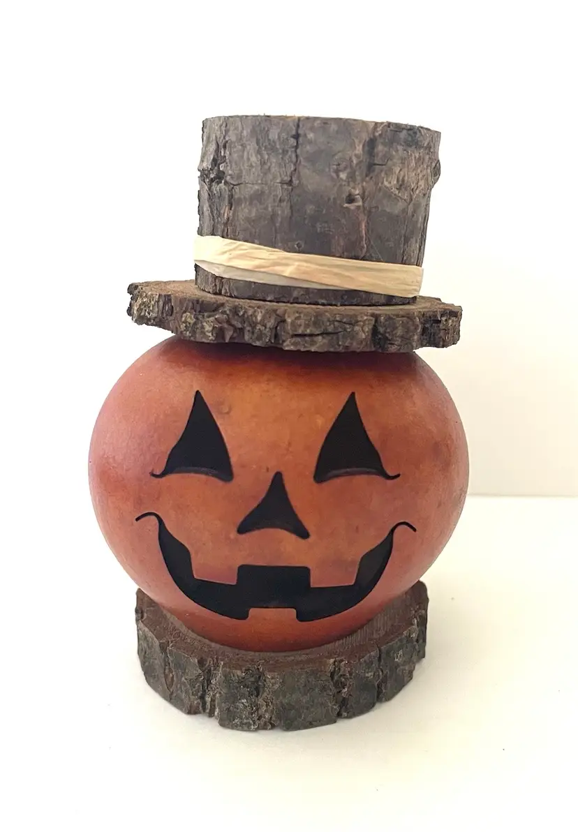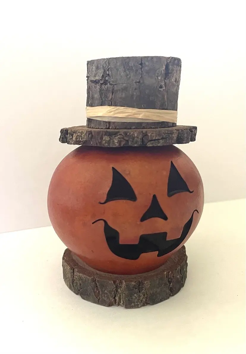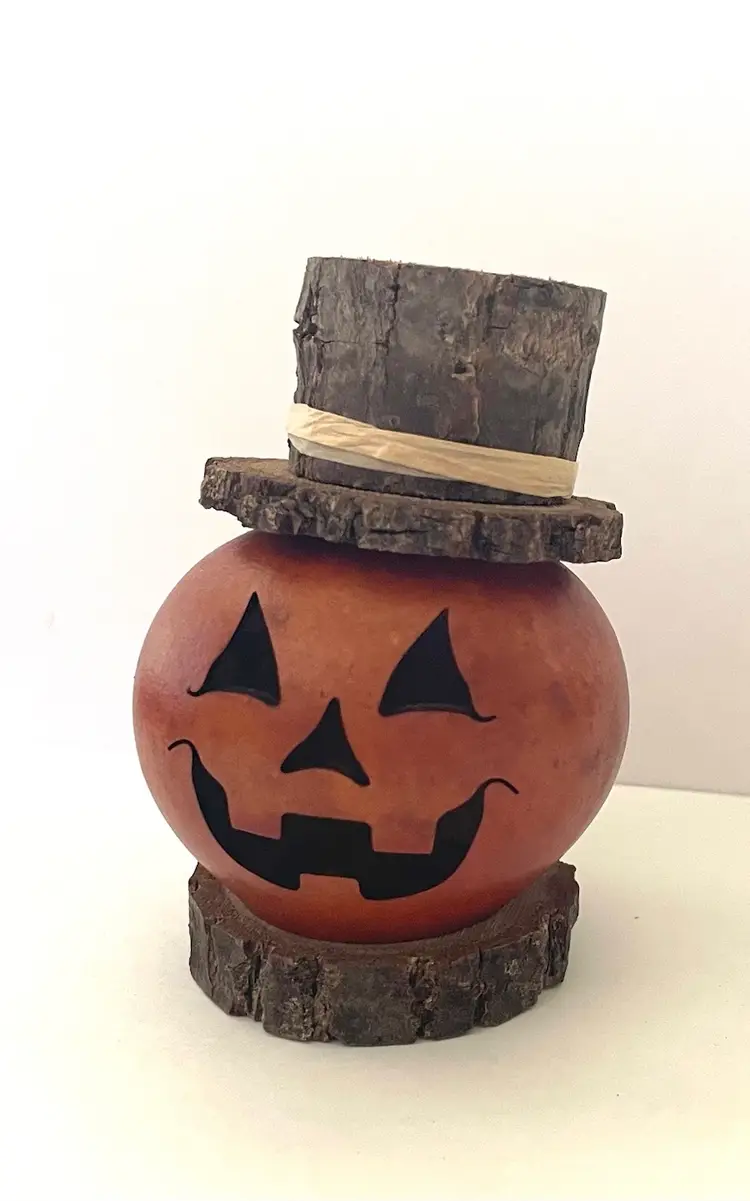 How sweet is this little gourd carved Jack o lantern??!!! His top hat and base are made from tree branches! The perfect little whimsical touch of Halloween to add to any shelf, windowsill, mantle, or table top. Sweet and fun!!! Great condition!!!!