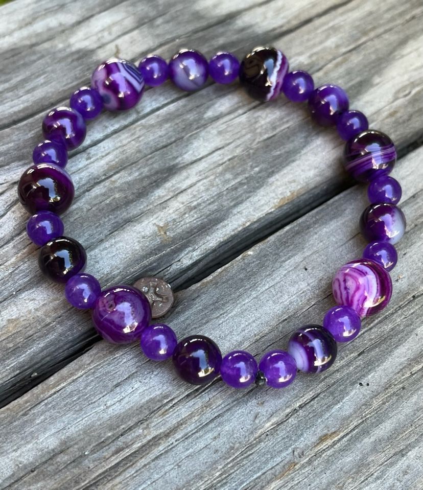 A purple agate stretch bracelet with 8 mm, 6mm and 4 mm beads. The color in this bracelet is gorgeous! Will fit a size 7 1/2 to 8 inch wrist. All stretch bracelets are tied twice and glued with jewelry glue and will last you many years if you always roll them onto your wrist.
