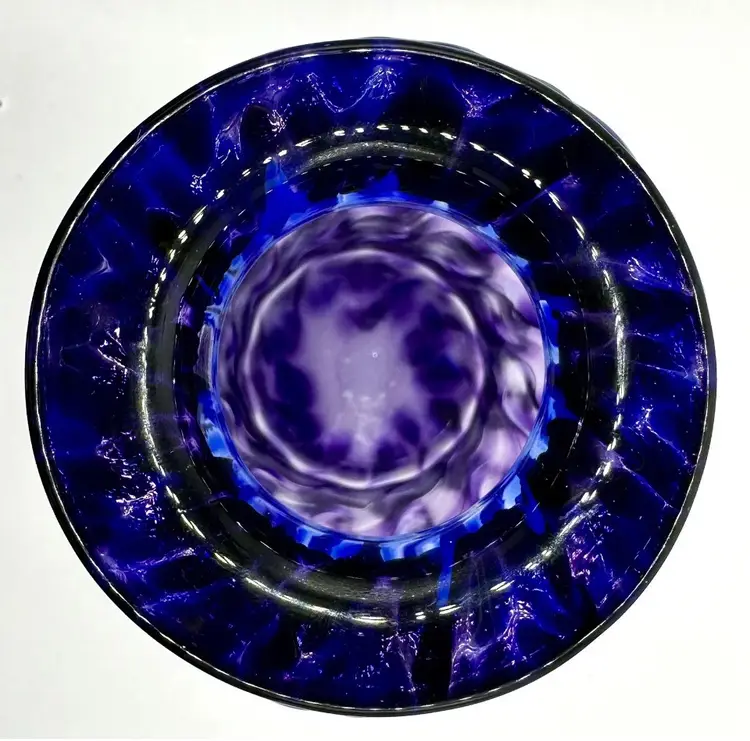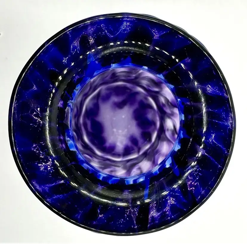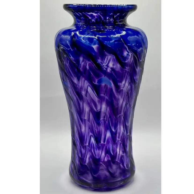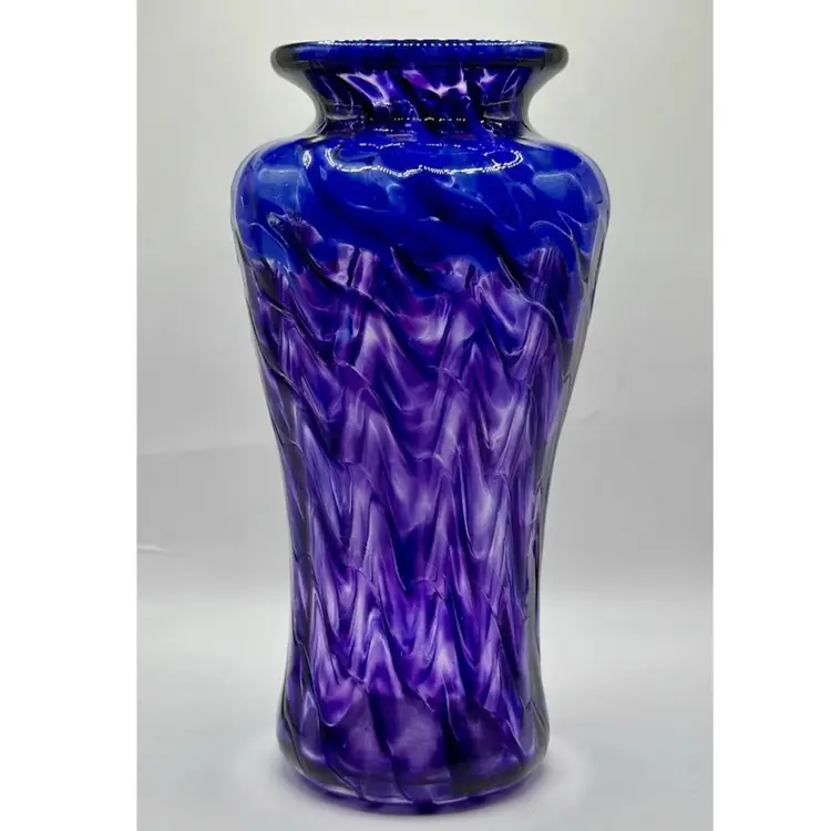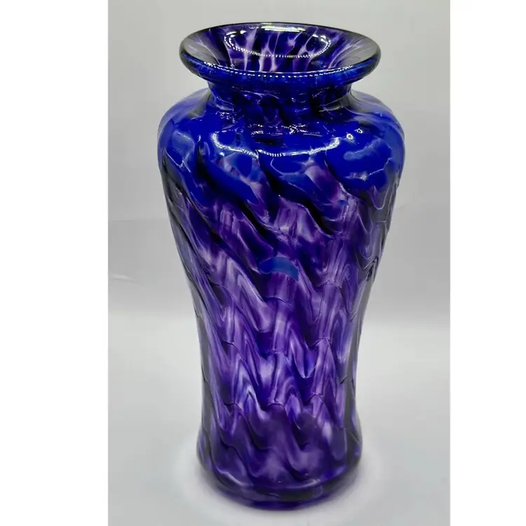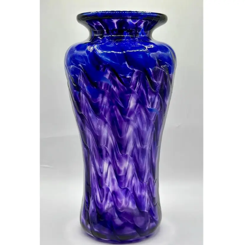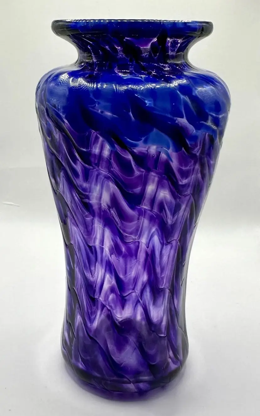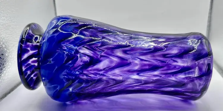 Stunning handblown studio art glass vase in amethyst purple and cobalt blue, with rippled glass swirls cascading from the neck of the vase.