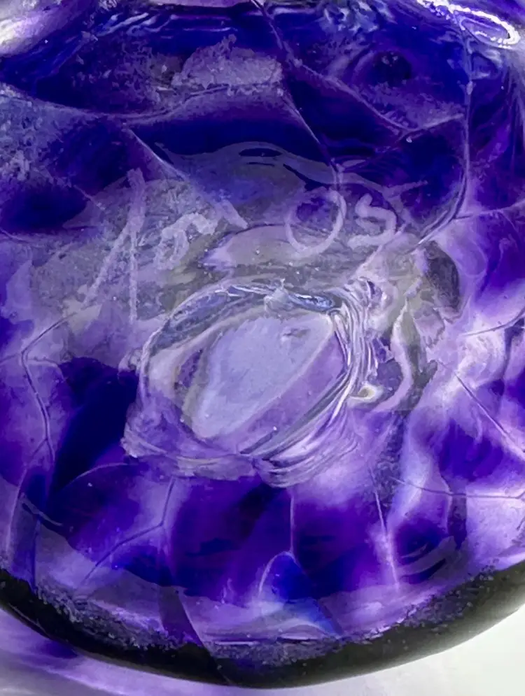 This piece of art was created and signed by artist Jon Offutt of House of Mulciber in Fargo, ND. He has been blowing glass for more than 25 years. His work is in the collections of the Plains Art Museum, North Dakota; Rourke Art Museum, Minnesota; Polk Museum of Art, Florida; Art Museum of Southeast Texas; Kentucky Art and Craft Foundation; Southern Illinois University; and Alamance County Arts Council, North Carolina.