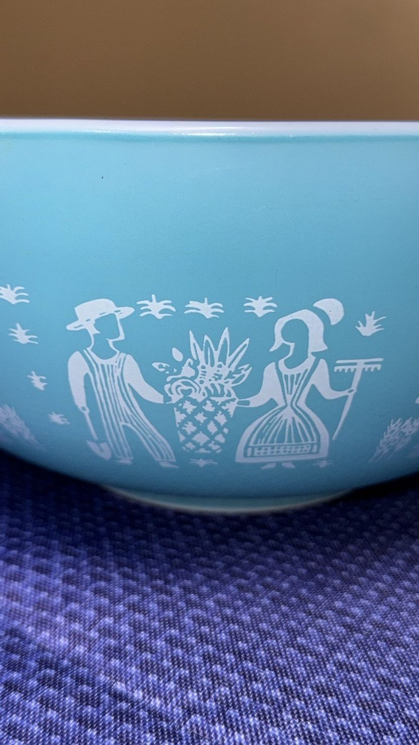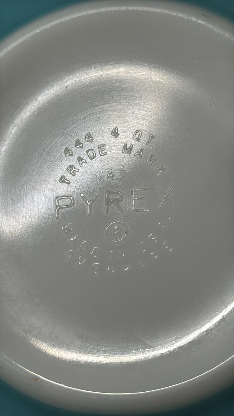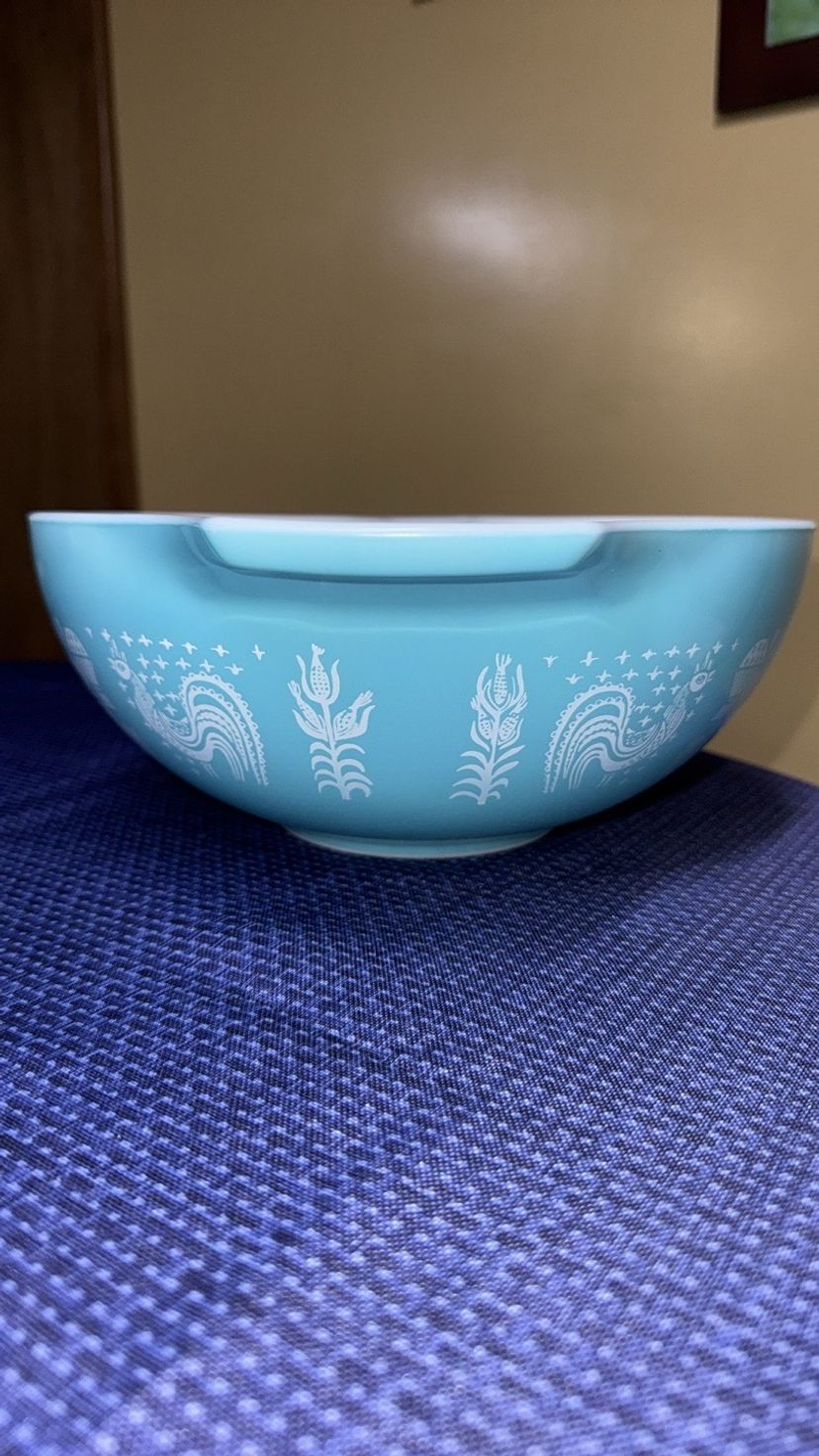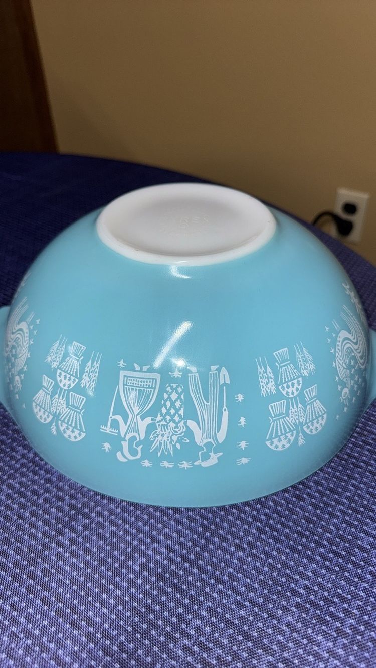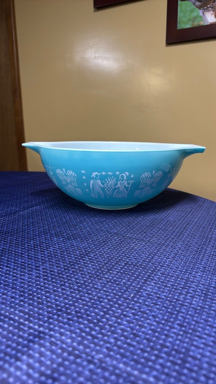 Elegant silver mixing bowl by Pyrex. Ideal for modern kitchens. Pyrex Amish Butterprint Cinderella Mixing Bowl 444 4QT Turquoise Nice! 13” across at handles 10.5” diameter 4.25” tall Excellent like new condition with very few scratches (598531256)