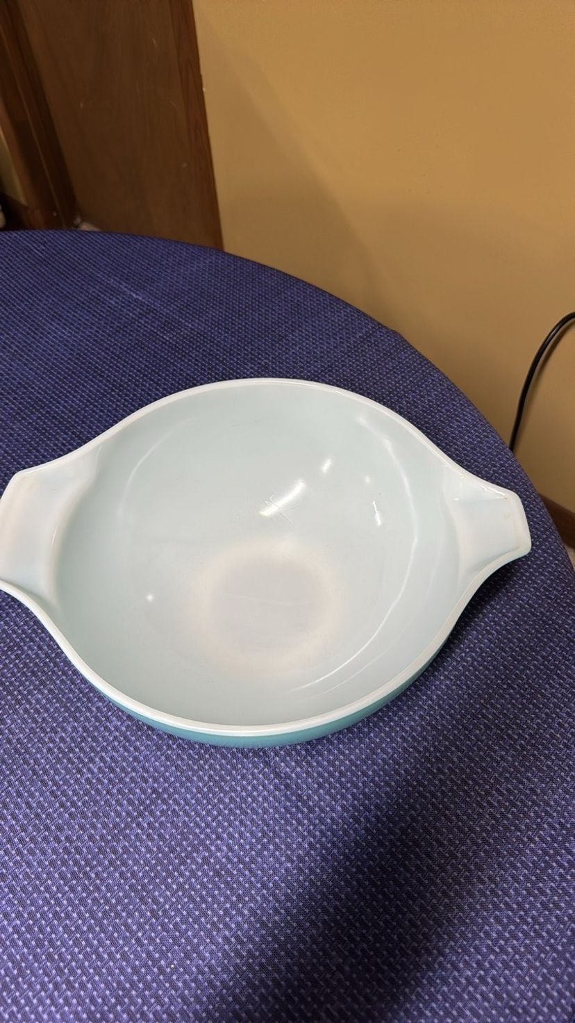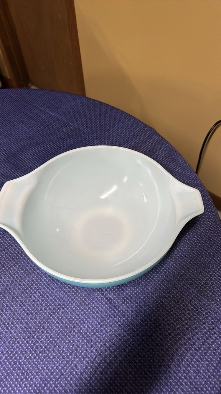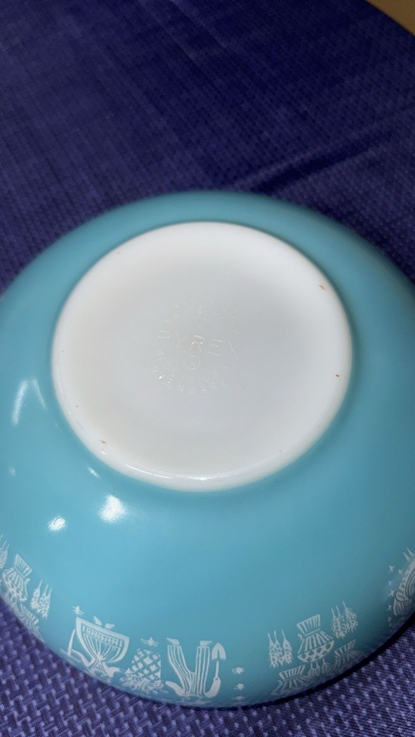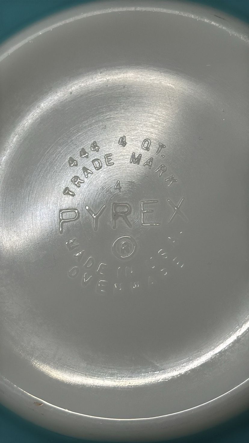 Elegant silver mixing bowl by Pyrex. Ideal for modern kitchens. Pyrex Amish Butterprint Cinderella Mixing Bowl 444 4QT Turquoise Nice! 13” across at handles 10.5” diameter 4.25” tall Excellent like new condition with very few scratches (598531256)