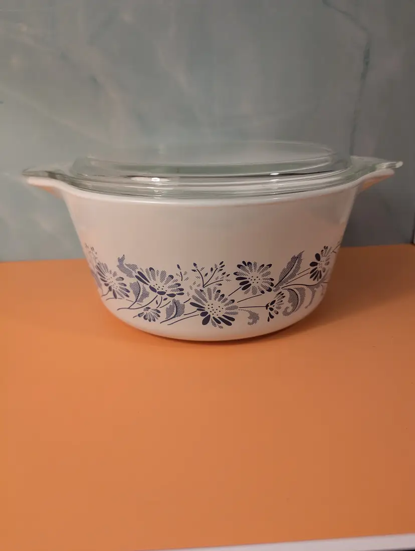 This dish is in good vintage condition with no chips or cracks, minimal wear, and very few flea bites. The lid has a small chip on the handle.