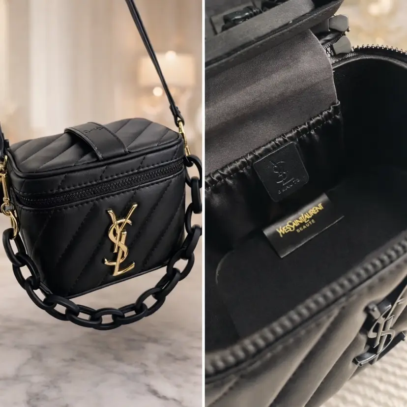 The structured silhouette and detachable chain strap make it versatile—wear it as a mini crossbody, shoulder bag, or use it as a stylish makeup organizer.
