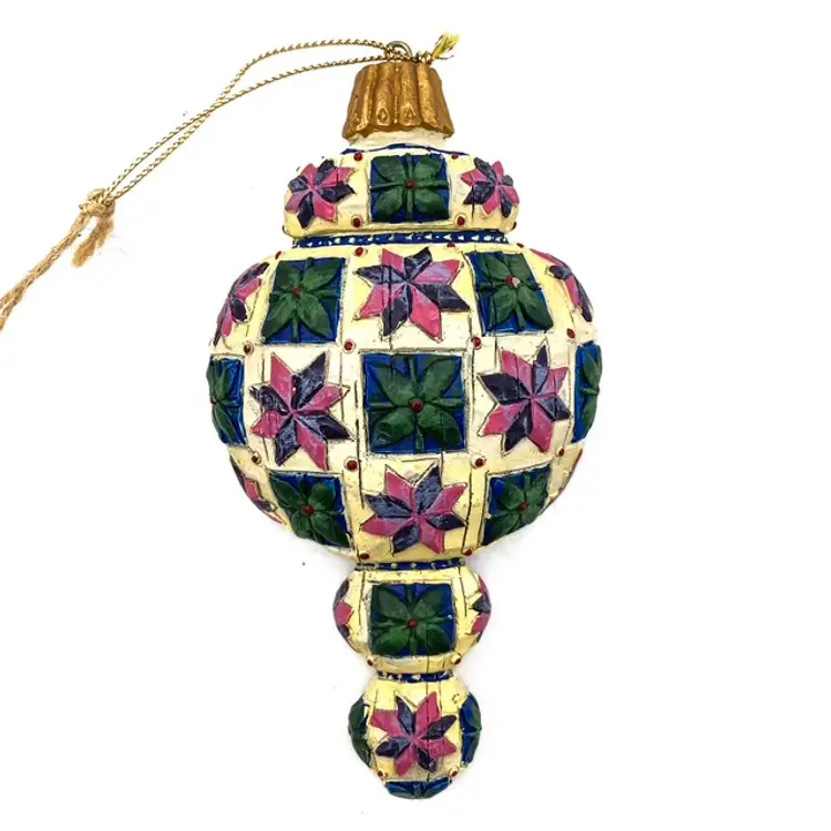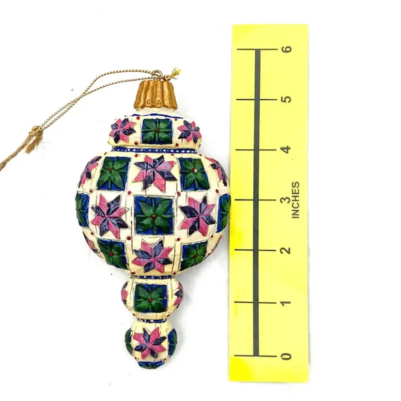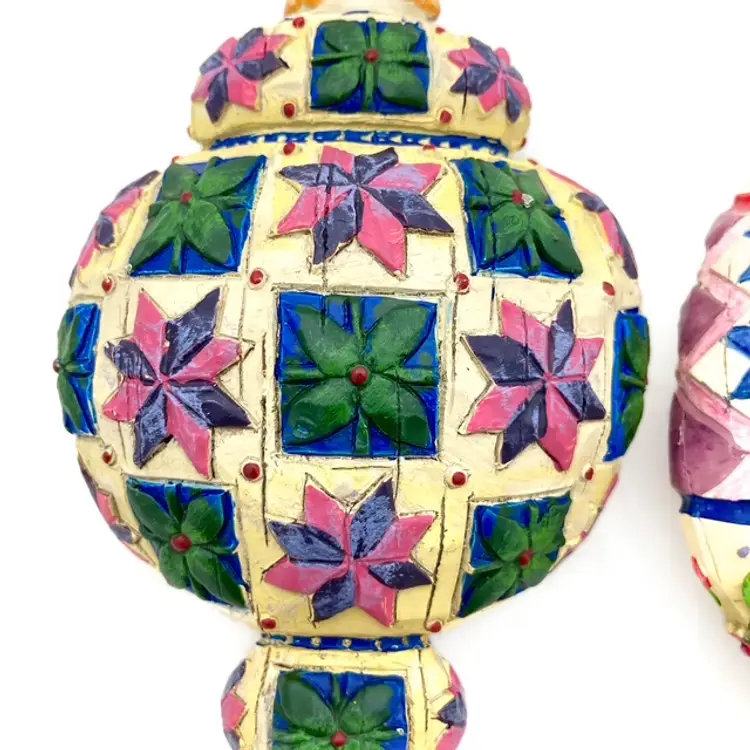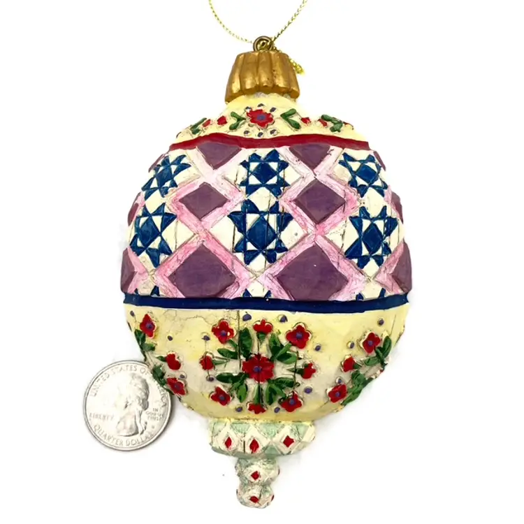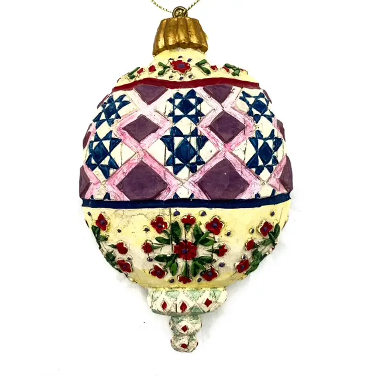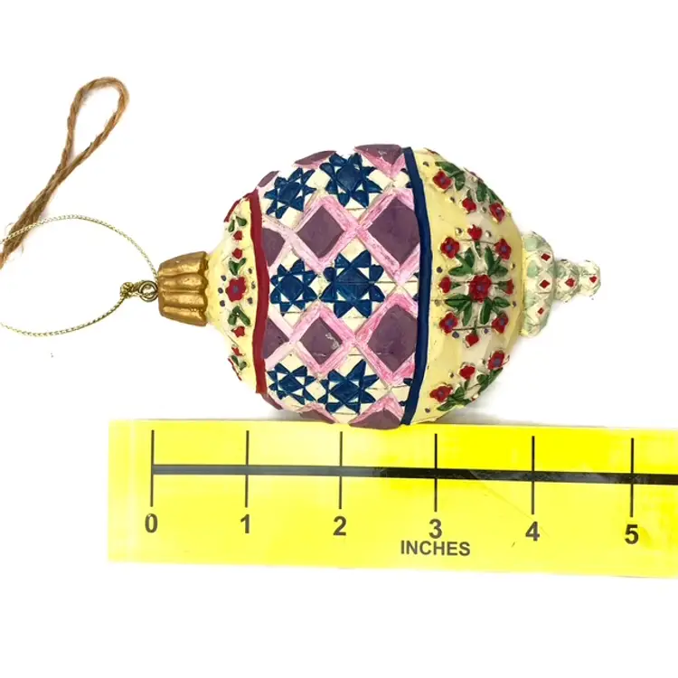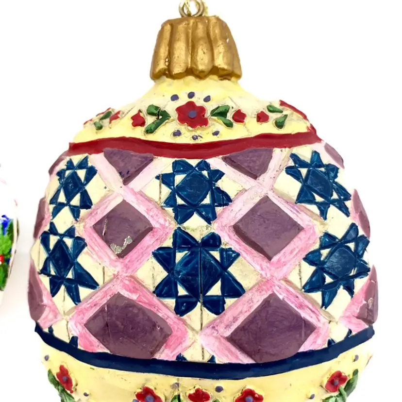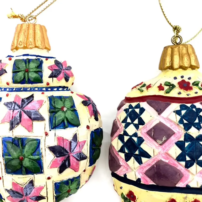 Quilted Teardrop style ornaments for the holidays. Pink and Green ornament is painted the same on both sides, this Jim Shore decoration is in great used condition.5.75" tall, 3.25" wide and approximately 1.25" deep. Purple and Blue ornament is also in excellent used condition. 5" tall, 3.5" wide and about 1.25" deep Both ornaments are painted the same on front and back. This listing is for the pair. mar5556