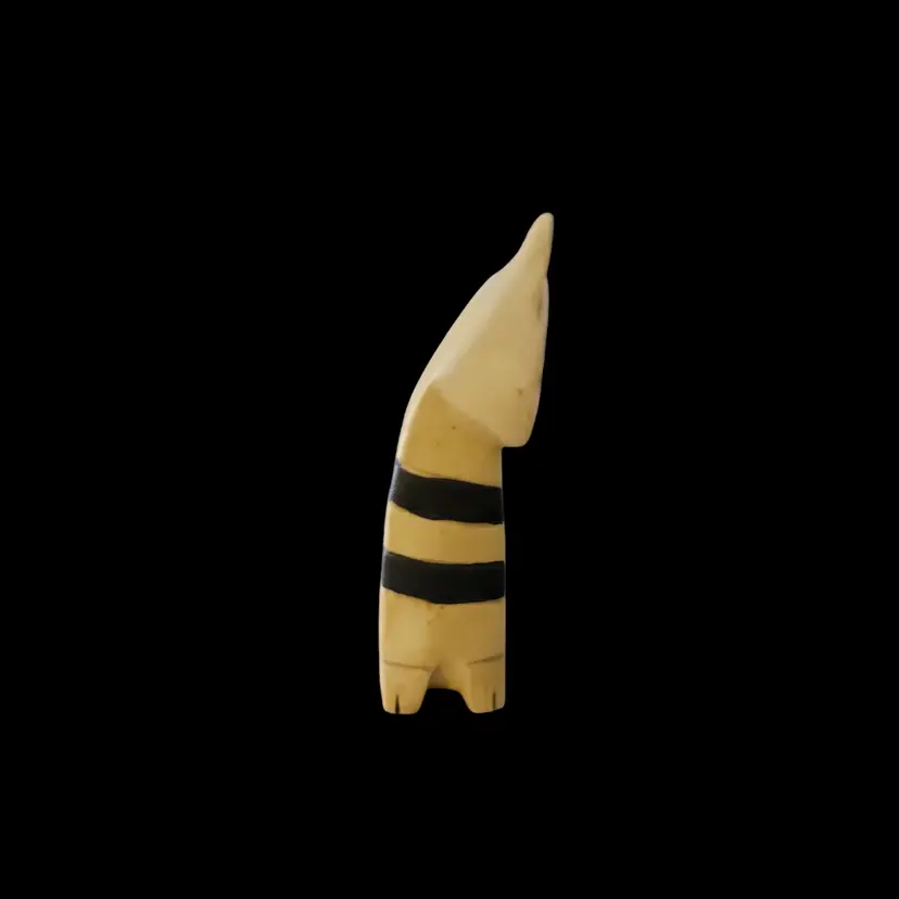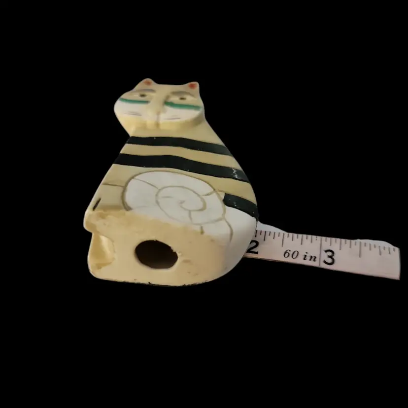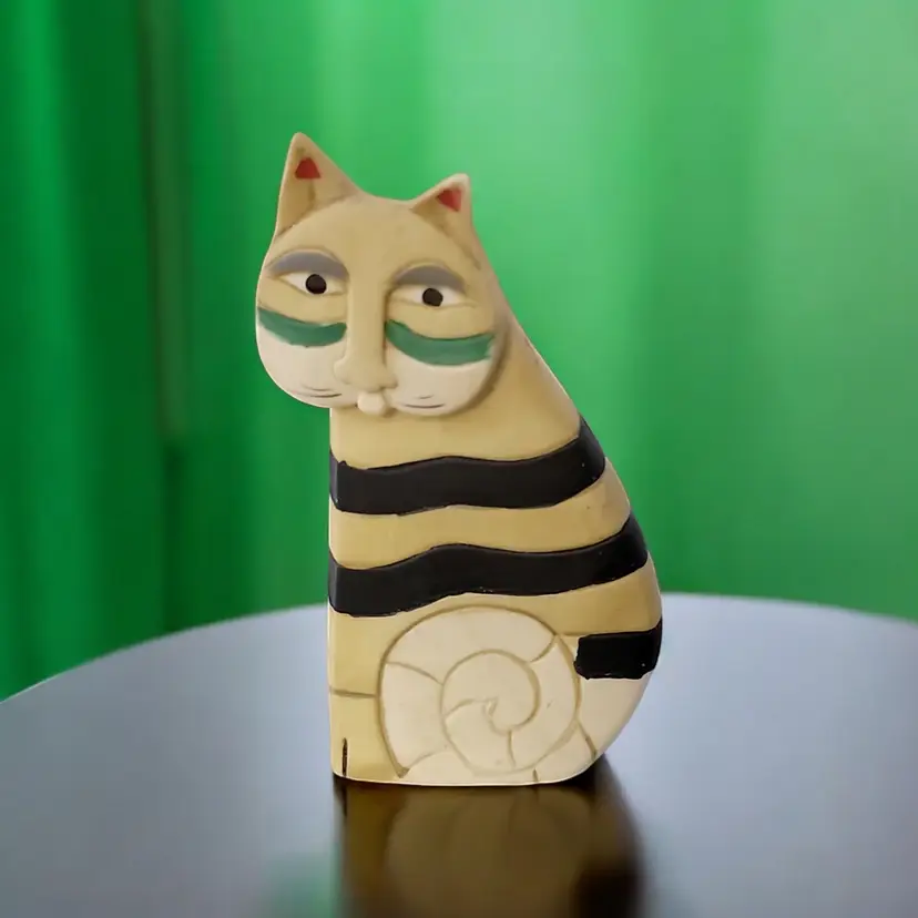 This vintage ceramic small figurine is a must-have for any cat lover's collection. Hand-painted with fun and colorful details, this figurine showcases a charmingly quirky cat with tiger stripes. Standing at 3 3/4 inches tall, it is a perfect addition to any display shelf or desk.