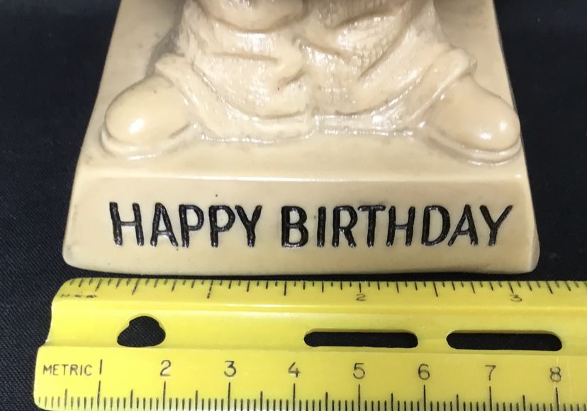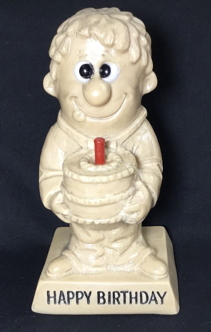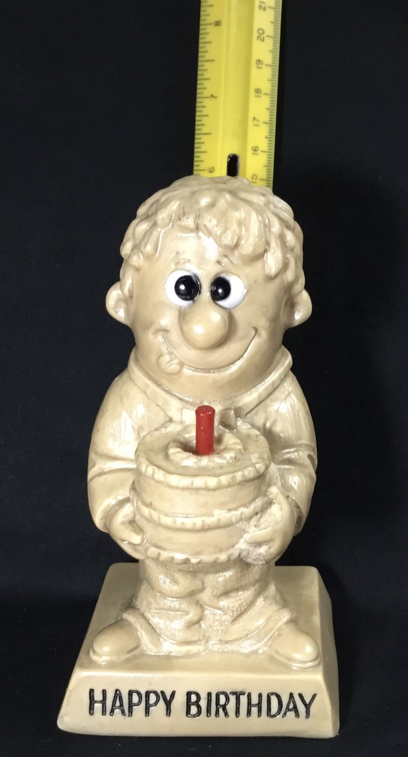 6 inches tall on 3.25 by 3 inches base, beige resin figurine from 1976 by R. & W Berries Co. Man holding a cake with one red candle. His tongue sticking out, licking his lips for some cake. Base says "Happy Birthday" in black lettering.