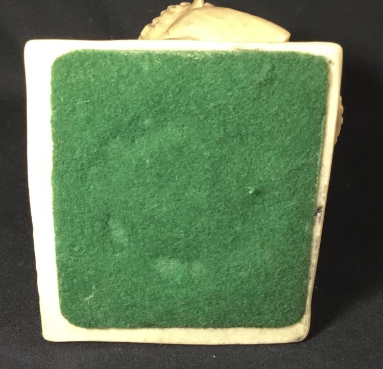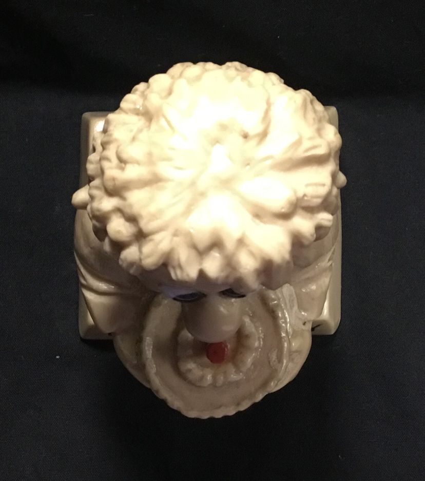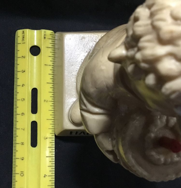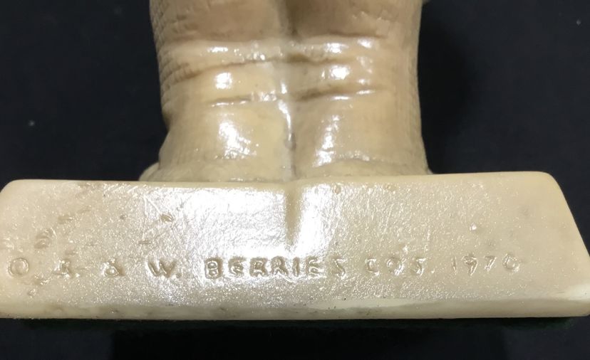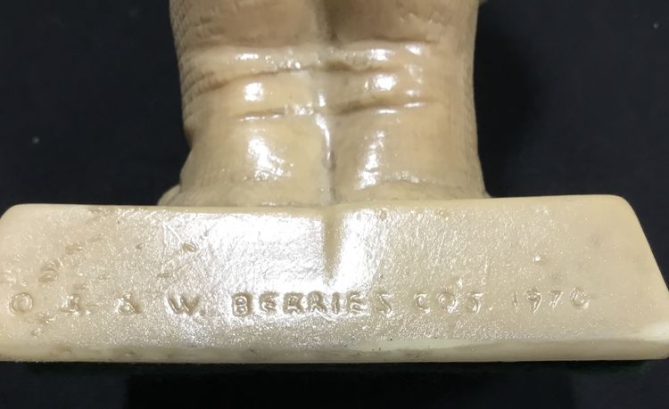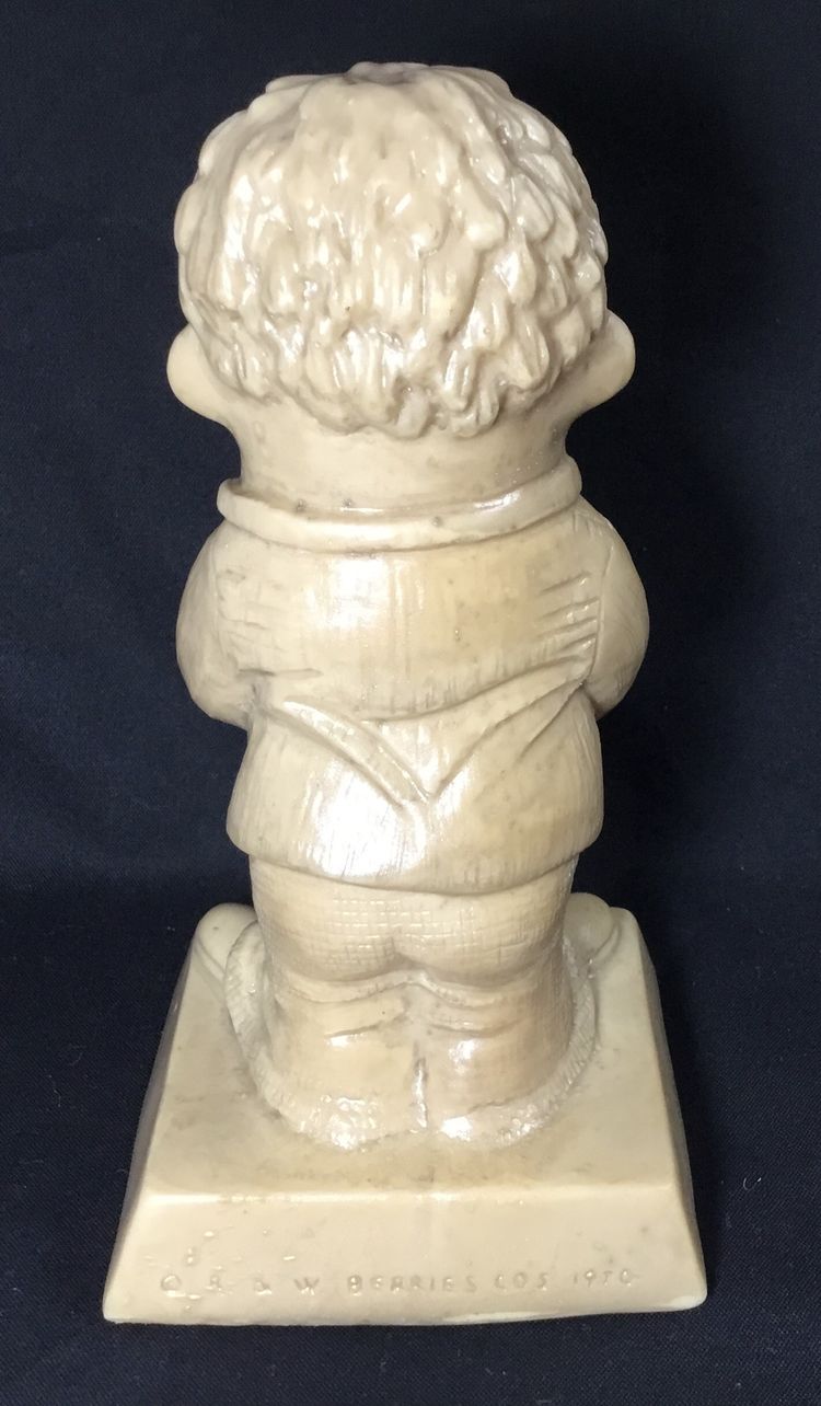 6 inches tall on 3.25 by 3 inches base, beige resin figurine from 1976 by R. & W Berries Co. Man holding a cake with one red candle. His tongue sticking out, licking his lips for some cake. Base says "Happy Birthday" in black lettering.