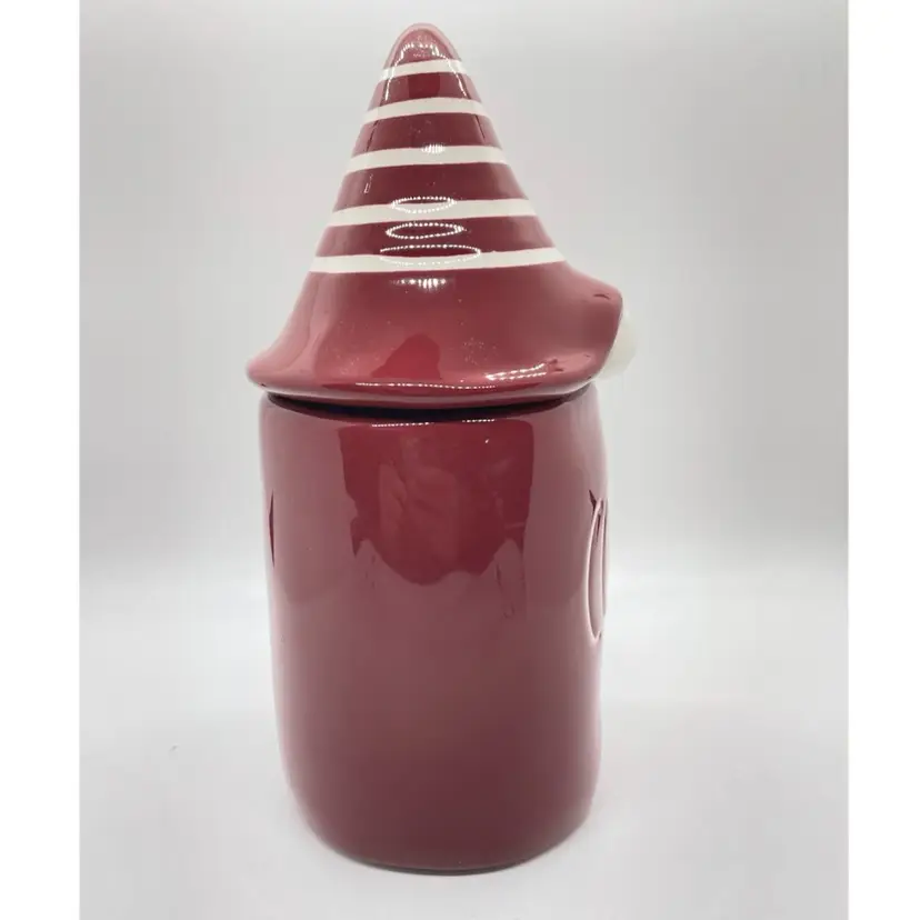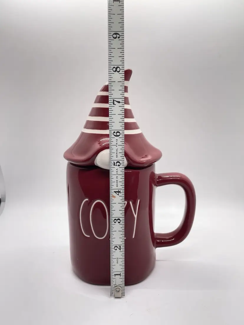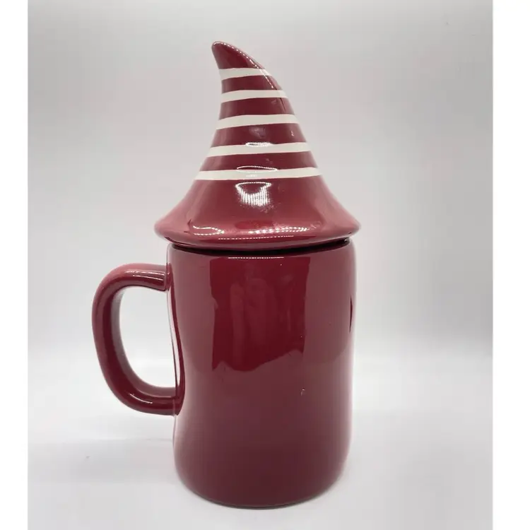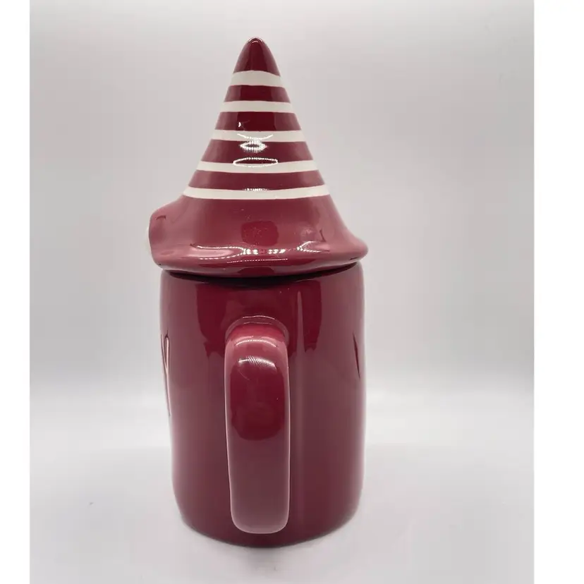 Rae Dunn Cozy Red/ Maroon Coffee Mug with elf/gnome topper lid with stripped pointed hat. Get ready for fall, winter, and the upcoming holidays with this super adorable mug. No chips or cracks, may show signs of light use.
