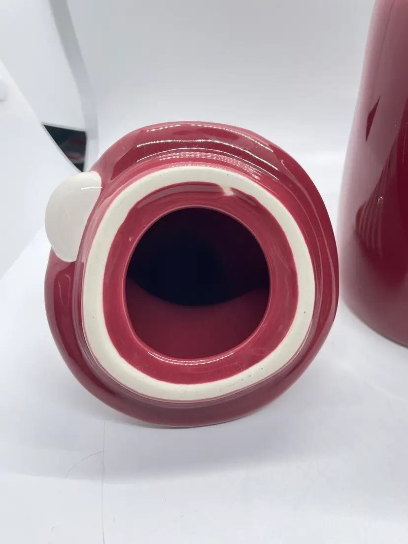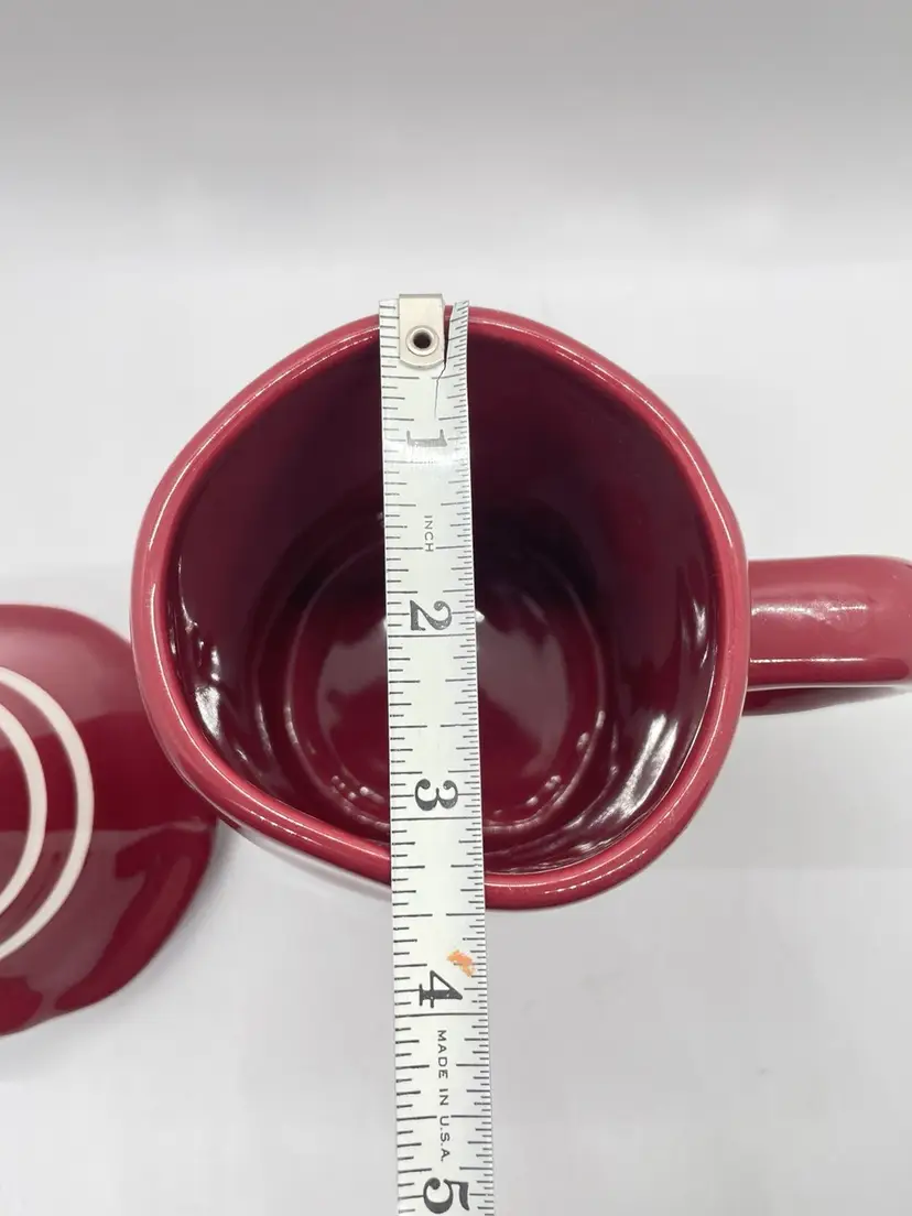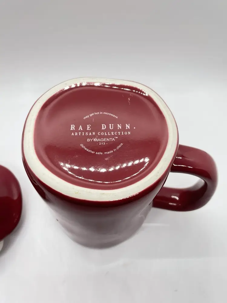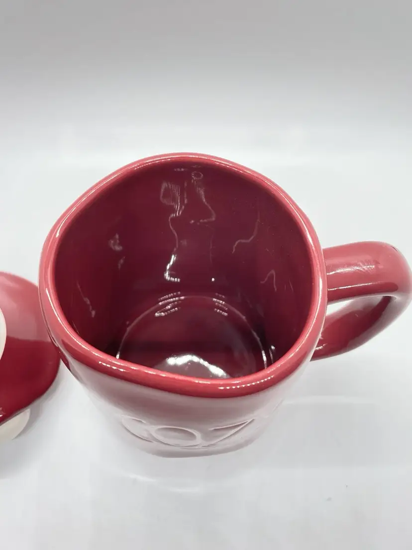 Rae Dunn Cozy Red/ Maroon Coffee Mug with elf/gnome topper lid with stripped pointed hat. Get ready for fall, winter, and the upcoming holidays with this super adorable mug. No chips or cracks, may show signs of light use.