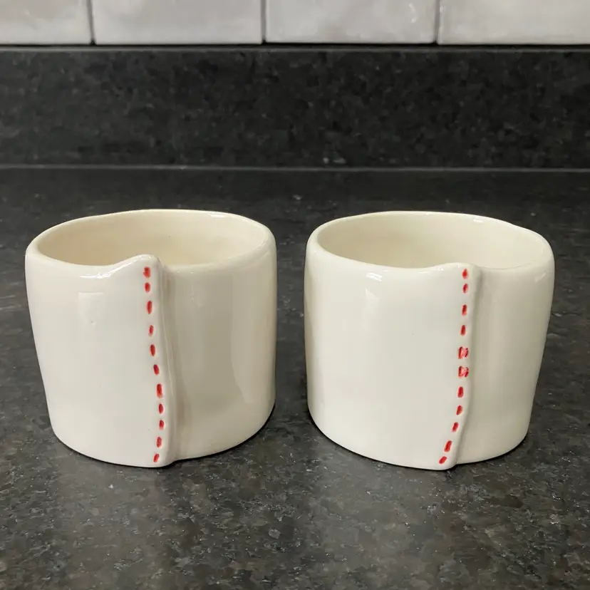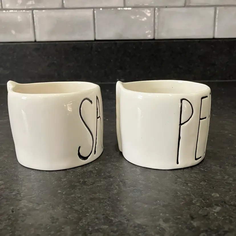 We are selling these rare vintage rare Magenta Rae Dunn Boutique salt and pepper cellars with stitching on the back and large letters. This are first pour, vintage, highly sought after, Magenta Rae Dunn. They are listed as used because they have been owned for many years but they have never been used. There is slight shelf wear on the bottoms and the pepper cellar has a tiny black dot on the inside that I took a picture of. They have a cute red stitch detail down their backs. There are no chips or cracks. They measure approximately 2 1/2” tall and 2 7/8” in diameter.