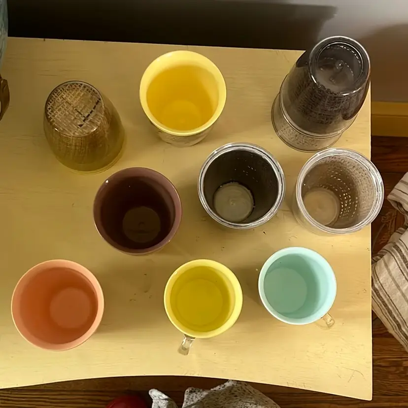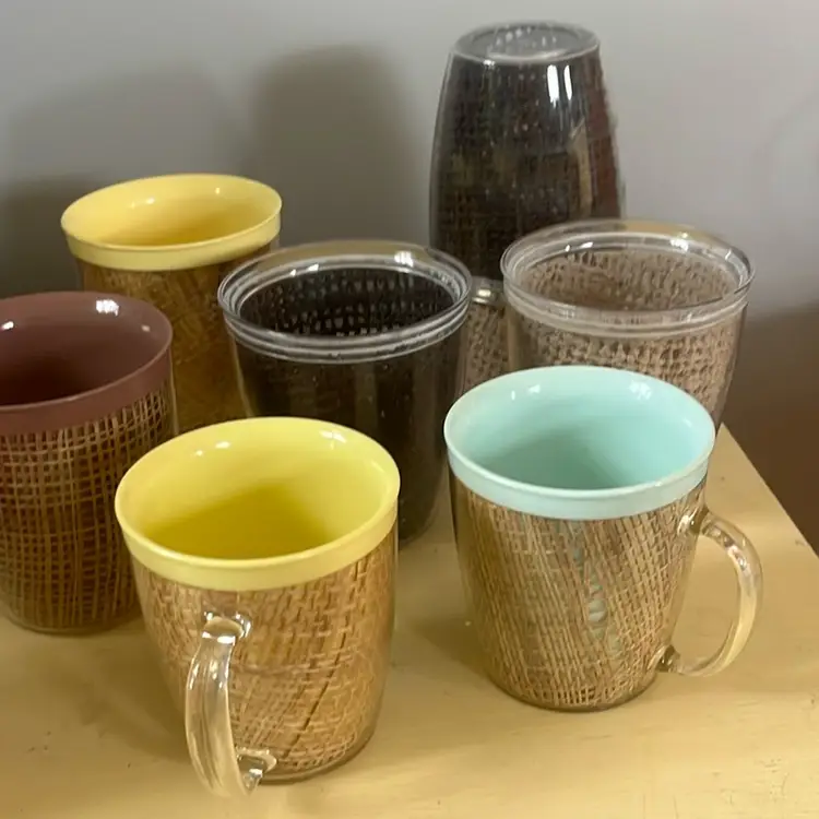 (2) raffia mugs yellow and blue. 3.75” tall. (4) raffia cups 2 yellow, 1 brown & 1 peach. (4) burlap 2 beige and 2 brown. 4” tall. Burlap marked made in USA on bottom. Nice thick plastic. Just in time for summer entertaining