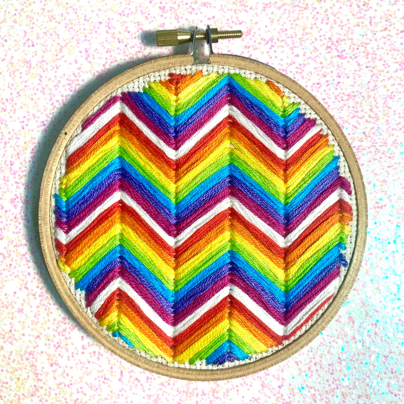 Hand-stitched embroidery hoop art, featuring vibrant rainbow zig-zag pattern. Measures 4" across