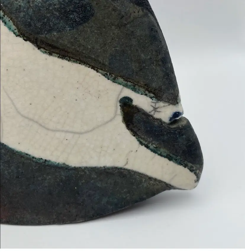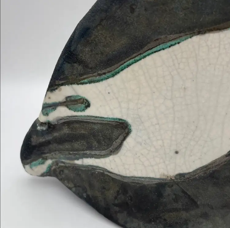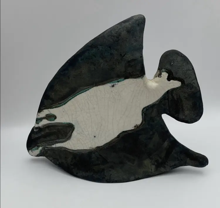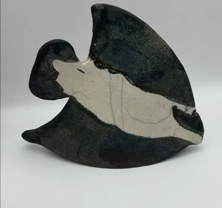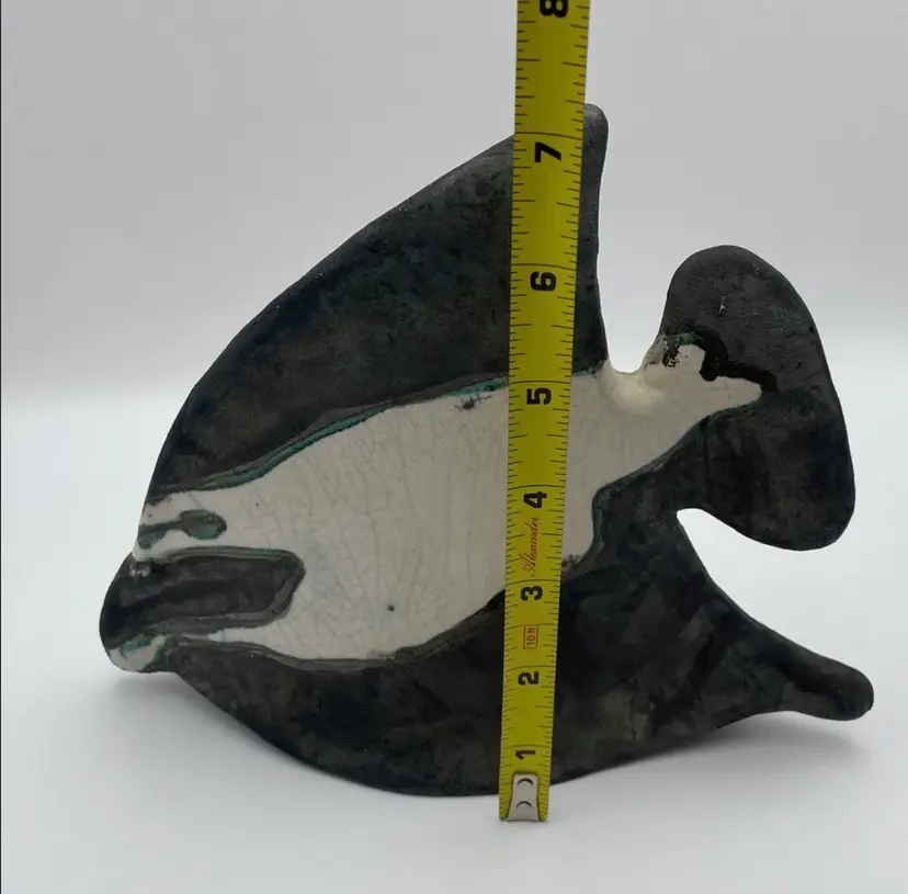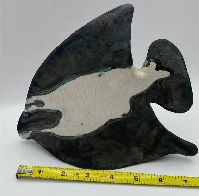 Raku Fired Pottery, Angel Fish, Black Iridescent with White Crackle Glaze and Green Accent, 7.5” Long. Beautiful Piece! Please see pictures for measurements.