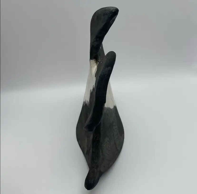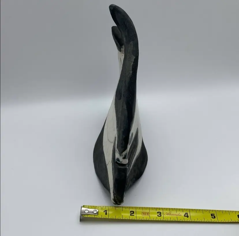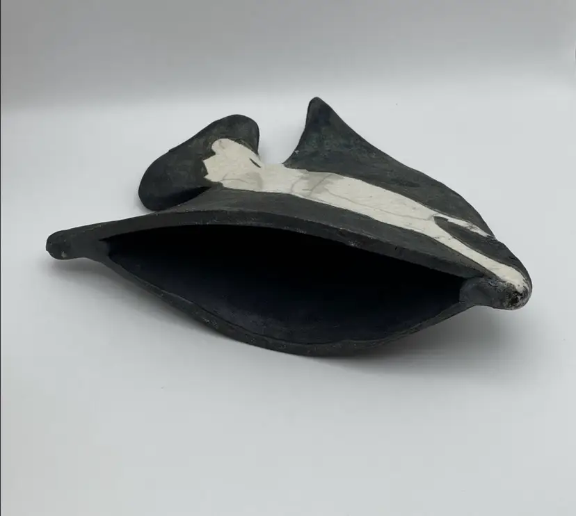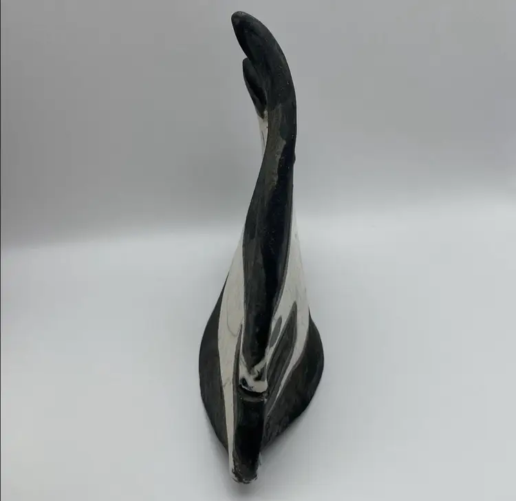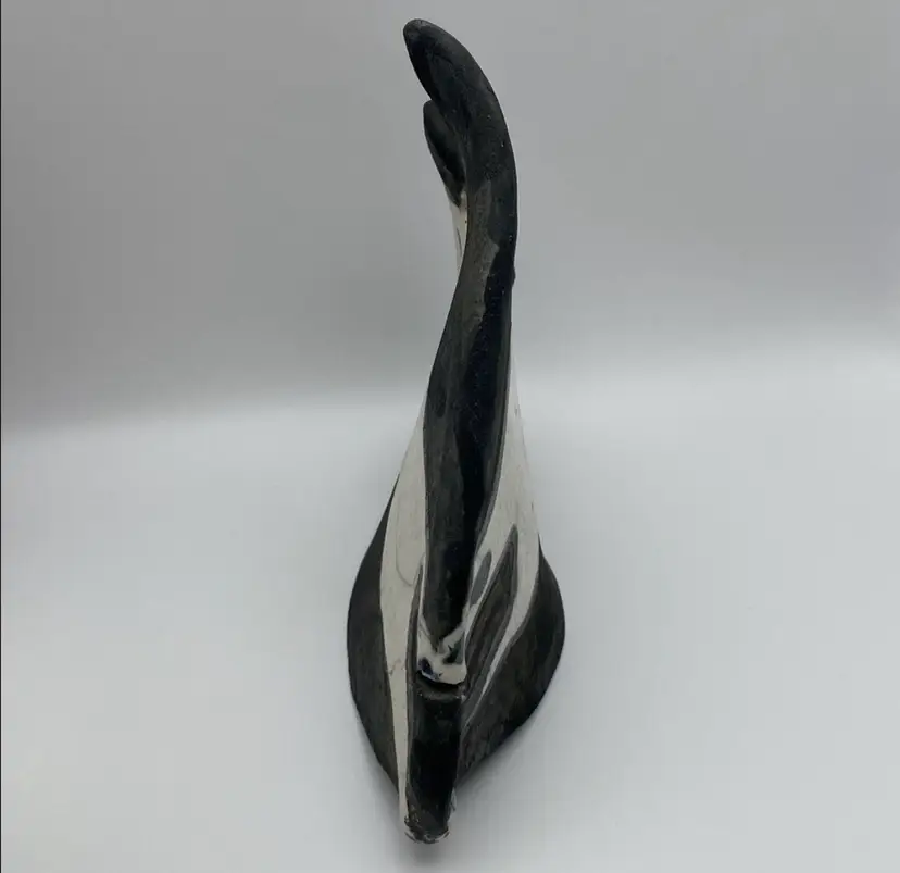 Raku Fired Pottery, Angel Fish, Black Iridescent with White Crackle Glaze and Green Accent, 7.5” Long. Beautiful Piece! Please see pictures for measurements.