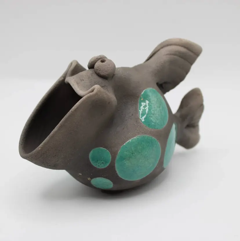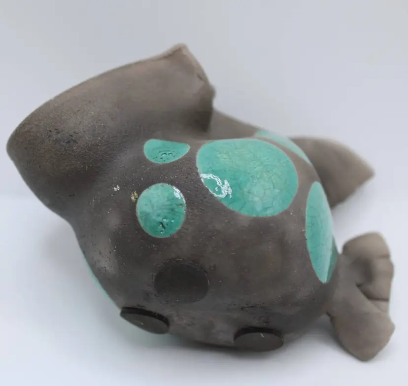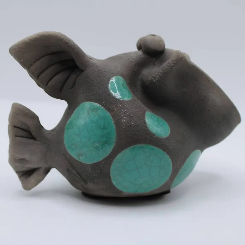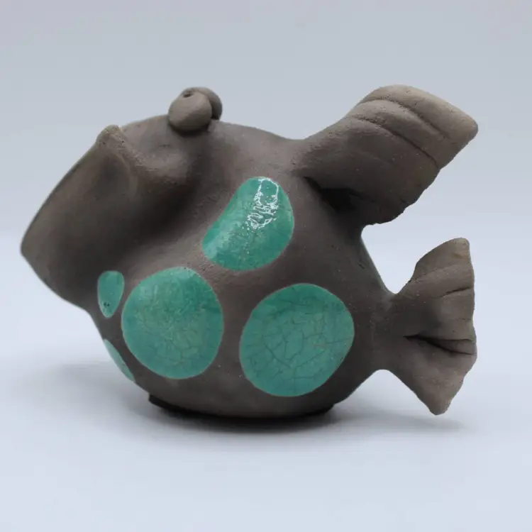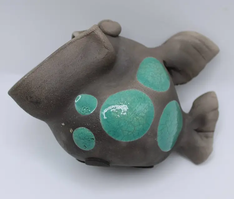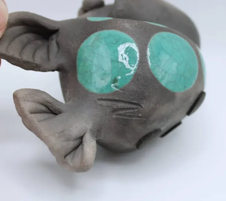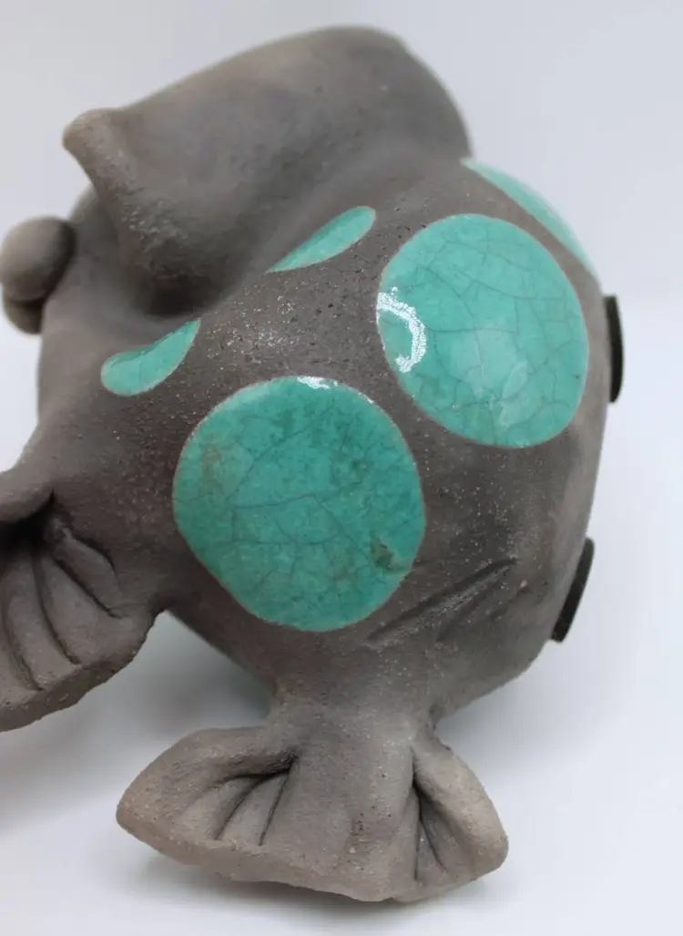 Fun and derpy Raku pottery fish created and signed by artist Nina Fernstrom-Duong of Happy Raku Fish. Measures 4 1/4" long x 2" wide x 3" tall.