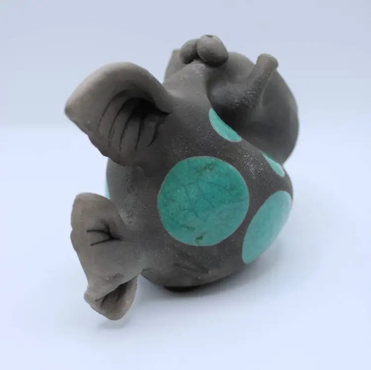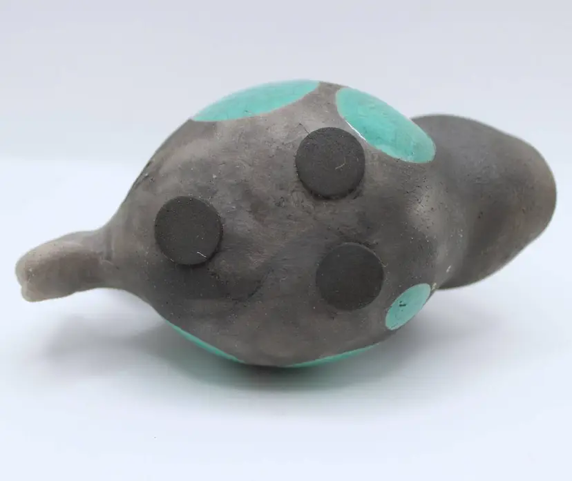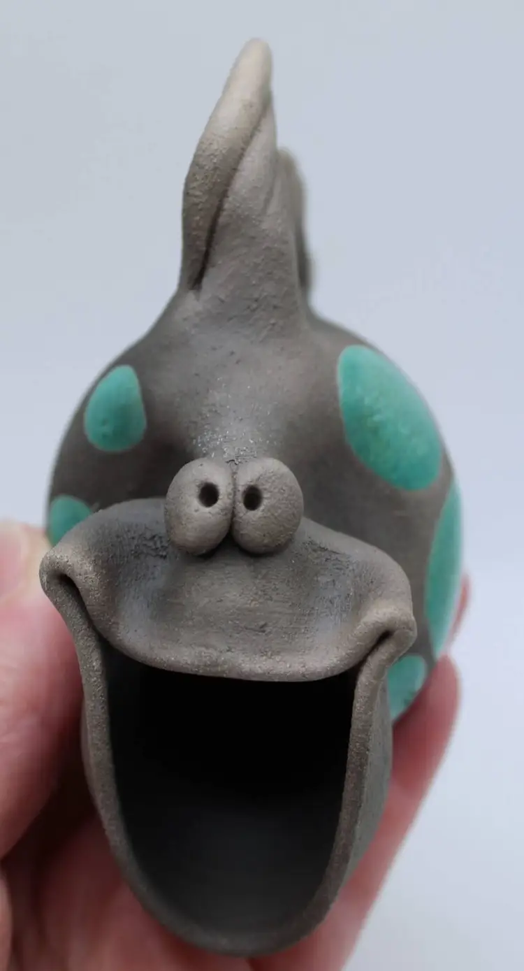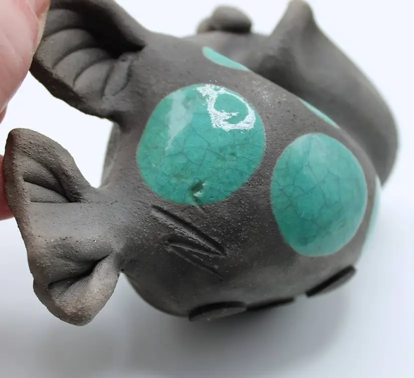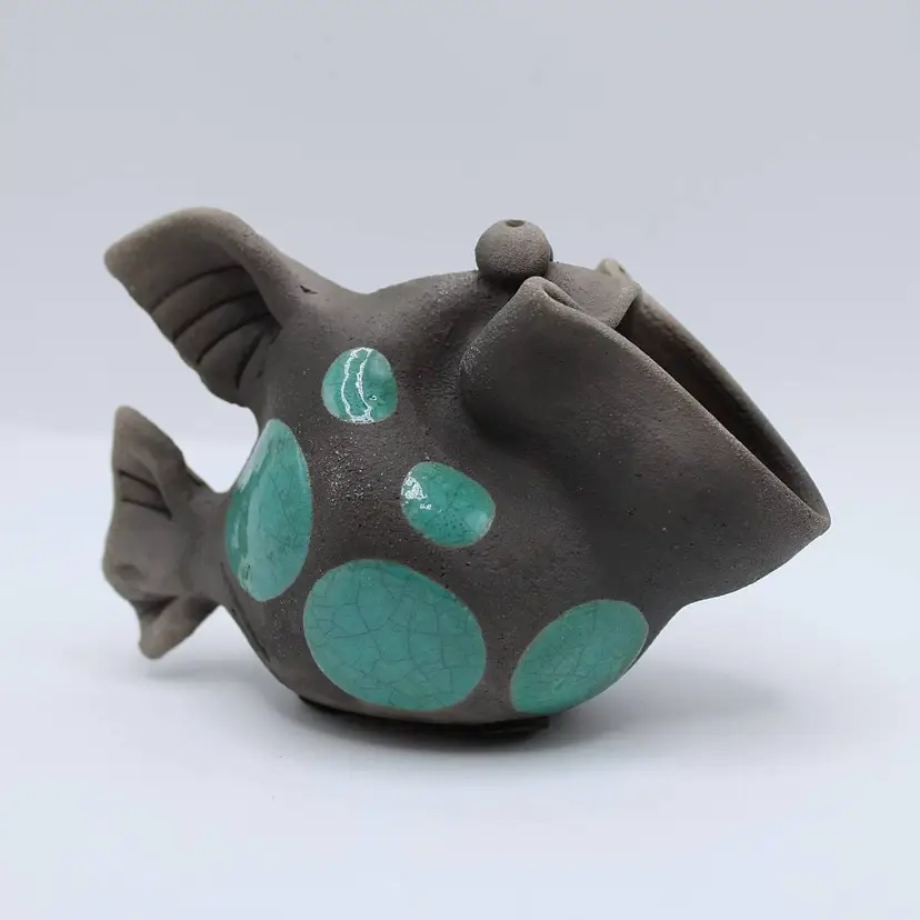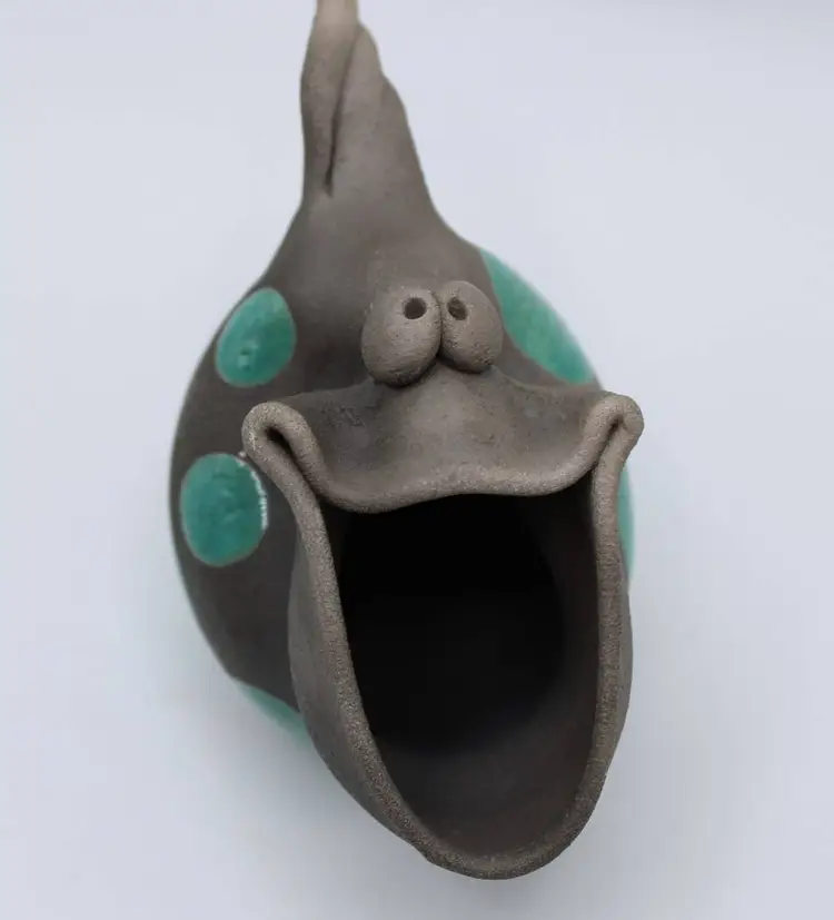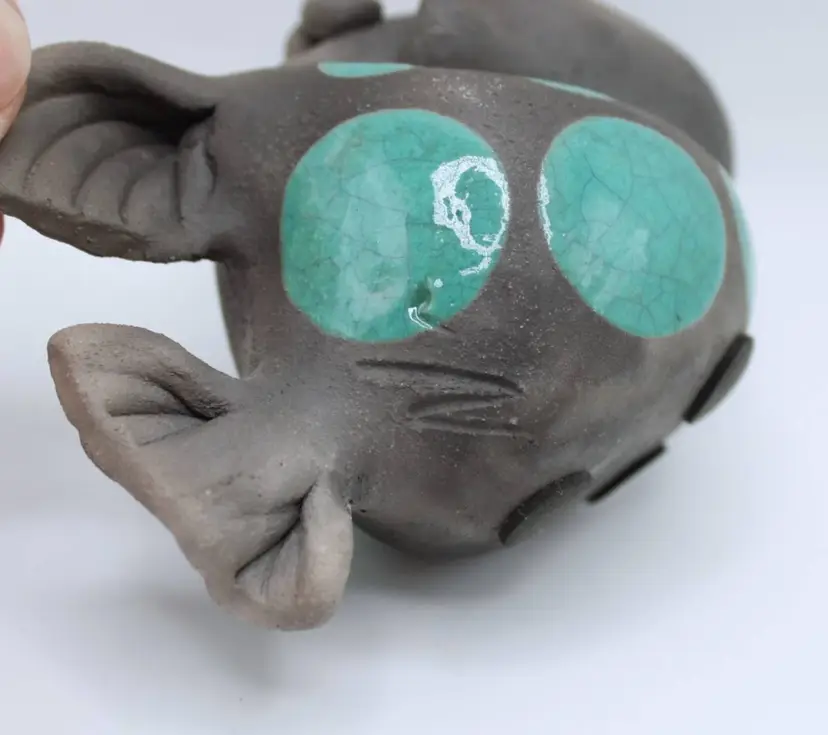 Fun and derpy Raku pottery fish created and signed by artist Nina Fernstrom-Duong of Happy Raku Fish. Measures 4 1/4" long x 2" wide x 3" tall.