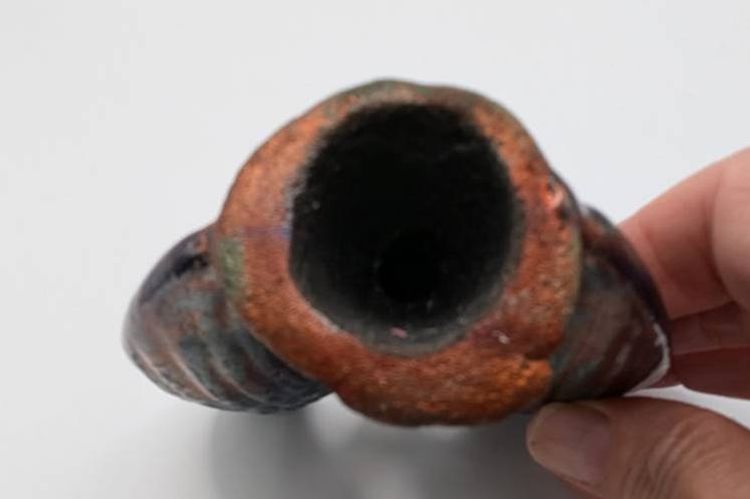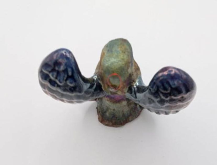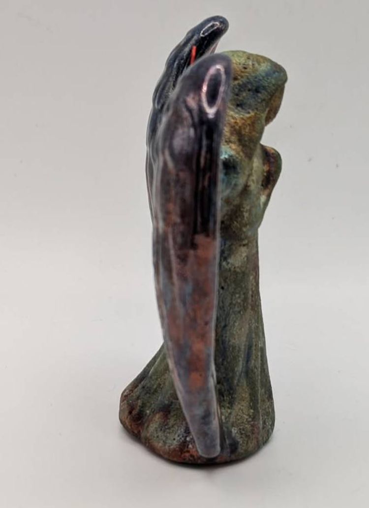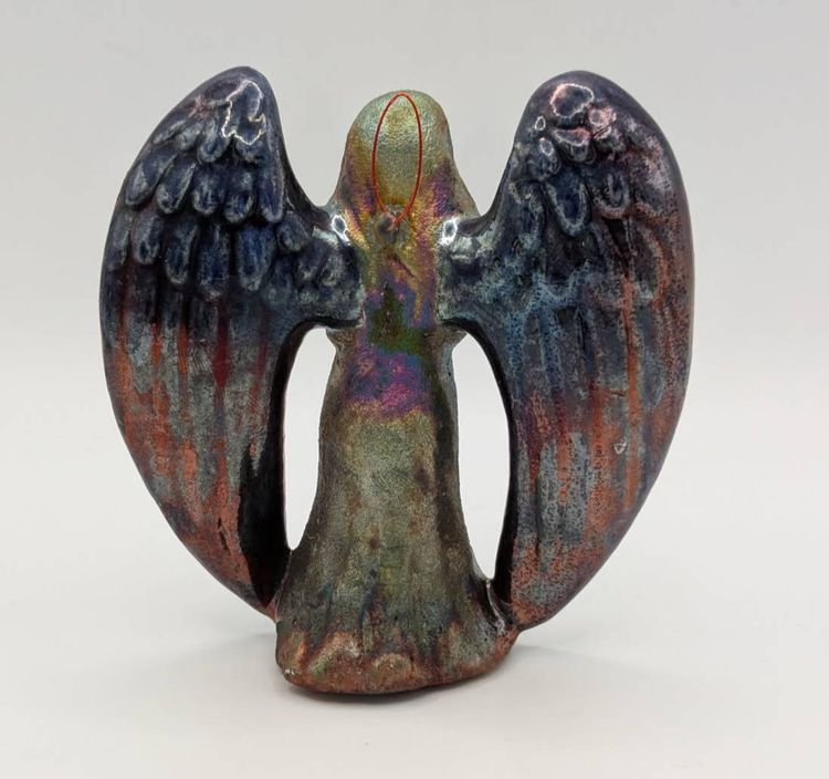 This is a Raku Fired piece of pottery int he shape of an Angel. It has a hanger on backside- I used it as an ornament, but it is free standing. Unsigned- not sure why!