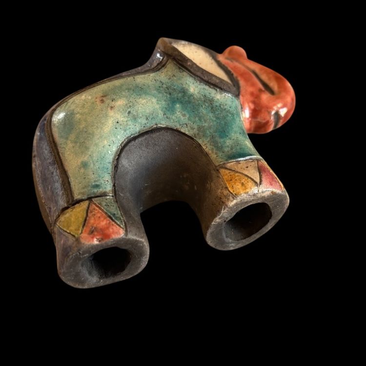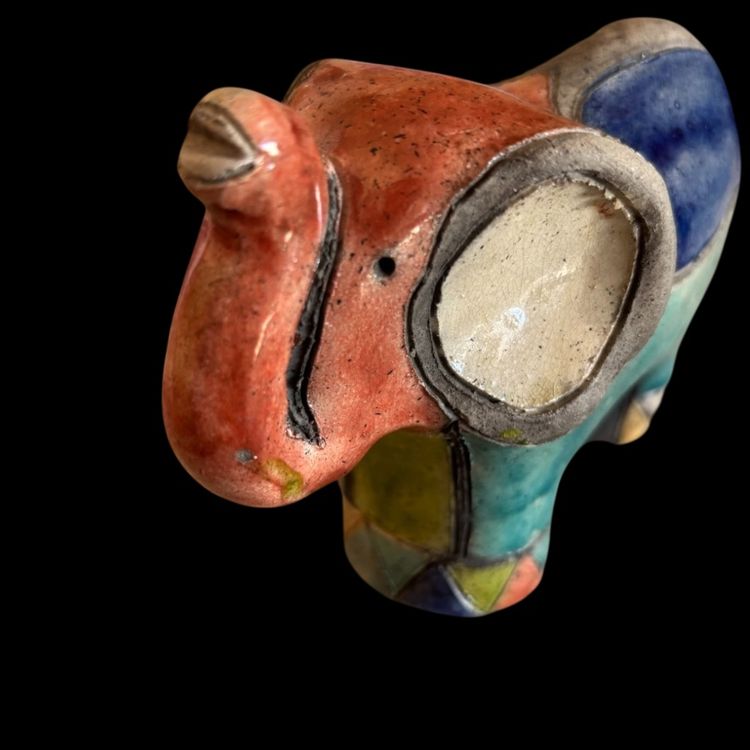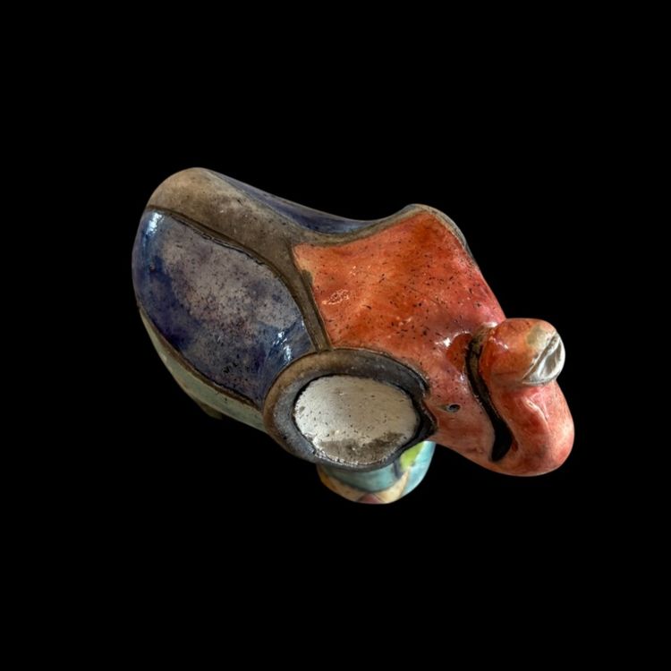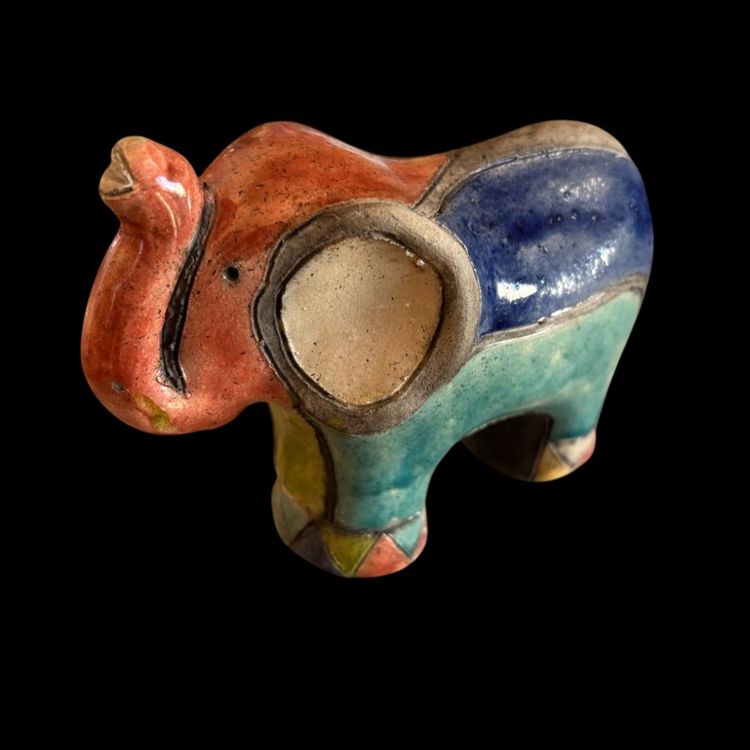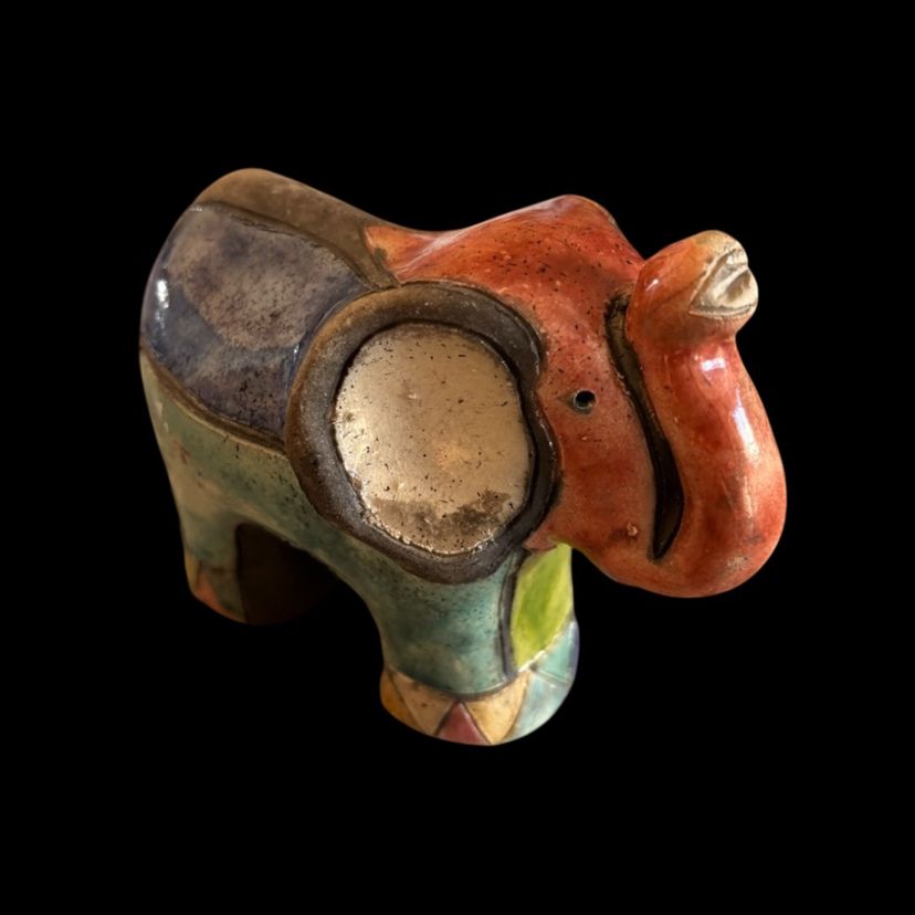 Colorful rake pottery elephant. No chips or cracks, has a glaze I perfection as seen on trunk. 4.5x2x3.75”