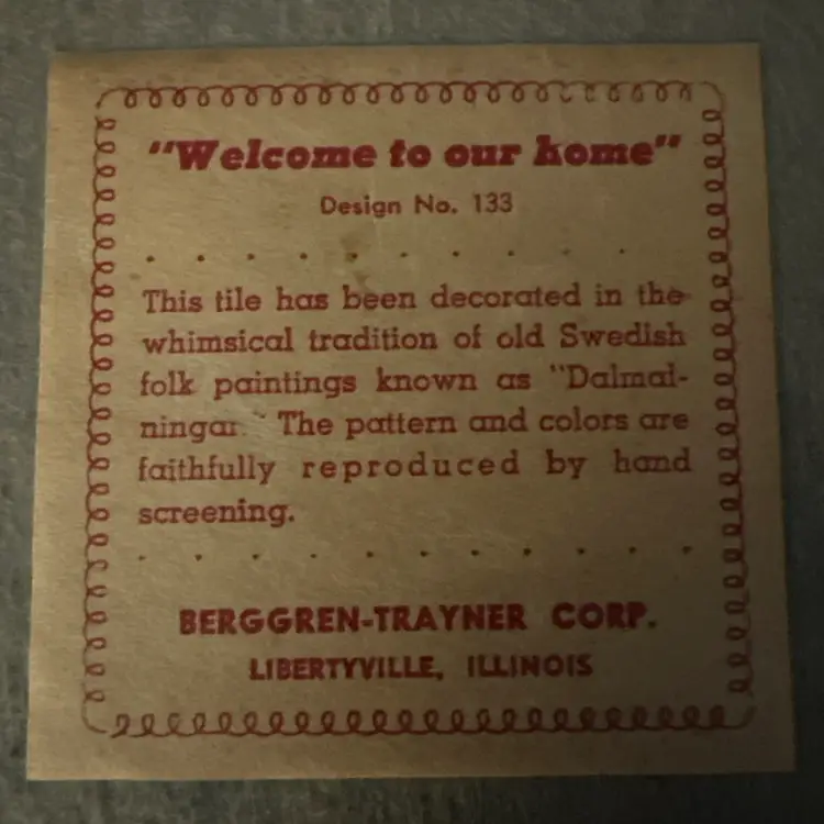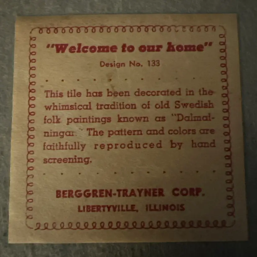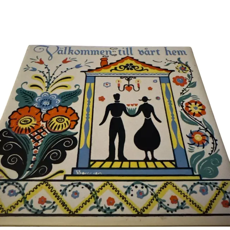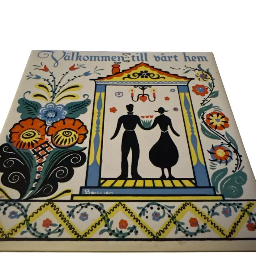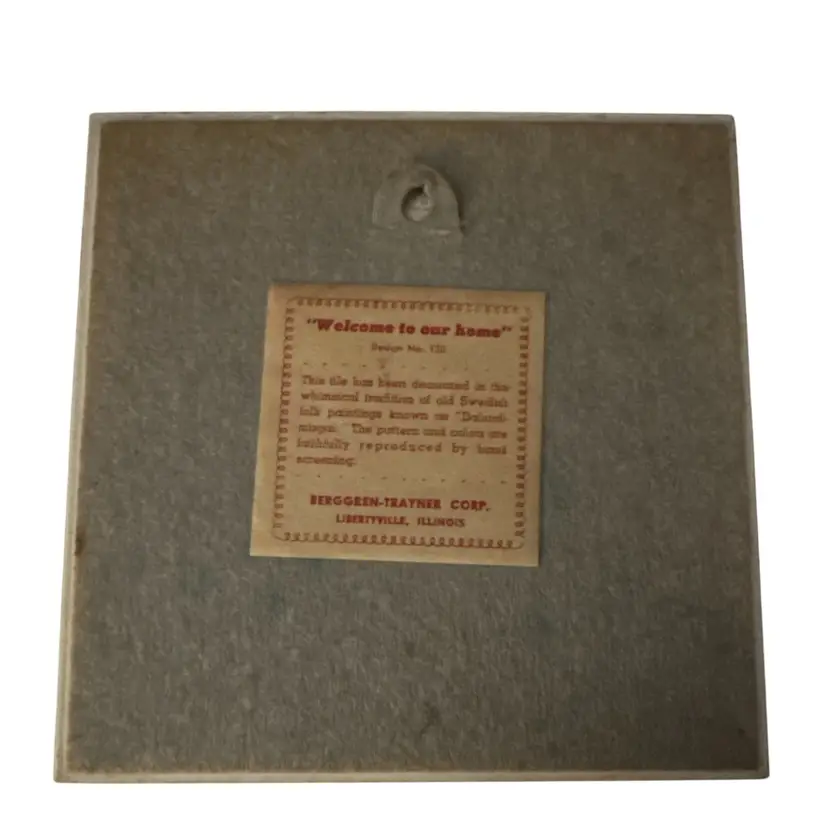 This rare Berggren Original “ Welcome to our home” Swedish style Ceramic Tile 1955 Trivet features a unique design inspired by old Swedish folk art. Handcrafted in the United States, in the ‘50’s this multicolor trivet is made of glossy ceramic and measures 6 inches in length and width. It is hangable and adds a charming touch to any kitchen or dining area with its vintage appeal. Perfect for serving hot dishes or as a decorative piece, this trivet is a standout piece for collectors of traditional Swedish design. Excellent condition, no chips , cracks or scratches.
