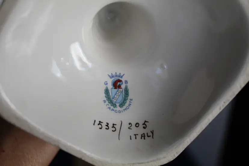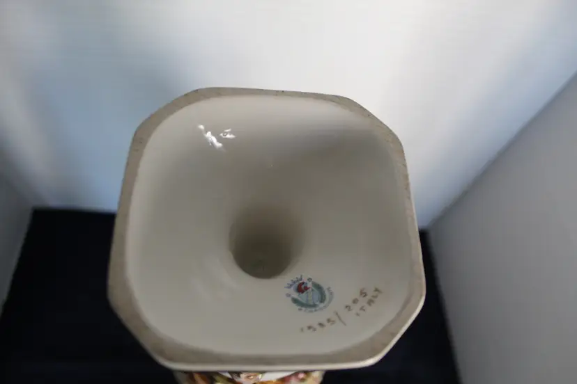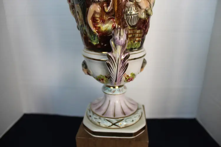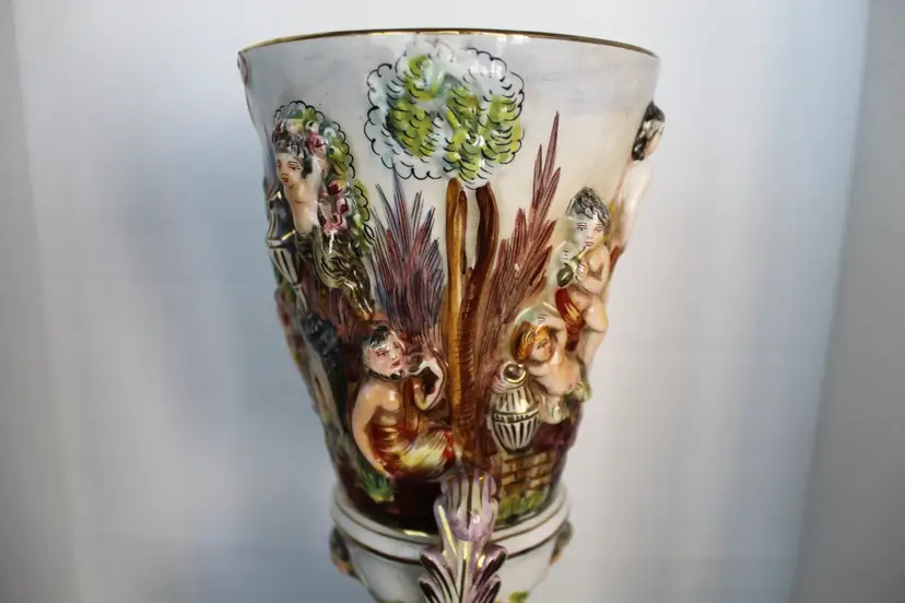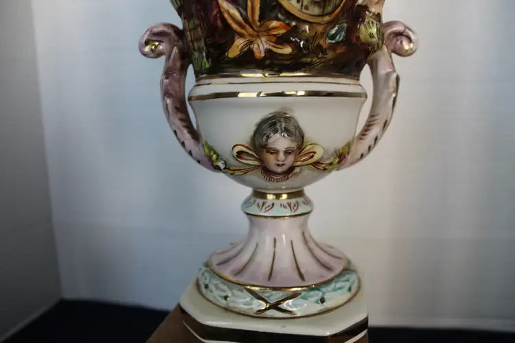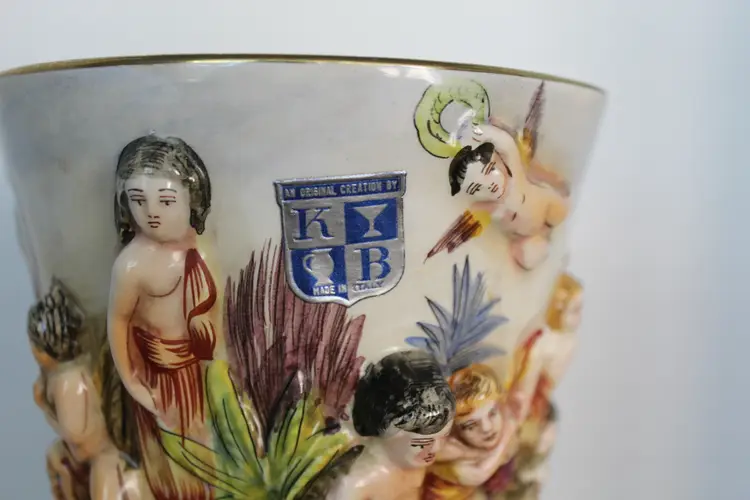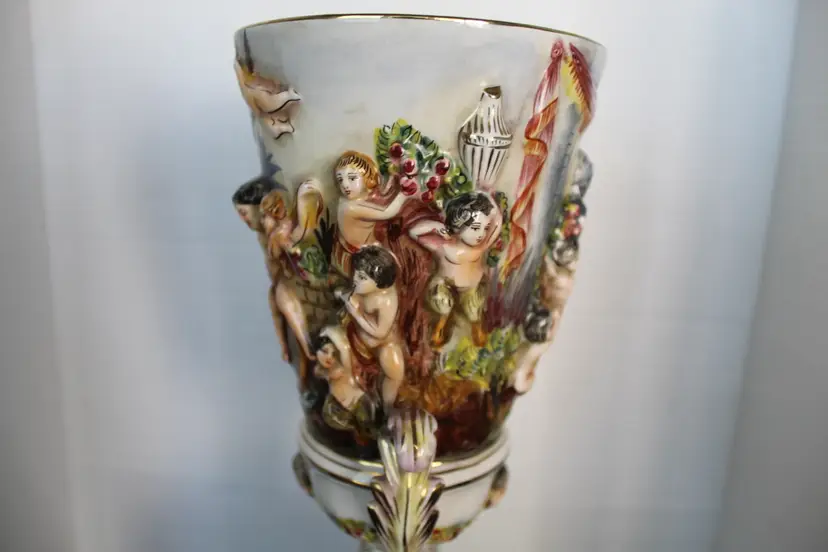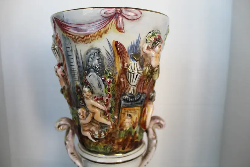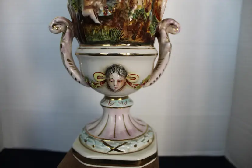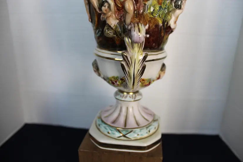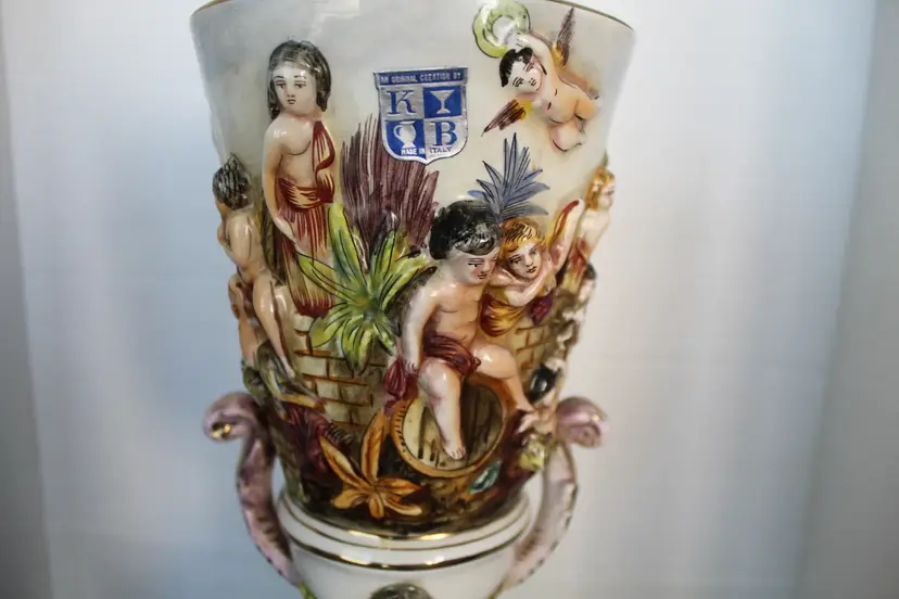The product is a rare Capodimonte porcelain vase featuring 17 embossed cherubs and a square pedestal. This vase, showcases an Italian style with a multicolor design. Made in Italy during the 1950s, this decorative collectible piece is perfect for all occasions and would make a unique addition to any collection. The cherub theme and porcelain material add a touch of elegance and charm to any space. Original stamp and gold writing stating 1535/205 Italy on the bottom of base.