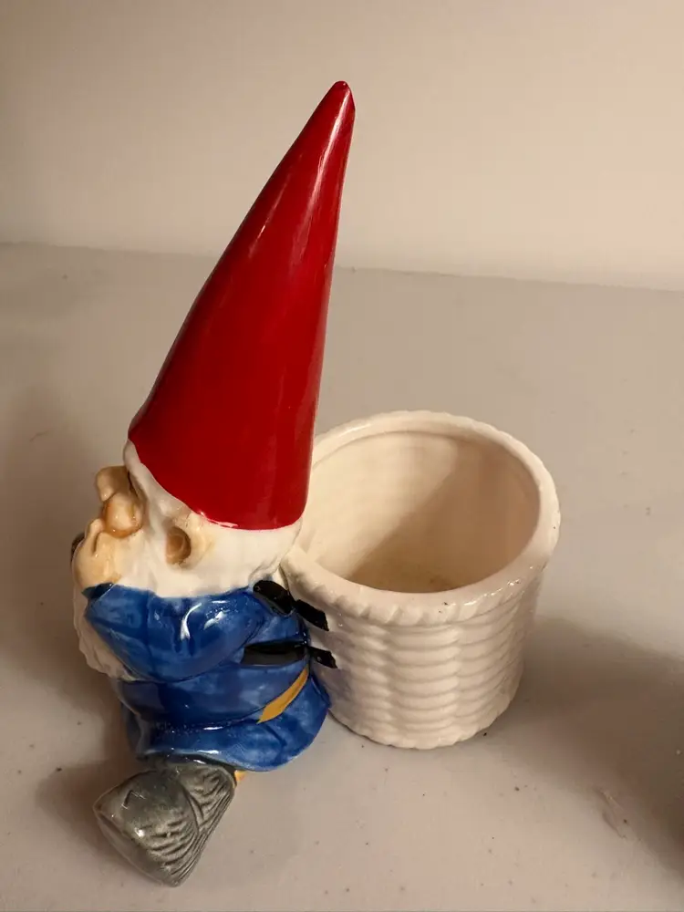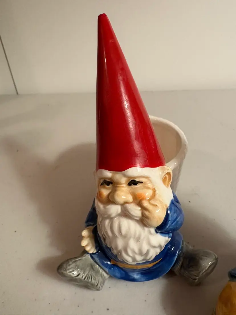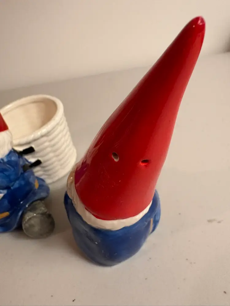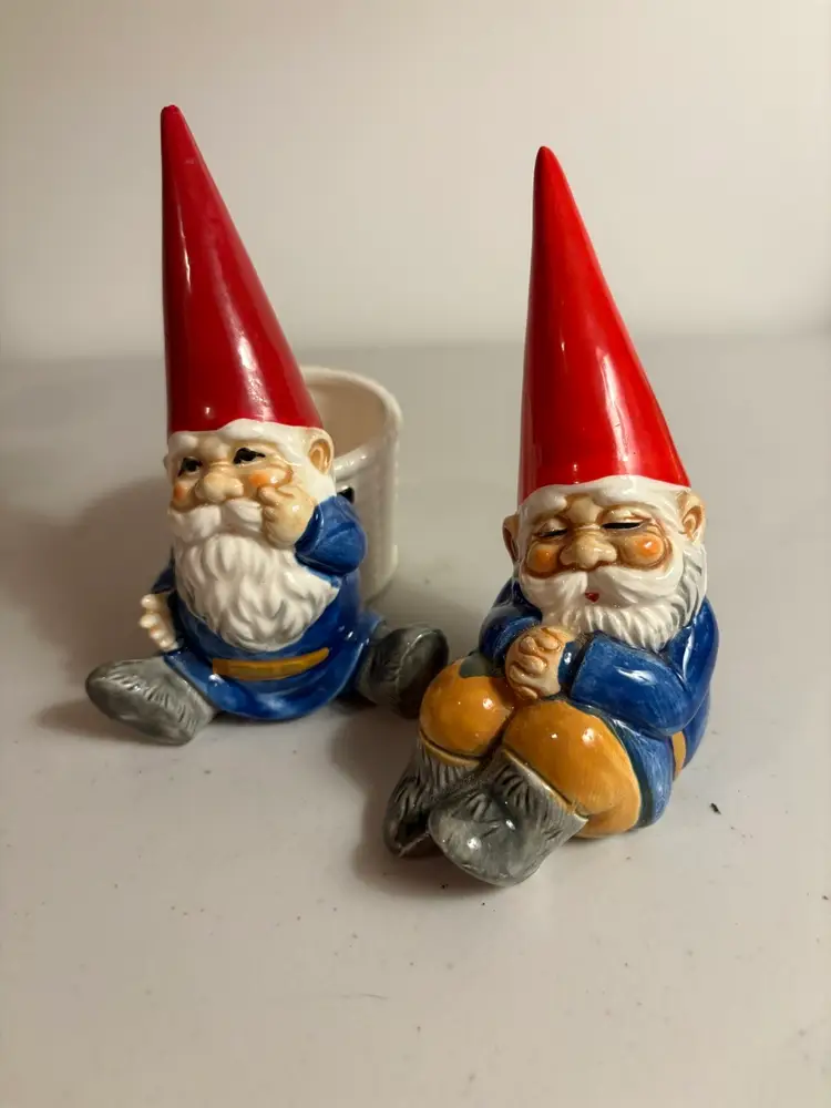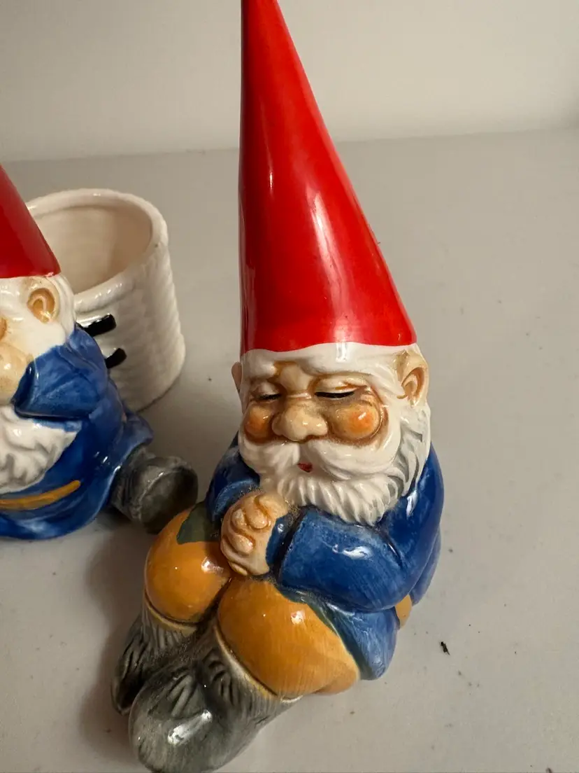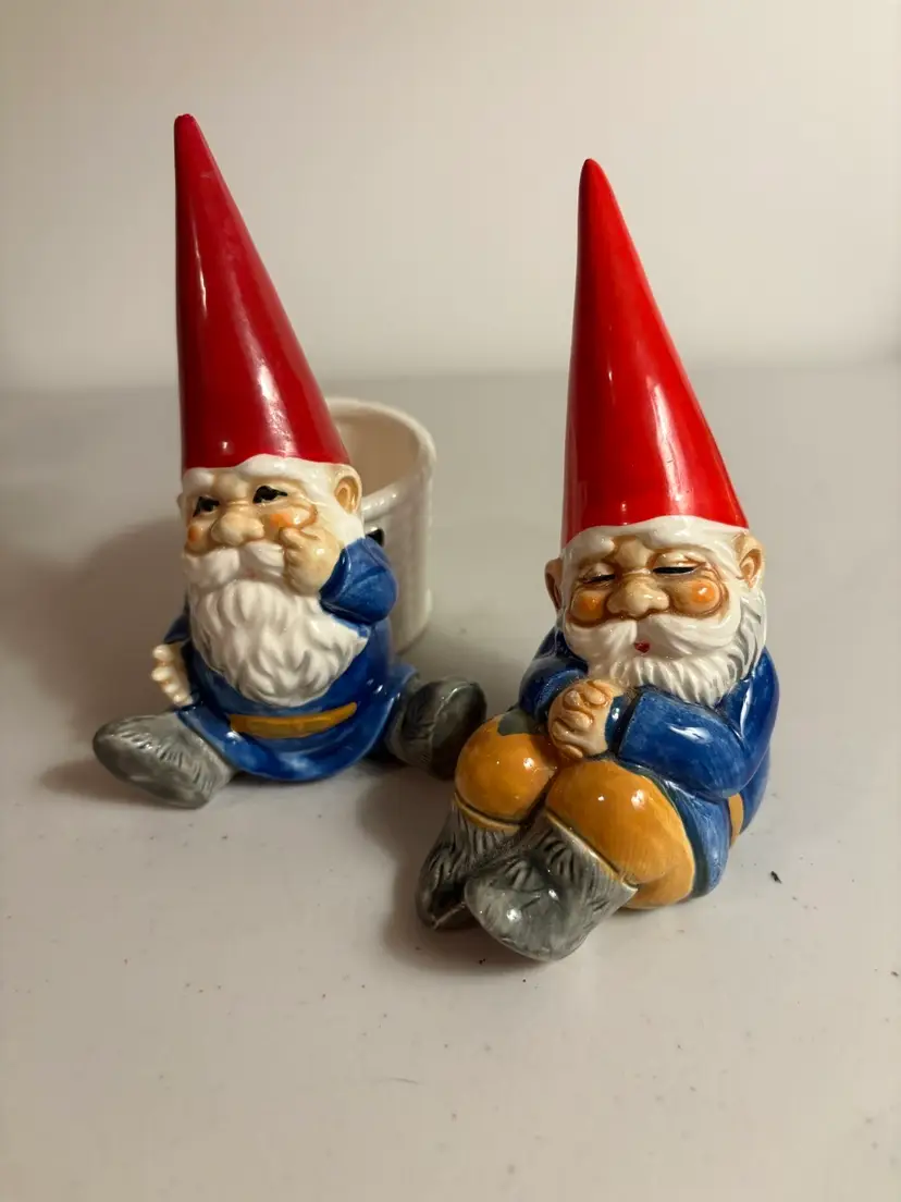 This vintage Unieboek Gnomes Set includes two rare figurine salt cellar and pepper shaker items. Made of porcelain and featuring a novelty shape, these gnome-ornamented salt and pepper shakers are perfect for all occasions. Standing at 5 inches tall and with a whimsical fantasy theme, these collectible items are a unique addition to any kitchen or home decor. The colorful multicolor design, along with the gnome character, adds a touch of fun and charm to meal times. Made in Japan during the 1970s, this original set by Unieboek B.V. is sure to be a conversation starter.