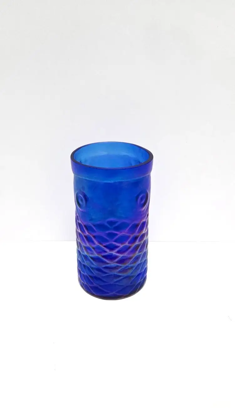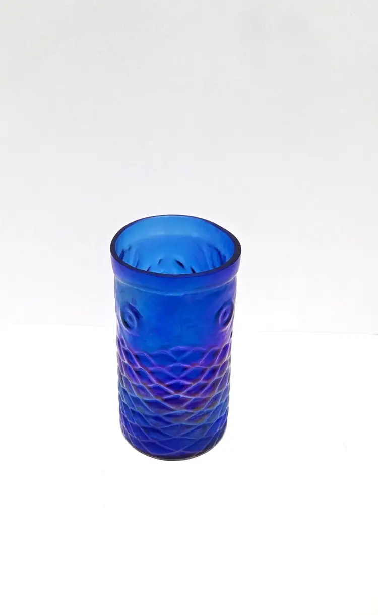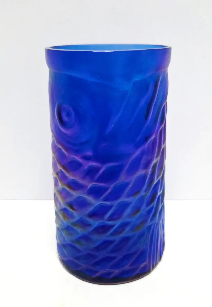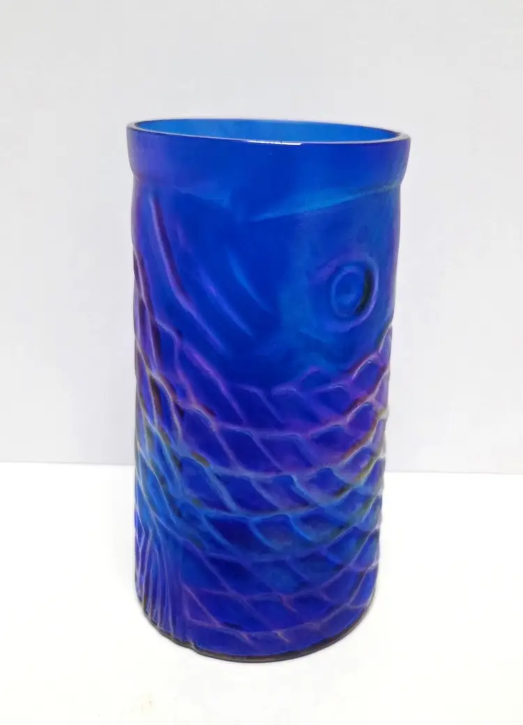 John Cook blown glass koi fish tumbler. Cobalt blue art glass. Purple iridescence. Artist signed. Fish scale design and fish eyes. Good condition, as seen in photos.