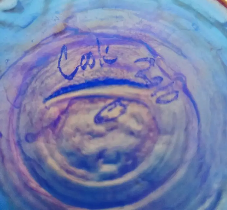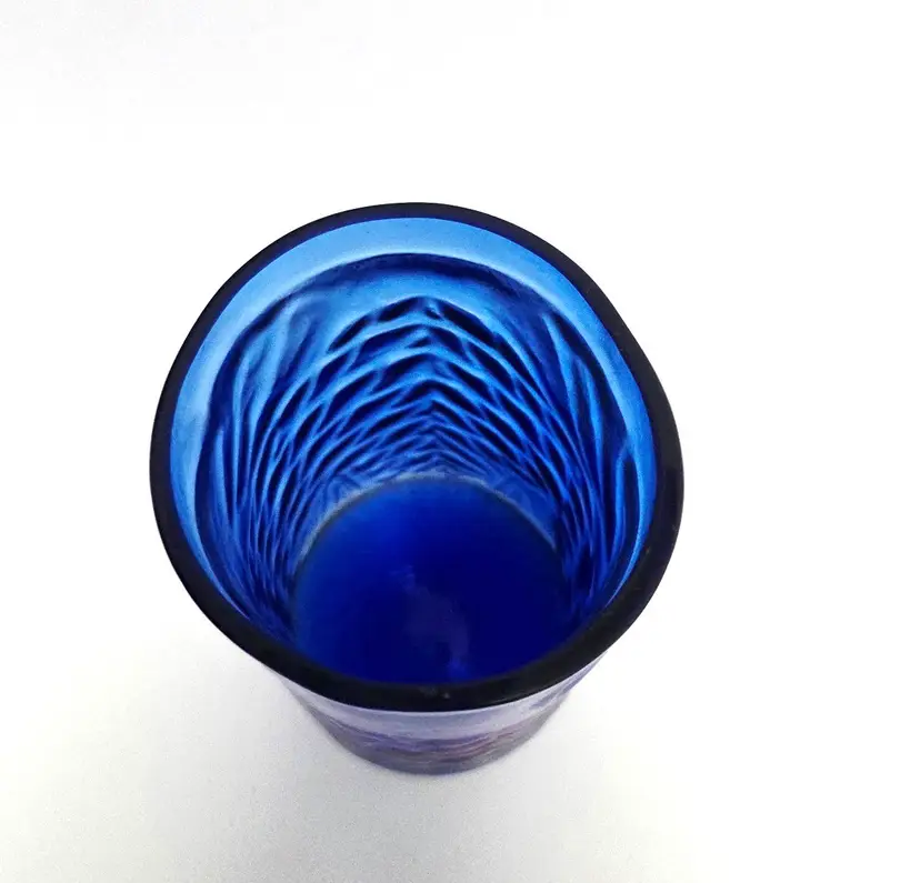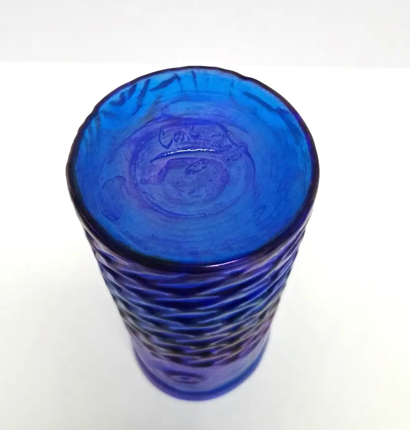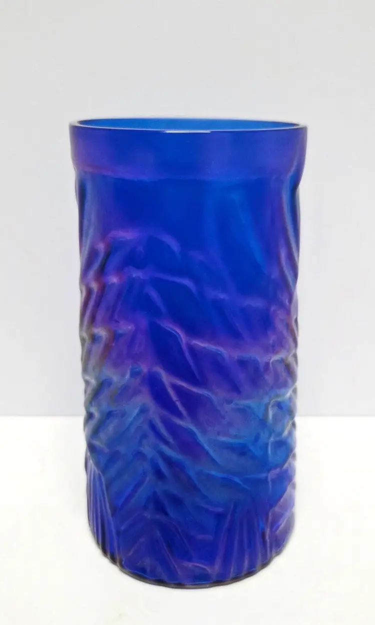 John Cook blown glass koi fish tumbler. Cobalt blue art glass. Purple iridescence. Artist signed. Fish scale design and fish eyes. Good condition, as seen in photos.