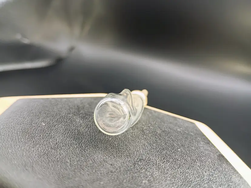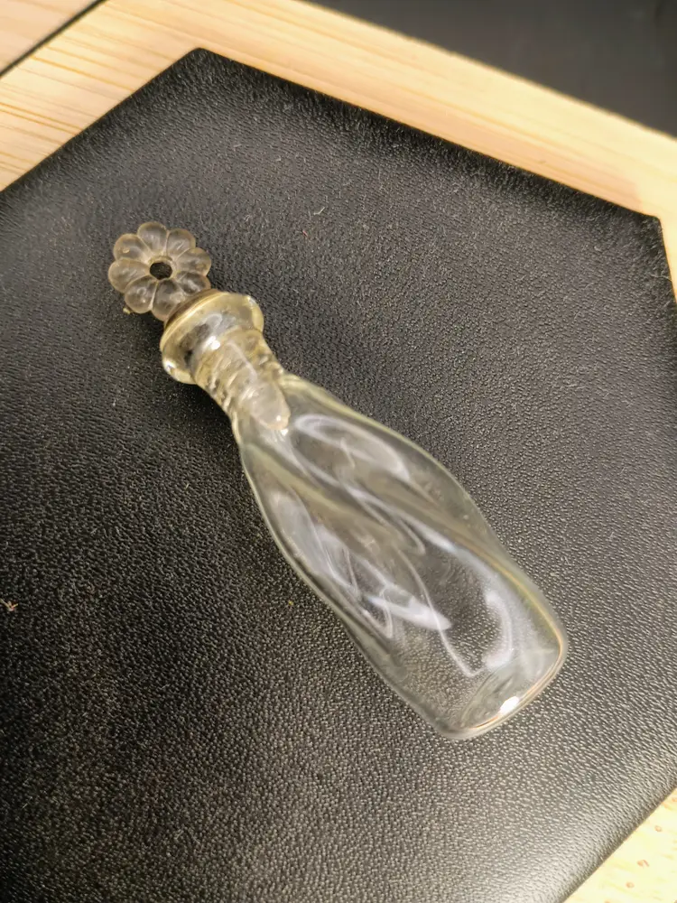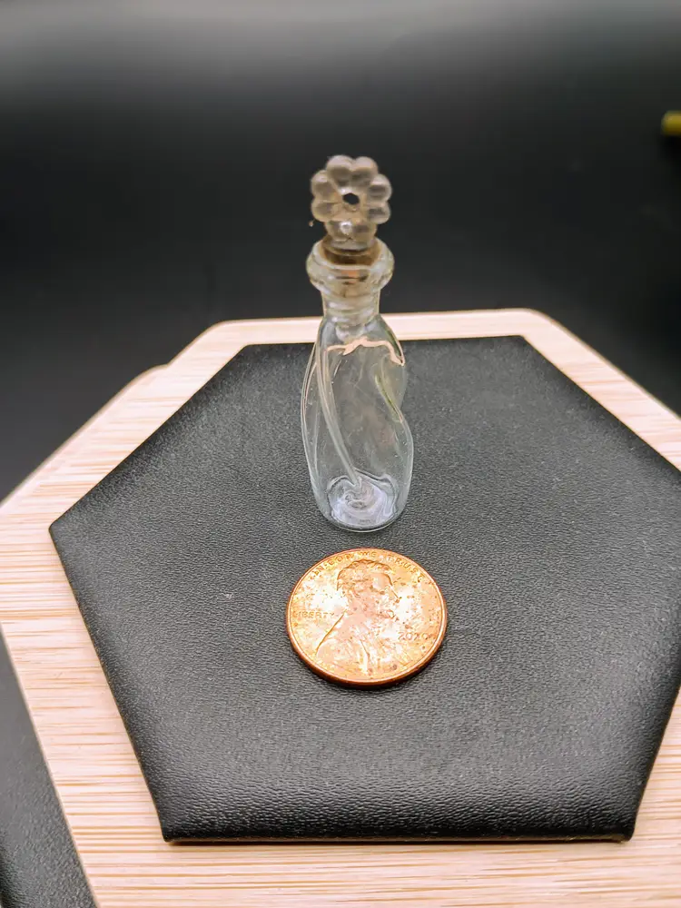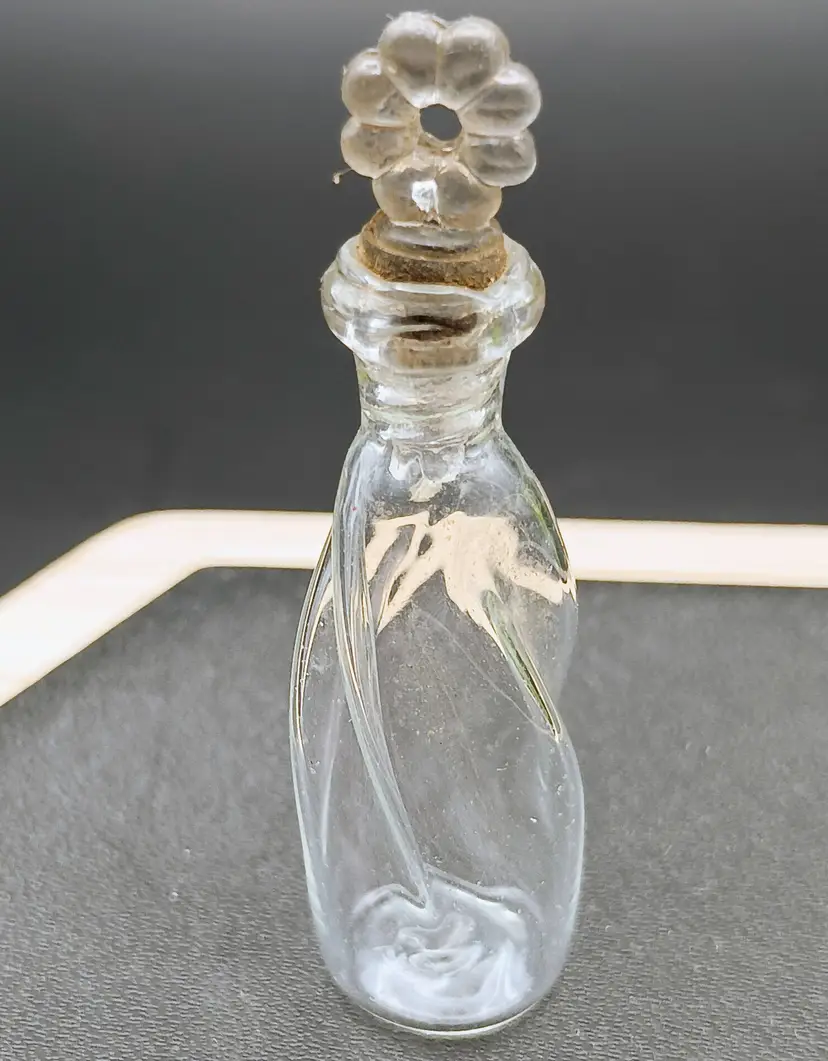 In this lot you will receive one handblown glass tiny perfume bottle. This is an original stock item which means it never had perfume in it. This tiny beauty is twisted design with a threaded glass dot stopper perfect for hanging on a chain. This glass bottle is approximately 1.75 inches long.