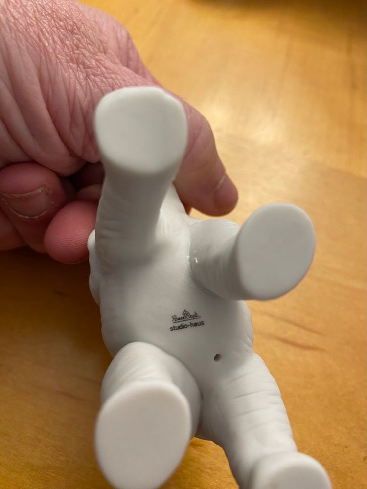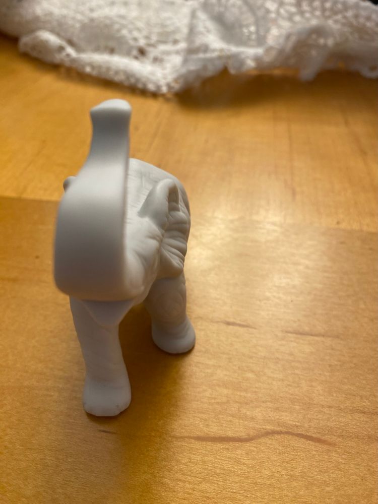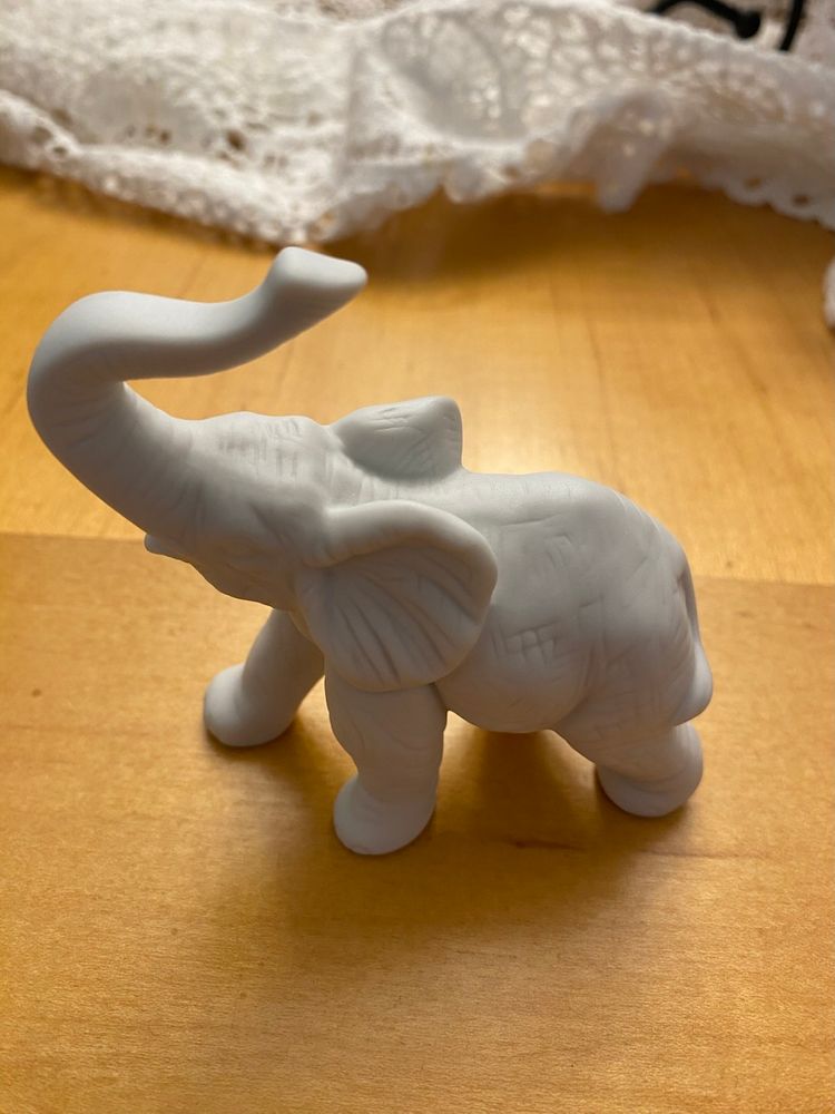 This is a rare and stunning Rosenthal Studio-Haus white bisque porcelain elephant figurine in pristine condition. Rosenthal Studio-Haus produced a menagerie of bisque porcelain animals, including elephants, in the 1970s. The matte effect of the bisque porcelain gives it a distinct appearance. The piece is approximately 4 inches and is clearly marked Rosenthal-Haus on the underside of the elephant (see photo). Elephant figures can symbolize peace and happiness in some cultures. This elephant sells at auction between $100-$200.