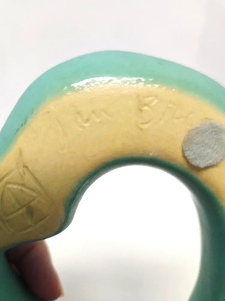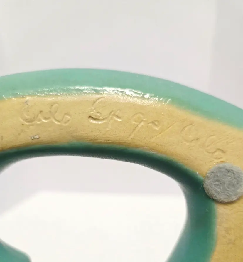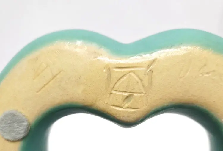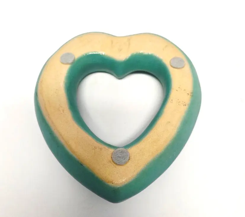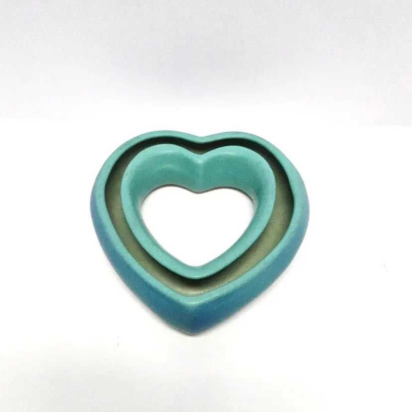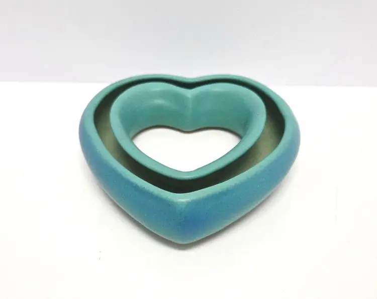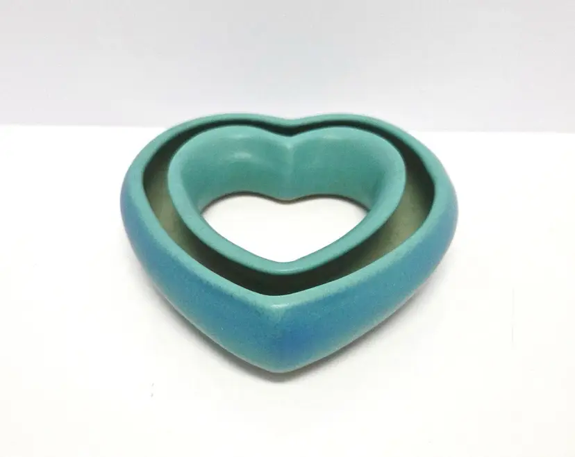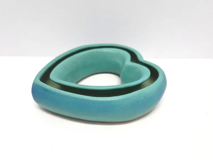 Rare VAN BRIGGLE pottery. Heart-shaped pansy bowl. Green and blue. Smooth texture. Artist signed. Calo. Good condition, as seen in photos.