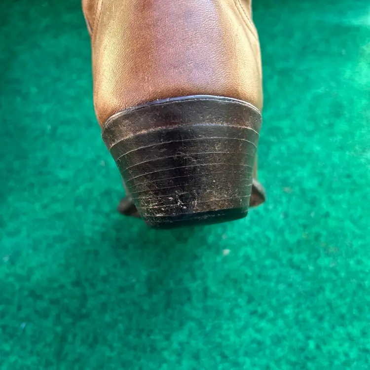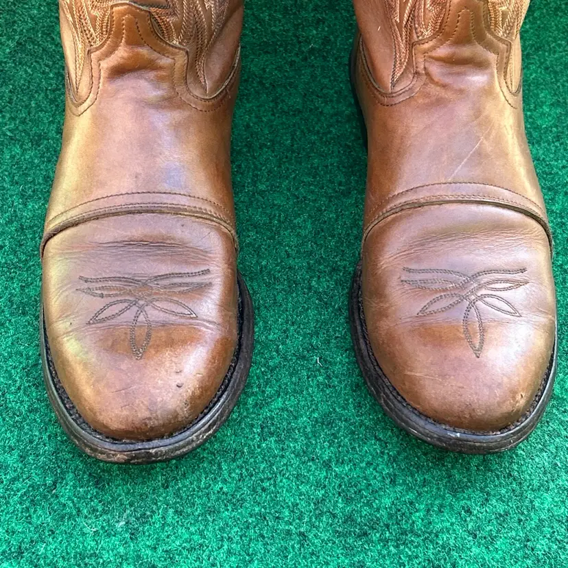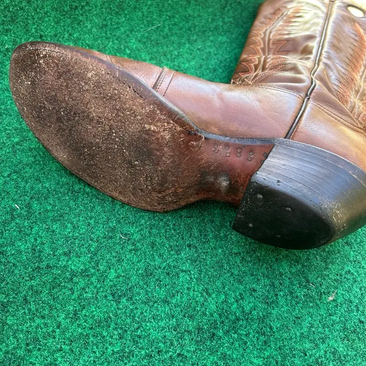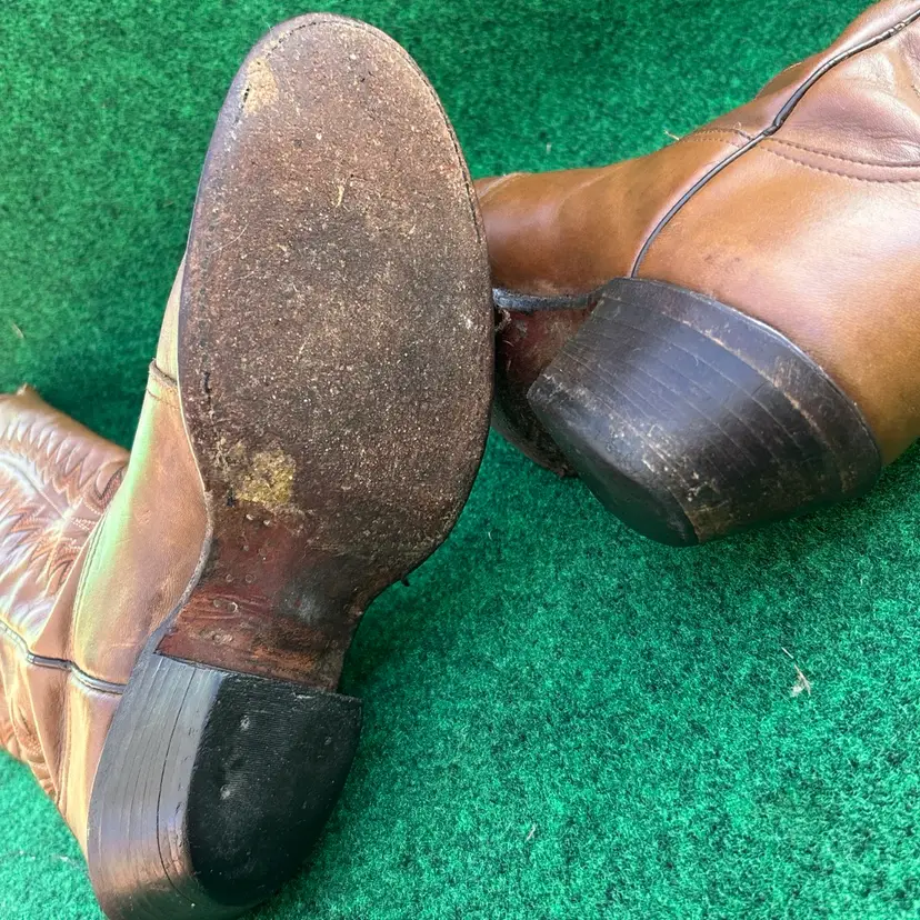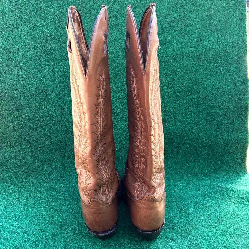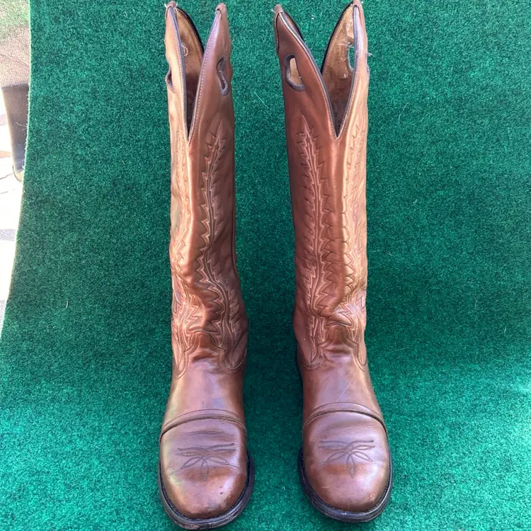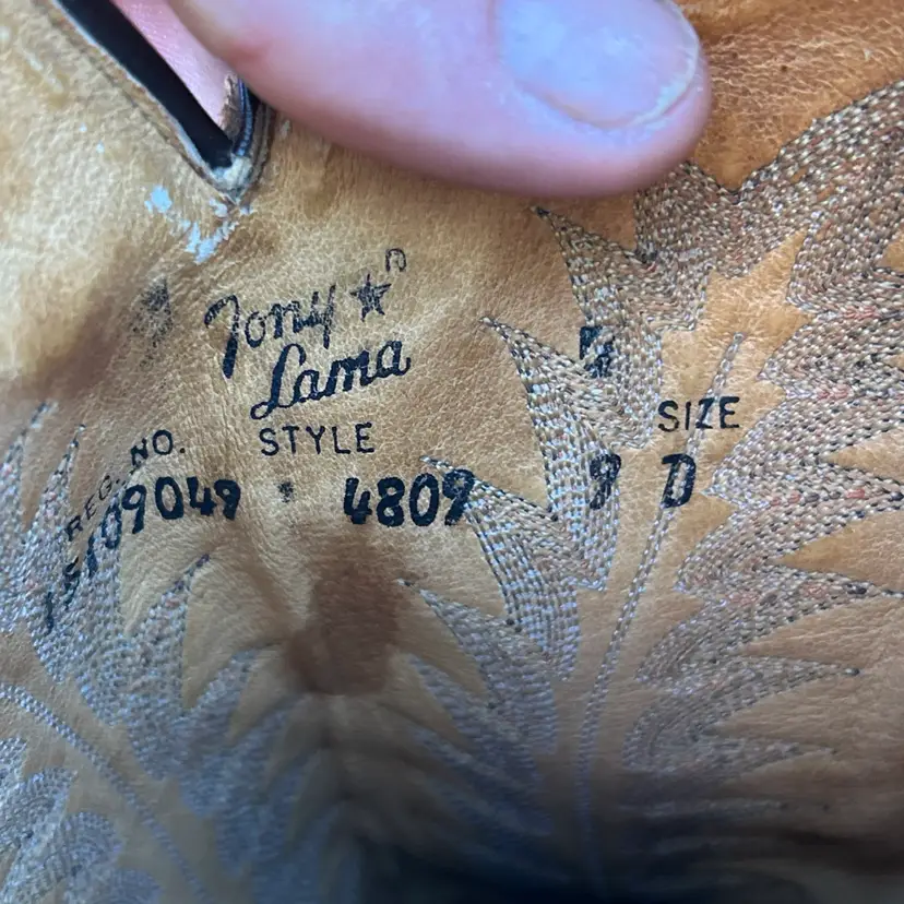 The product is a rare vintage pair of Tony Lama 18” Size 9D Buckaroo Cowboy Boots in a 4809 Punchy USA style. These boots feature a pull-on closure, leather upper and lining, and a mid-calf shaft style. They are designed for comfort with arch support, cushioning, and spur compatibility. Handmade in the United States, these limited edition boots are perfect for those who appreciate Western style and cowboy themes. The brown color and embroidered logos add a unique touch to these classic yet stylish boots.