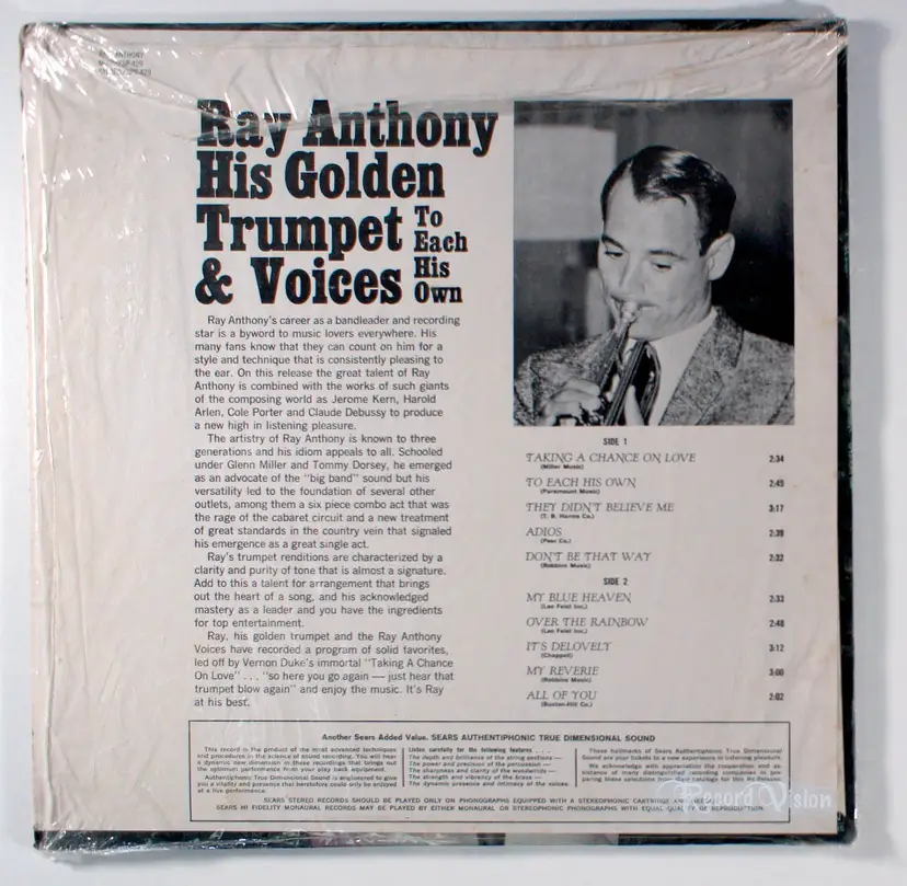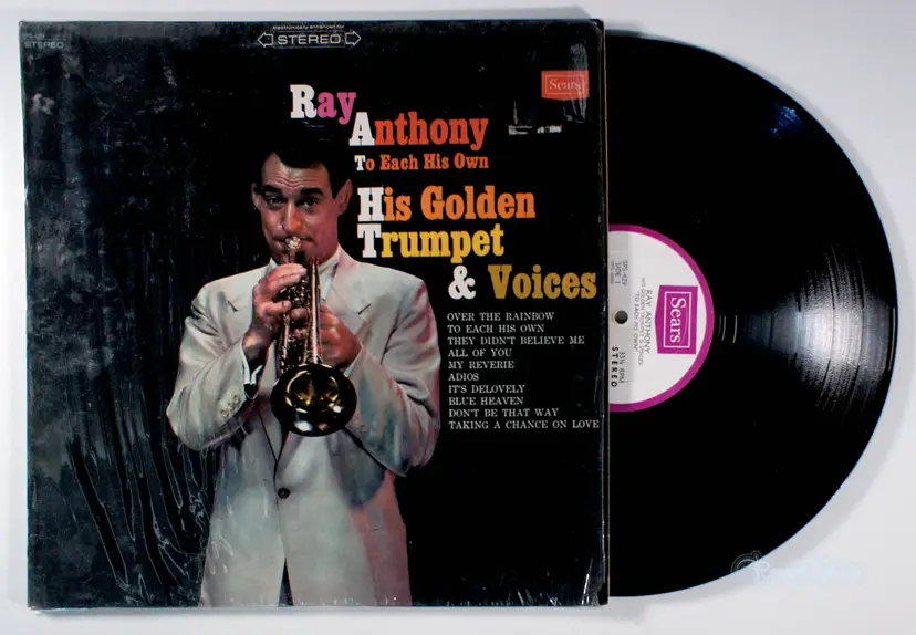 To Each His Own, is a 1966 album by Ray Anthony and his orchestra, was released by Sears in stereo and mono, featuring a collection of jazz-inflected big band renditions of standards like Taking a Chance on Love, Over the Rainbow, and the title track To Each His Own, originally a 1946 Oscar-winning song by Jay Livingston and Ray Evans. Recorded during a period when Anthony, the last surviving member of Glenn Miller’s orchestra, was adapting his swing style to the mid-1960s lounge and MOR (middle-of-the-road) trends, the album reflects his effort to maintain big band relevance amidst rock music’s dominance. The tracklist, including Cole Porter’s It’s Delovely and All of You, showcases Anthony’s signature trumpet and lush arrangements tailored for nostalgic listeners, with Sears’ “Authentiphonic True Dimensional Sound” branding emphasizing its stereo quality. Historically significant for its release under Sears’ budget label rather than Capitol, where Anthony had recorded over 40 albums, it marks his pivot to accessible, department-store distribution during a transitional phase post his 1961 divorce from Mamie Van Doren. No hit singles emerged from this album, as Anthony’s chart success had faded since his 1950s peaks with Dragnet and Peter Gunn.