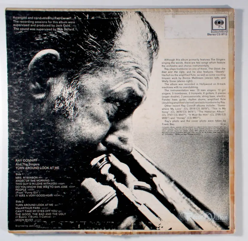 Turn Around Look at Me, is a 1968 album by Ray Conniff and The Singers, featuring lush, easy-listening arrangements of contemporary pop hits from the late 1960s, including covers of tracks like This Guy's in Love with You. Produced by Jack Gold and released on Columbia Records, the album exemplifies Conniff's signature style of blending orchestral elements with a mixed chorus of 12 women and 13 men, creating a warm, nostalgic sound that appealed to a broad audience during the era's rock-dominated music scene. Historically significant as part of Conniff's prolific output in the easy-listening genre, it reflects the commercial success of his formula, which had already yielded platinum albums like Somewhere My Love in 1966 and contributed to his international fame, including posthumous recognition for sales in multiple countries. The album itself did not achieve major chart success or awards but fits into Conniff's broader legacy of over 100 recordings and Grammy wins for choral performances. No hit singles emerged from Turn Around Look at Me, though its title track—a cover of Glen Campbell's 1968 country-pop single—stands out as a faithful rendition of a top-40 Billboard hit.