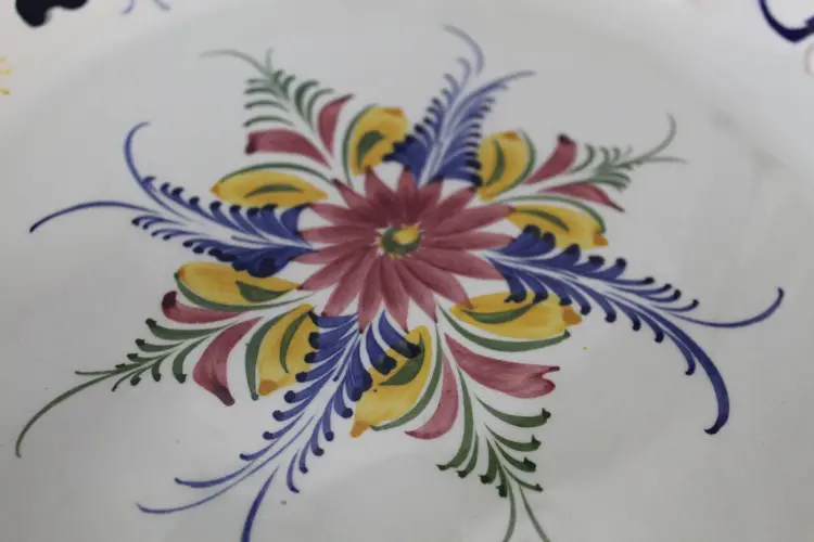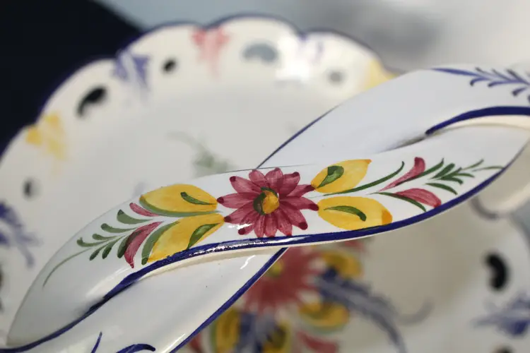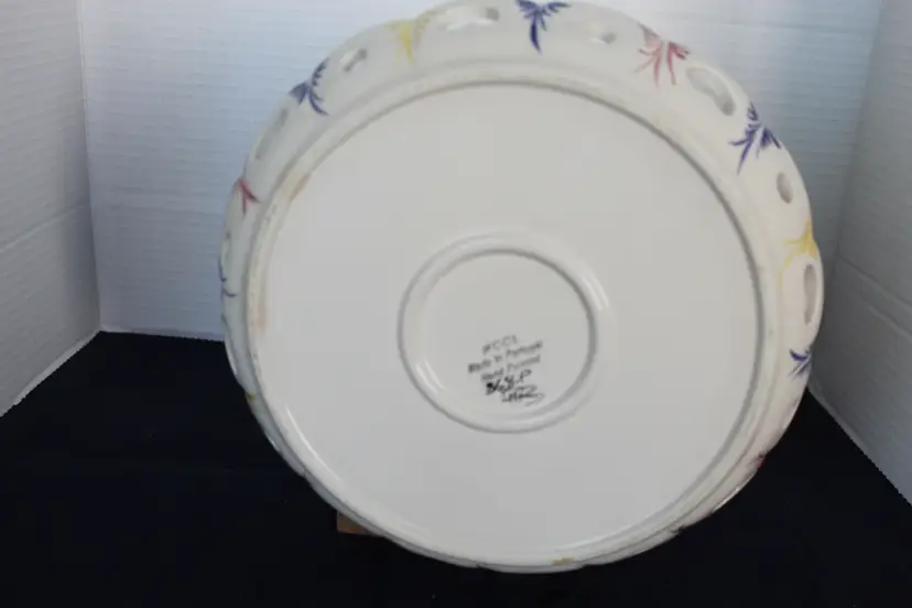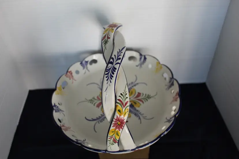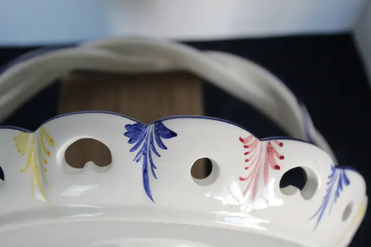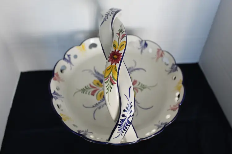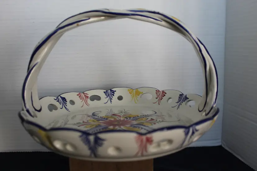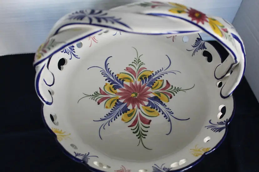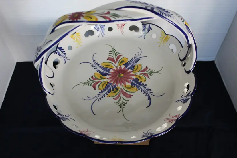 This RCCL handpainted ceramic basket, made in Portugal in 1980, features a beautiful floral pattern in multicolor. Measuring 9 inches in diameter and 6.25 inches in height, this medium-sized serving piece is signed by the RCCL brand and has a glossy finish. The French country style of this original piece makes it a suitable addition to any room for all occasions. Perfect for collectors of decorative sculptures and figurines from the late 20th century, this handpainted ceramic basket adds a touch of elegance and charm to any space. Signed as well this vintage piece is stunning. No chips or cracks. Comes from a smoke free home.