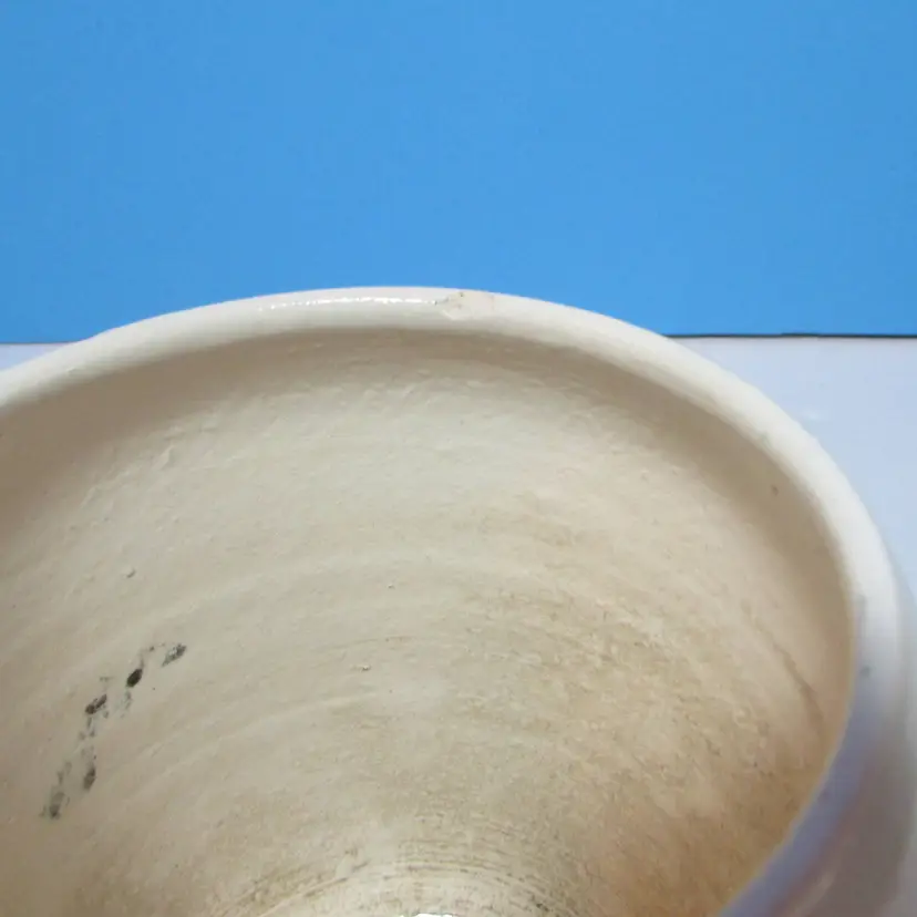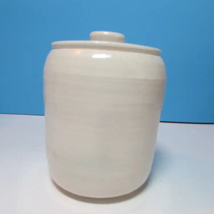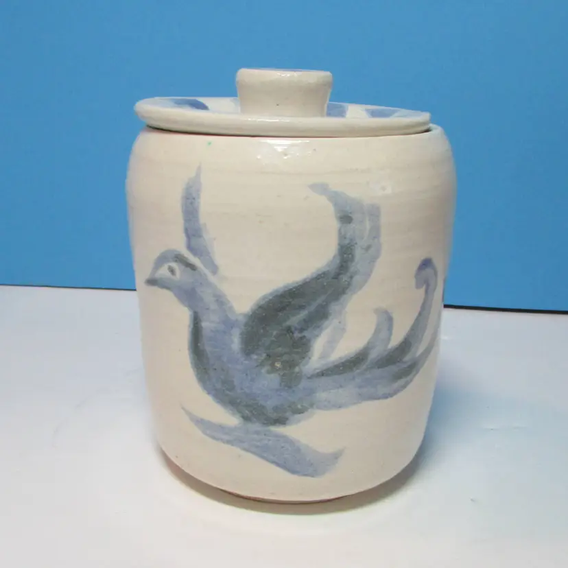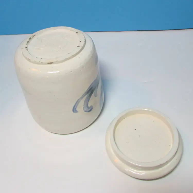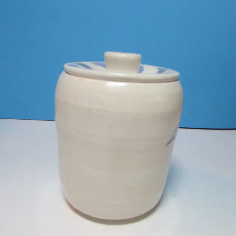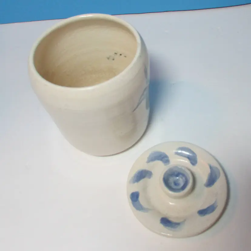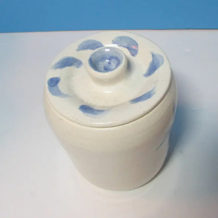 This lovely jar has a small chip on the rim, but still a lovely piece to use and display. It is about 4 1/2" or 5" with lid x 3 1/2" round. This is shipped from a smoke free home. Thanks for looking!