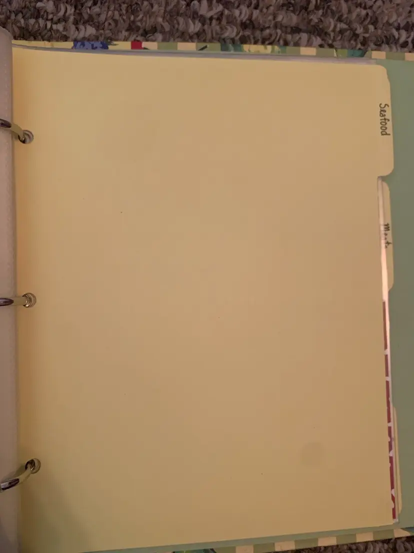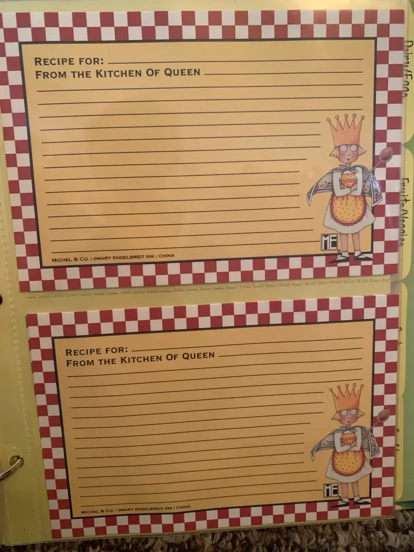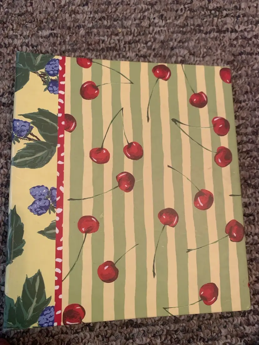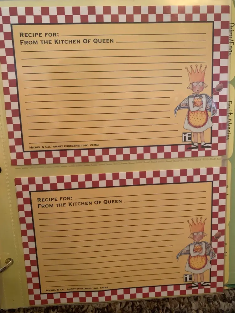 One card written on, the rest are blank. Dividers included along with two types of recipe cards (some Mary Engelbreit). Gorgeous colors and retro fruits. Recipe binder ready for use or alteration!!