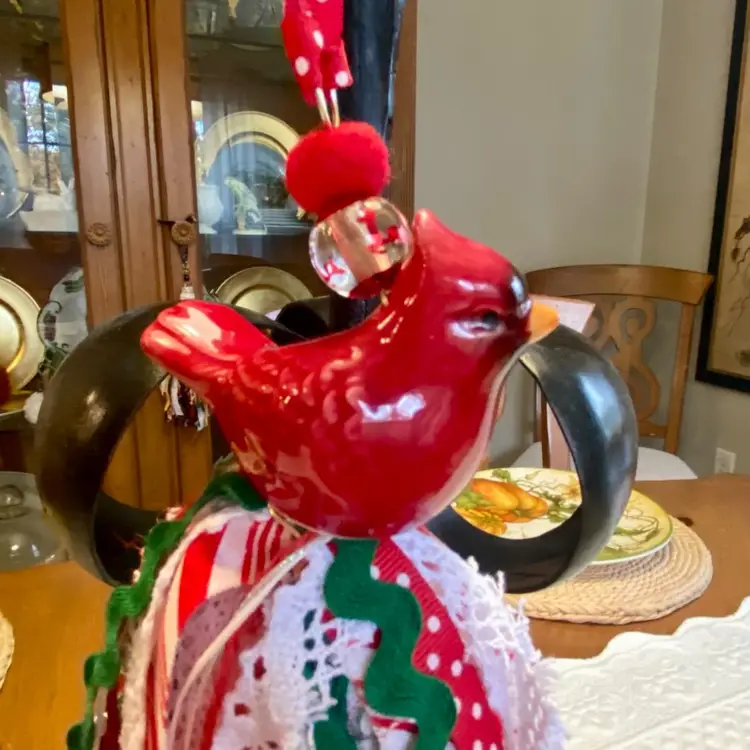 Upcycled ceramic salt shaker using fabric strips, ribbon, crochet trim and beads. Approx 16 inches
