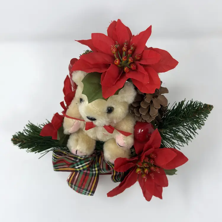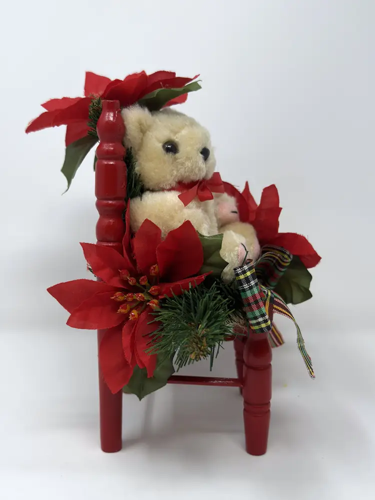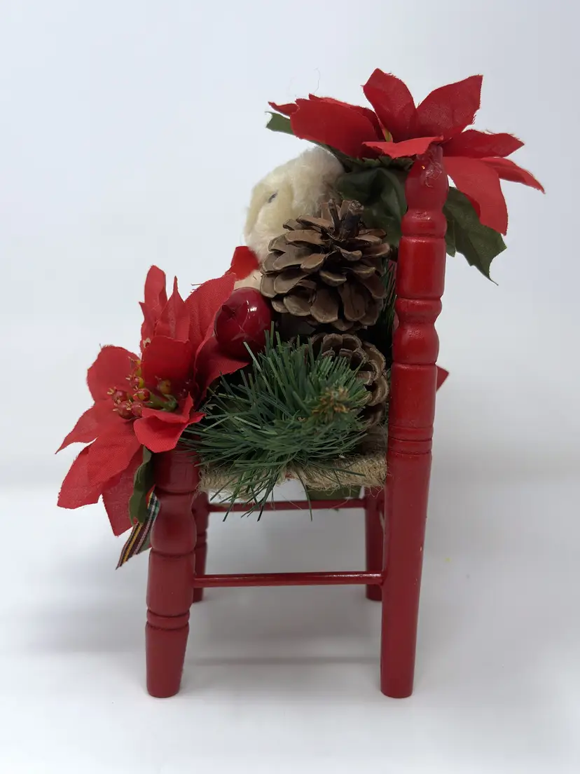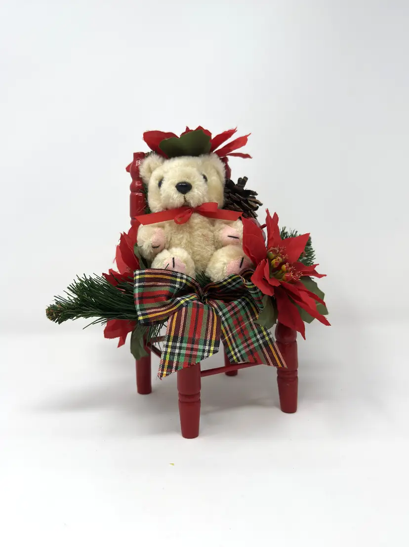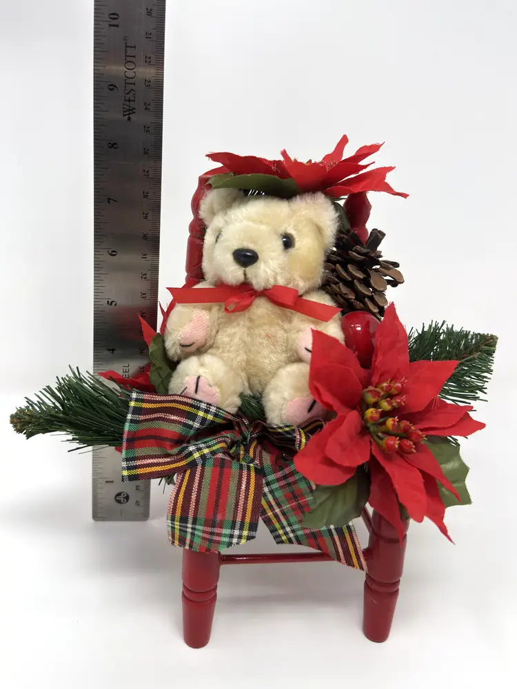 Bring cozy vintage holiday charm home with this whimsical Christmas bear display, set in a miniature red wooden chair with plaid ribbon, pinecones, faux greenery, and poinsettias. Measures 8.5” tall and perfect for cottage-style seasonal décor or a nostalgic winter vignette.
