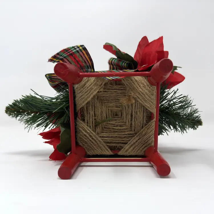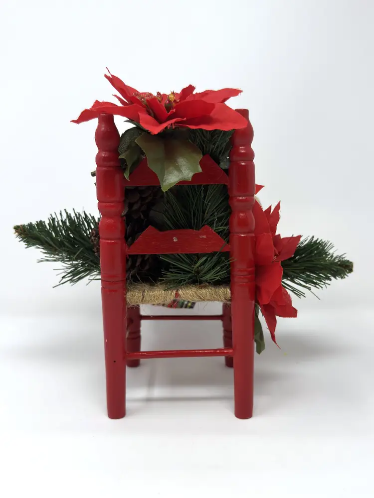 Details • Maker/Brand: Unmarked • Origin: Unknown (likely USA craft era production) • Date/Era: c.1988–1995 • Design Style: Country Cottage / Nostalgic Christmas / Handmade-style décor • Materials: Wood, fabric plush, faux greenery, ribbon, pinecones, floral accents, jute seating wrap • Colors: Red, green, tan, brown • Dimensions: approx. 8.5” H × 9” W × 6” D, Weight: approx. 4 oz • Condition: Minor wear to chair paint and ribbon from age; displays beautifully